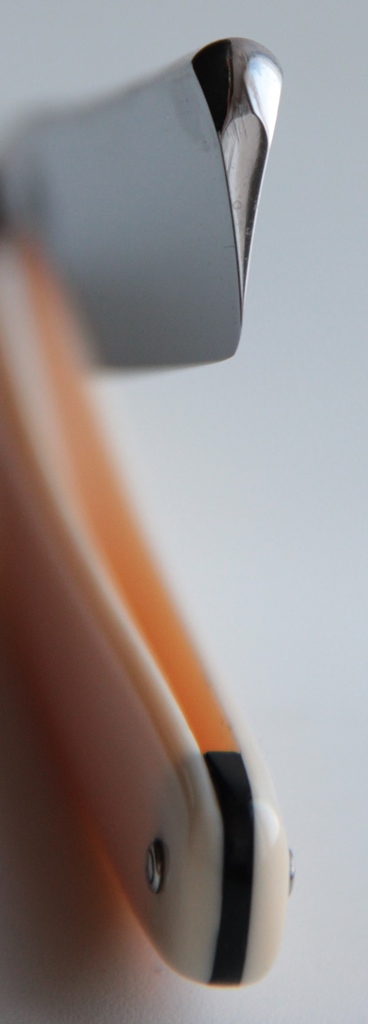 Очень красивый, укороченный клин, с достаточно редкими пропорциями. При такой ширине полотна, ширина обушка имеет достаточно неестественный размер-8 мм.У меня была однажды подобная бритва, на коробке которой была надпись, что бритва предназначена для жёсткой щетины. Думаю, что такой строй клинка и такой большой угол заточки предназначены именно для лучшей стойкости кромки. Также, форма лезвия предполагает бритьё , если класть плашмя бритву на личо, не настраивая угол.Не смотря на свою скромную длину, бритва тяжёлая. Идеальная геометрия полотна:кромочка равномерна по всей длине и еле заметна.В отличие от английских и французских полных клинов, японцы в плане геометрии были всегда на высоте-слесарка просто идеальна всегда.Бритву не рекомендую новичкам, по причине повышенной травмоопасности. Ошибок не прощает-сразу порез. Как выше сказал, бритва достаточно редка встречается, так что будет очень неплохим экземпляром в любой коллекции.Бритва не разбиралась и не реставрировалась. Всё родное. Полотно чистое, без каких либо дефектов. Лично протестирована на качество бритья. Бритьё чистое, без раздражения. Из за стали твёрдости средняя+, бритьё с элементами жёсткости присутствует. Это моё сугубо личное ощущение, так как имею кожу весьма чувствительную к бритвам средней+ твёрдости.После бритья бритва легко проходила тест на рез волоса(тонкий , некрашенный, женский) , без правки на ремне. Так что, кромка хорОшо держит заточку.Сталь качественная.. Не пропустите редкую и красивую бритву для своей коллекции!