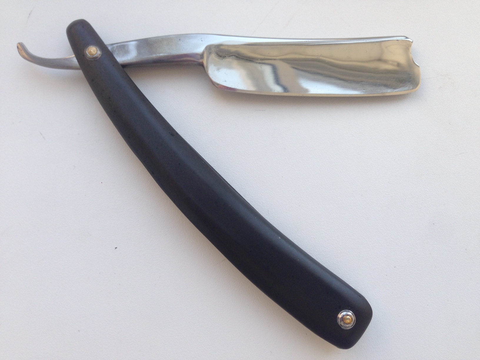Куплена тут на форуме у spez, он клялся и божился, что ручка рог буйвола, но судя по всему это все же пластик, хоть и выполнена достаточно добротно, шайбы родные с завода , стоят шайбочки между ручкой и лезвием в месте крепления. Год производства 1850 +- Состояние хорошее, старый добрый мягкий английский клин. Заточена так же у Морфиуса Цена ПРОДАНО