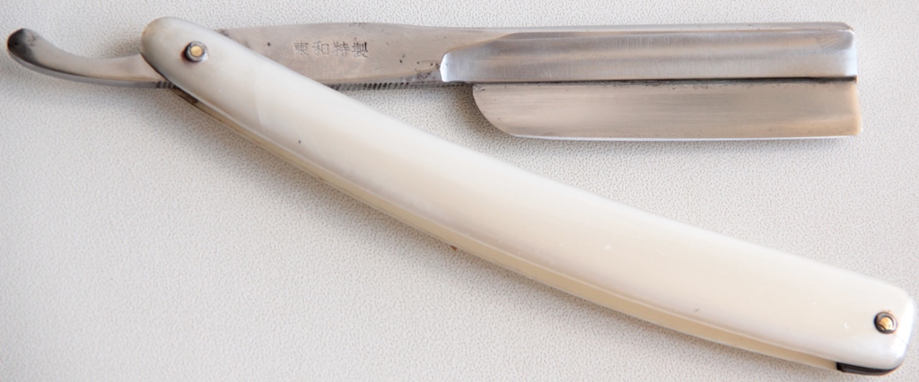 (登東和録 = nobori Tōwa-roku Ширина полотна-22 мм Толщина обушка-6.8 мм Форма лезвия-фреймбэк Углеродистая сталь. Середина 20-го столетия Бритва в прекрасном состоянии для своих лет, можно сказать, близкое к непользованному.. Не разбиралась и не ремонтировалась. С минимальными следами от заточных камней. Родная ширина полотна. Идеальная геометрия:кромочка равномерна по всей длине. Сталь и кромка чистые.Будет отличным , практичным и совершенно недорогим вариантом для опытного пользователя, желающего испробовать и такую форму лезвия в деле. Бритва будет заточена и подготовлена к бритью. цена-4300 р с доставкой ПРОДАН Spoiler Show