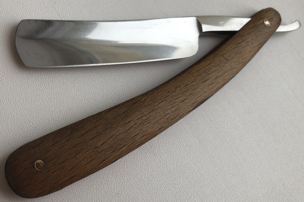 Как по мне, так очень красивая и практичная бритва. Тяжёлая,и удобная для пользования. Разобрал, немного освежил металл и снова собрал, поставив родные пины.Немного патины оставил на лицевой стороне клинка, чтобы не только оставить гравировку, но и сохранить оригинальный "налет старины"Идеальная геометрия полотна, сталь чистая, без дефектов.Бритва заточена и готова к бритью.Подойдет любому товарищу, интересующемуся бритьё клинковой бритвы:как новичку, так и опытному пользователю.