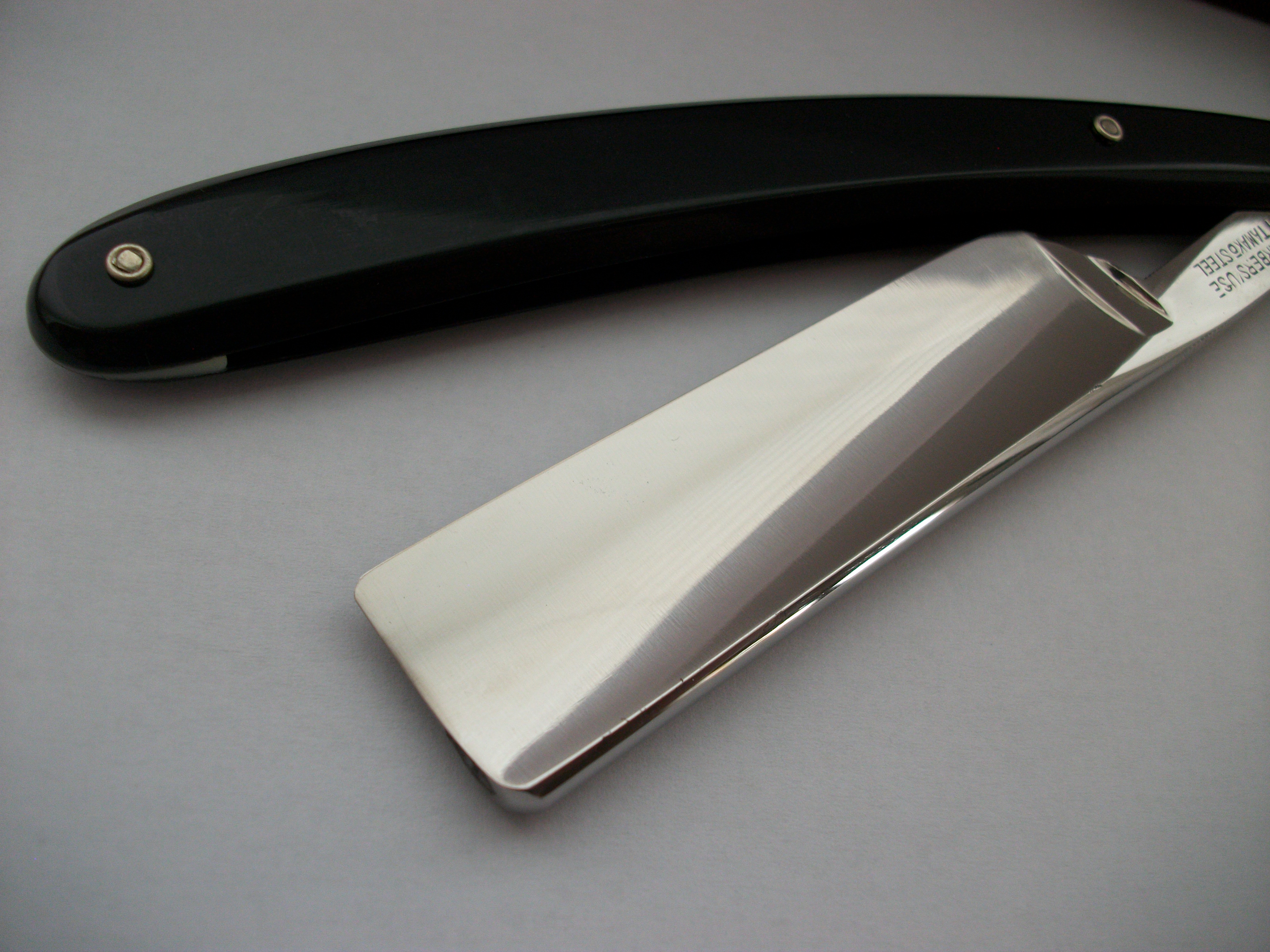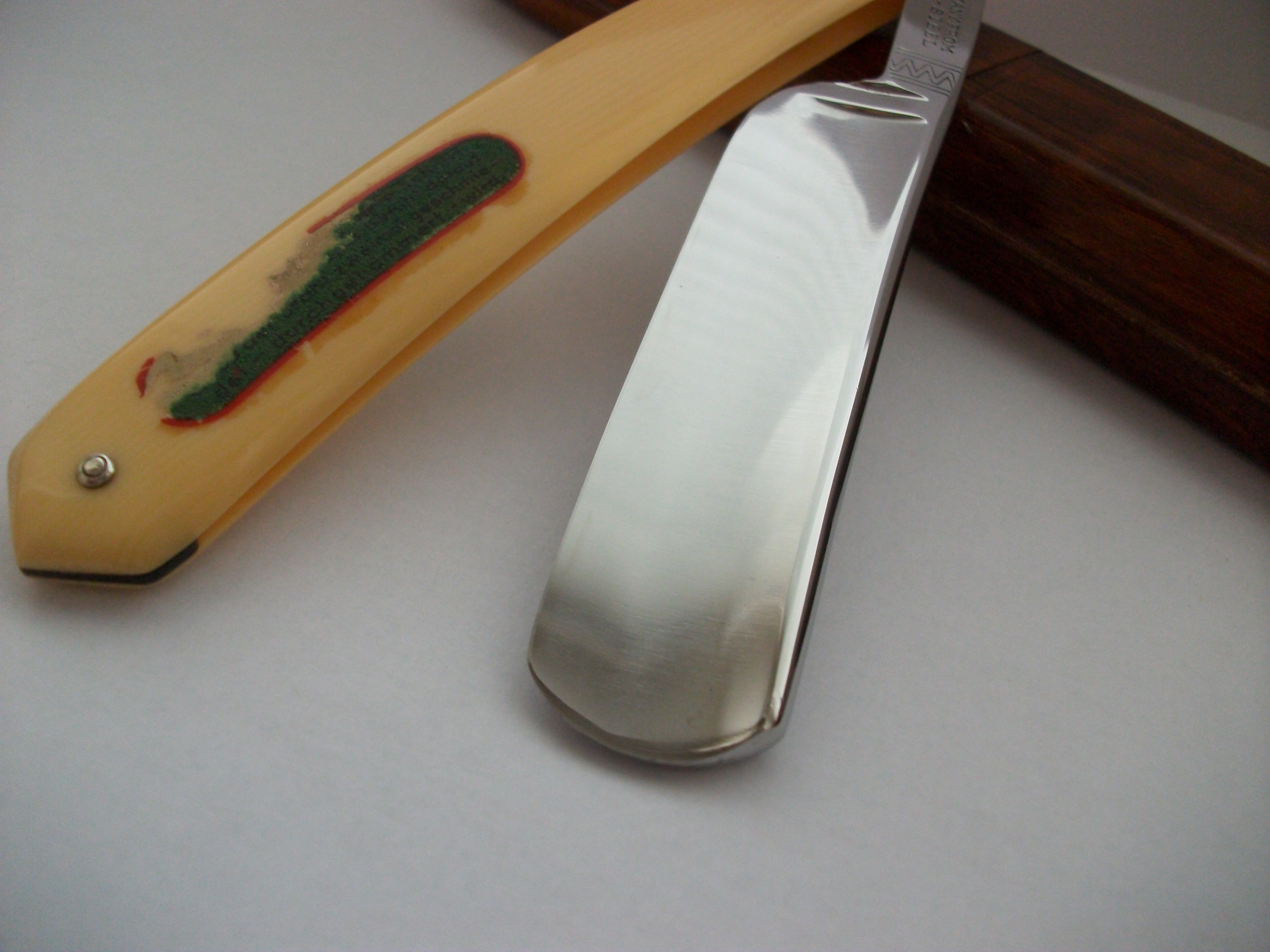 Экземпляр сочетающий такие несовместимые определения как Китай, качество, винтаж... Бритва имеет хорошую геометрию, углеродистая сталь, ширина полотна почти 21мм, длина режущей кромки 68мм, ручка пластик. Примерно 50-70 года ИМХО. Заточена и готова к бритью. Продано Spoiler Show