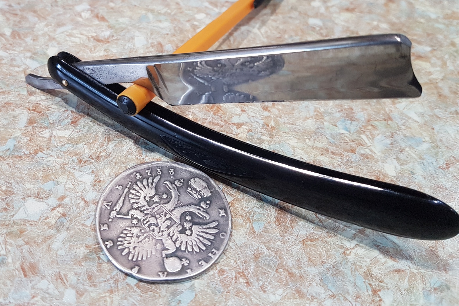 В домике. Ширина клинка 17 мм. У переднего пина незаметная, залеченная микротрещинка. Заточена и готова к работе. Бреет чисто и нежно. ПРОДАНО. Spoiler Show