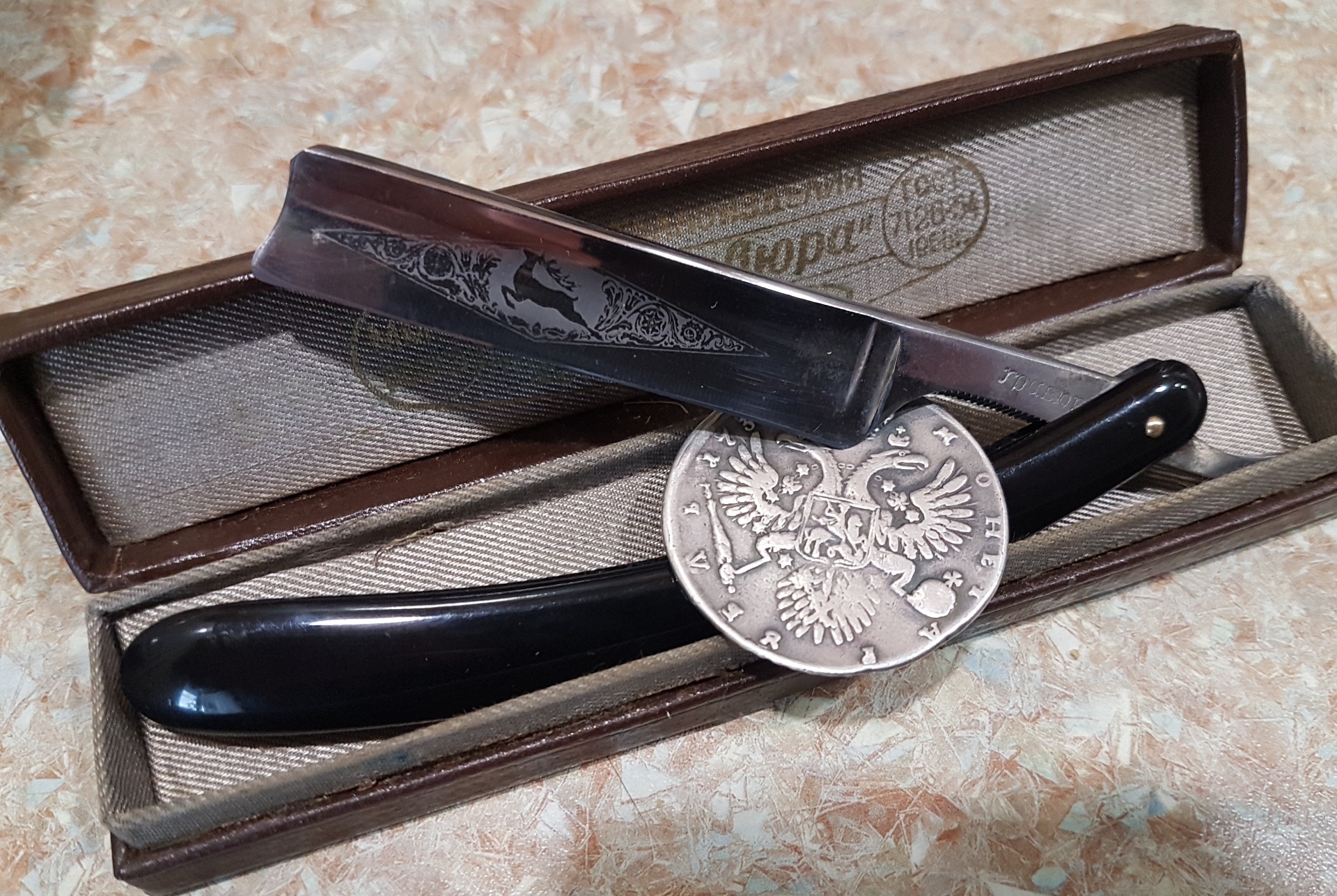 Произведен в середине, второй половине 19 века. Длина клинка 80 мм. Родная отправа. Комфортный рез. Бритва заточена . ПРОДАНО.