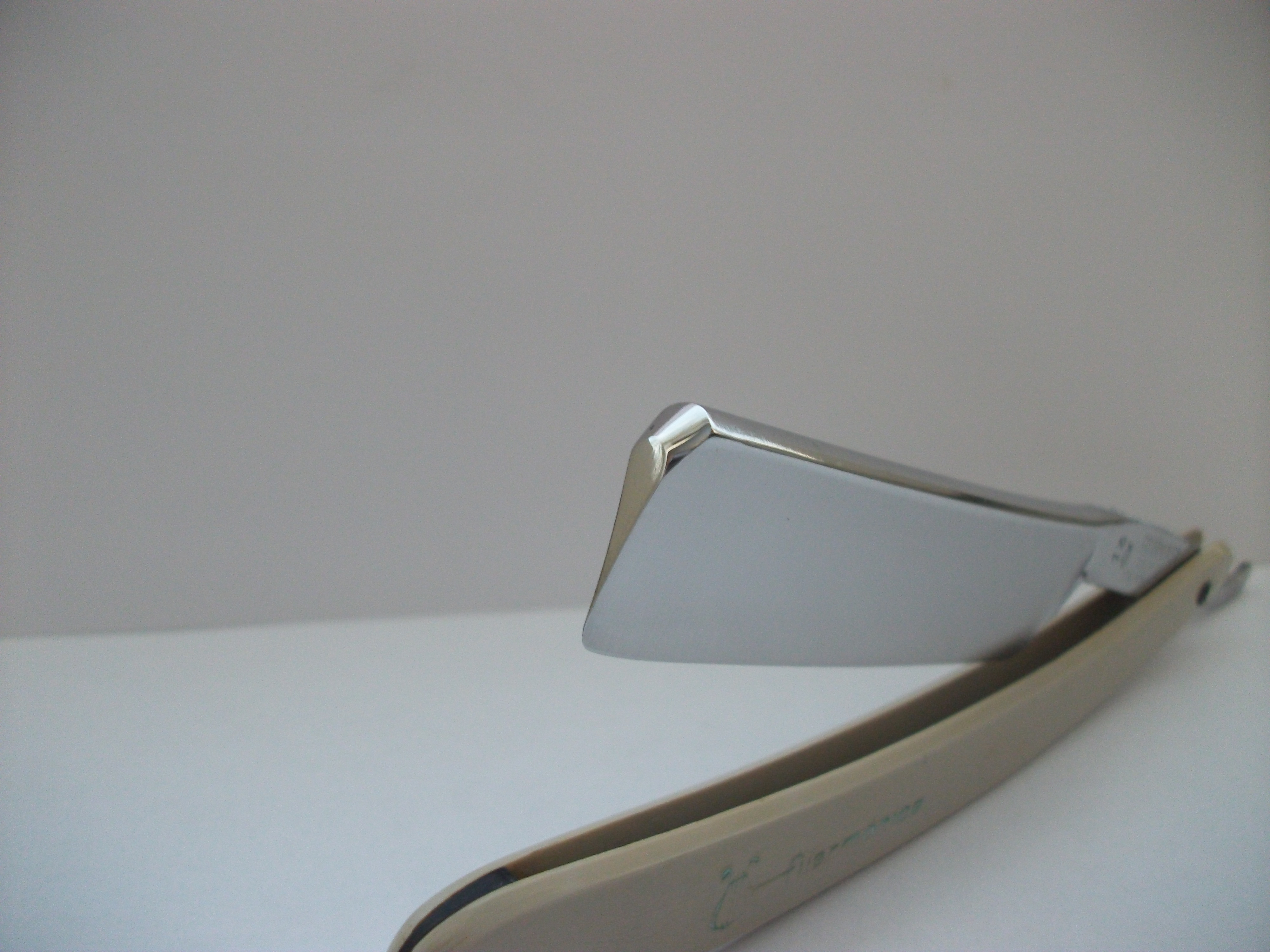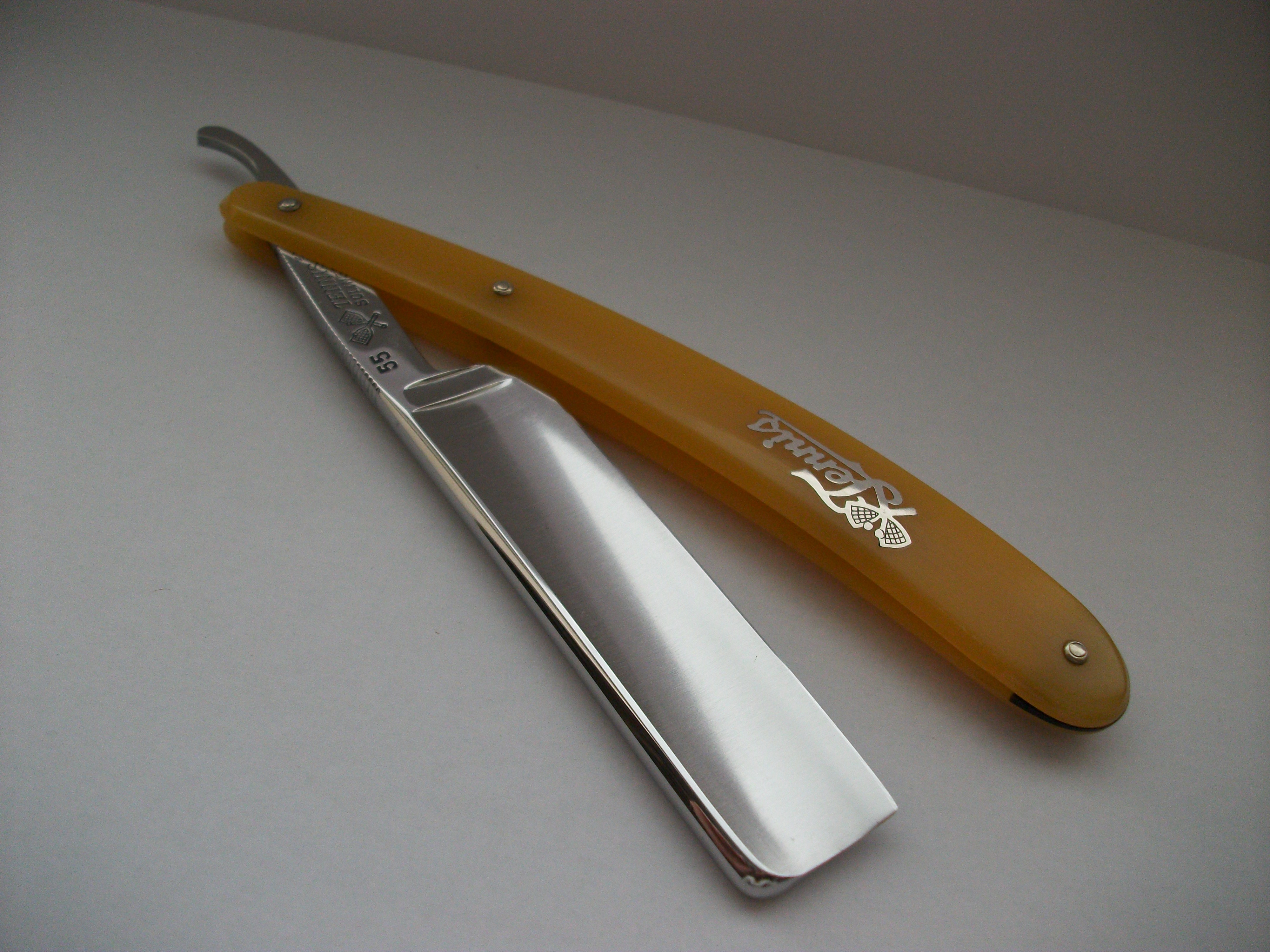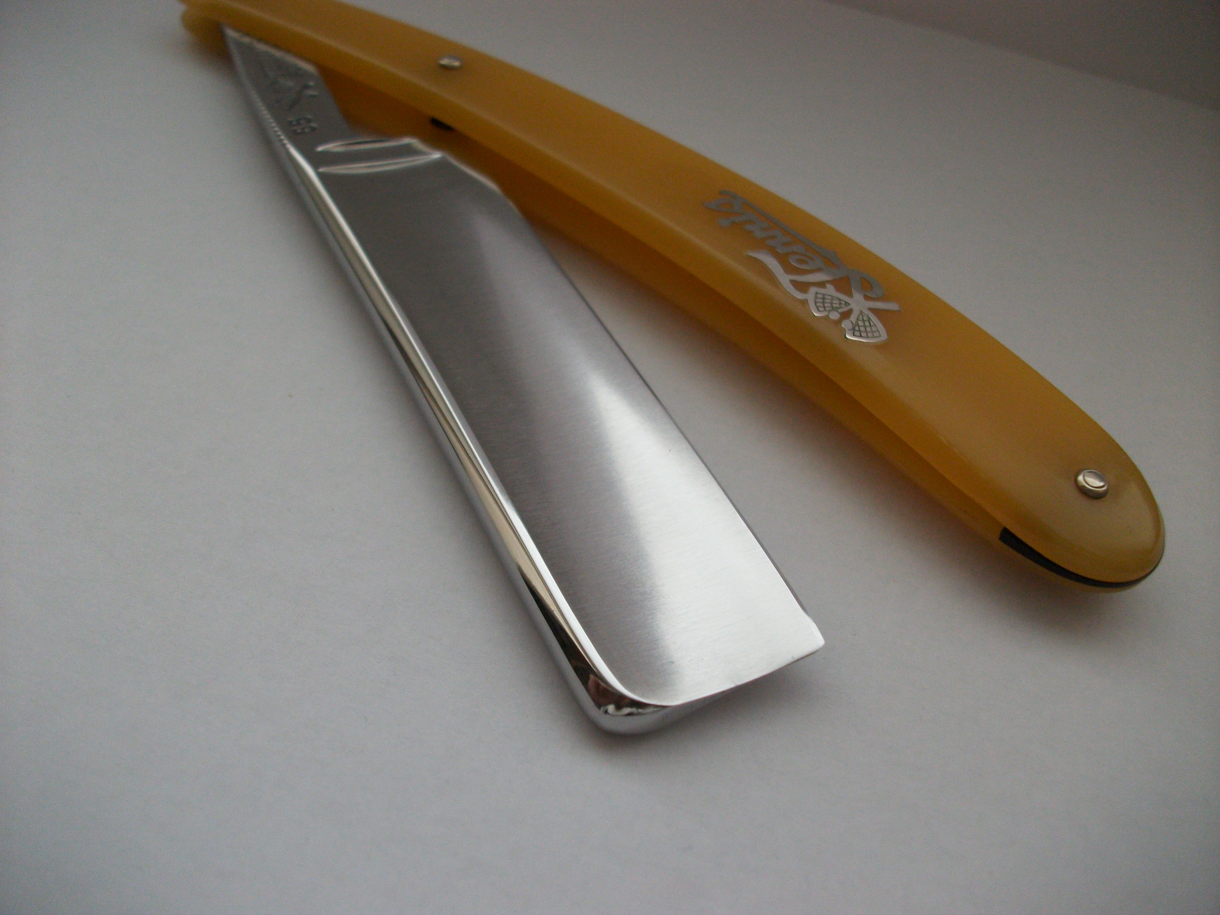 Достаточно редкий Японец Rosette с редким гриндом Belled Hollow и достаточно короткой кромкой в 56мм, лично я очень люблю бритвы с короткой РК. Ширина полотна 22мм, углеродистая сталь, ручка пластик. Хорошая родная геометрия.