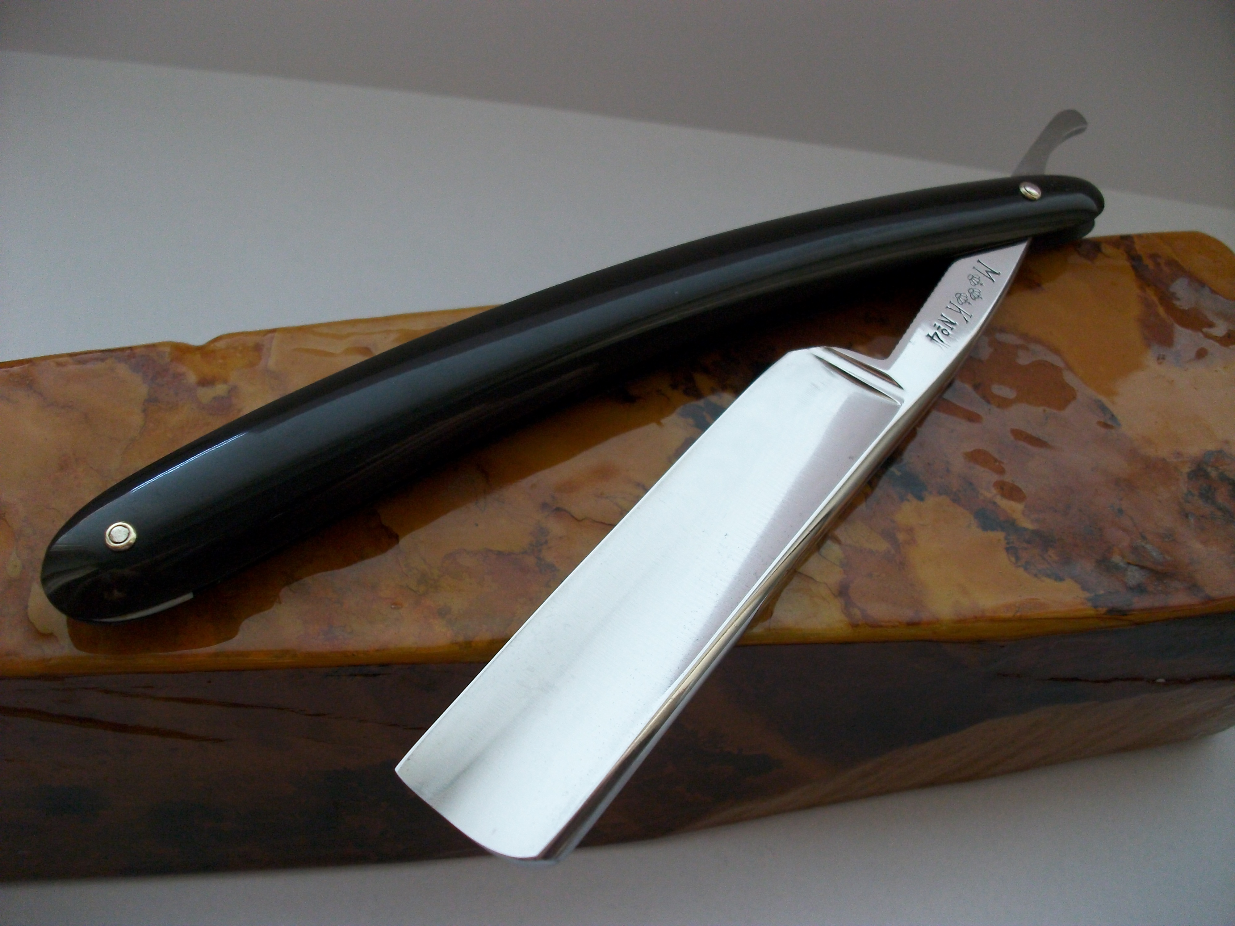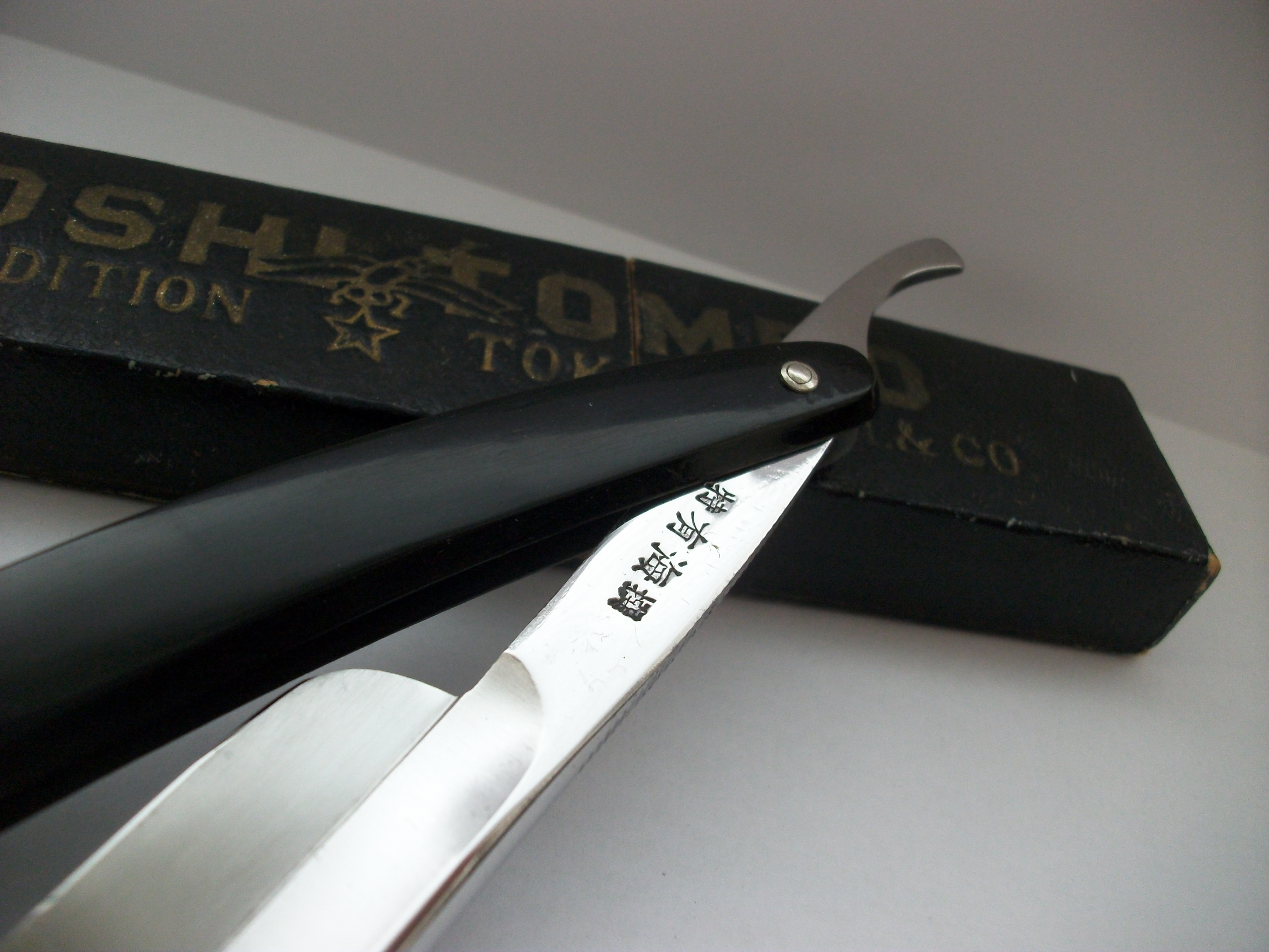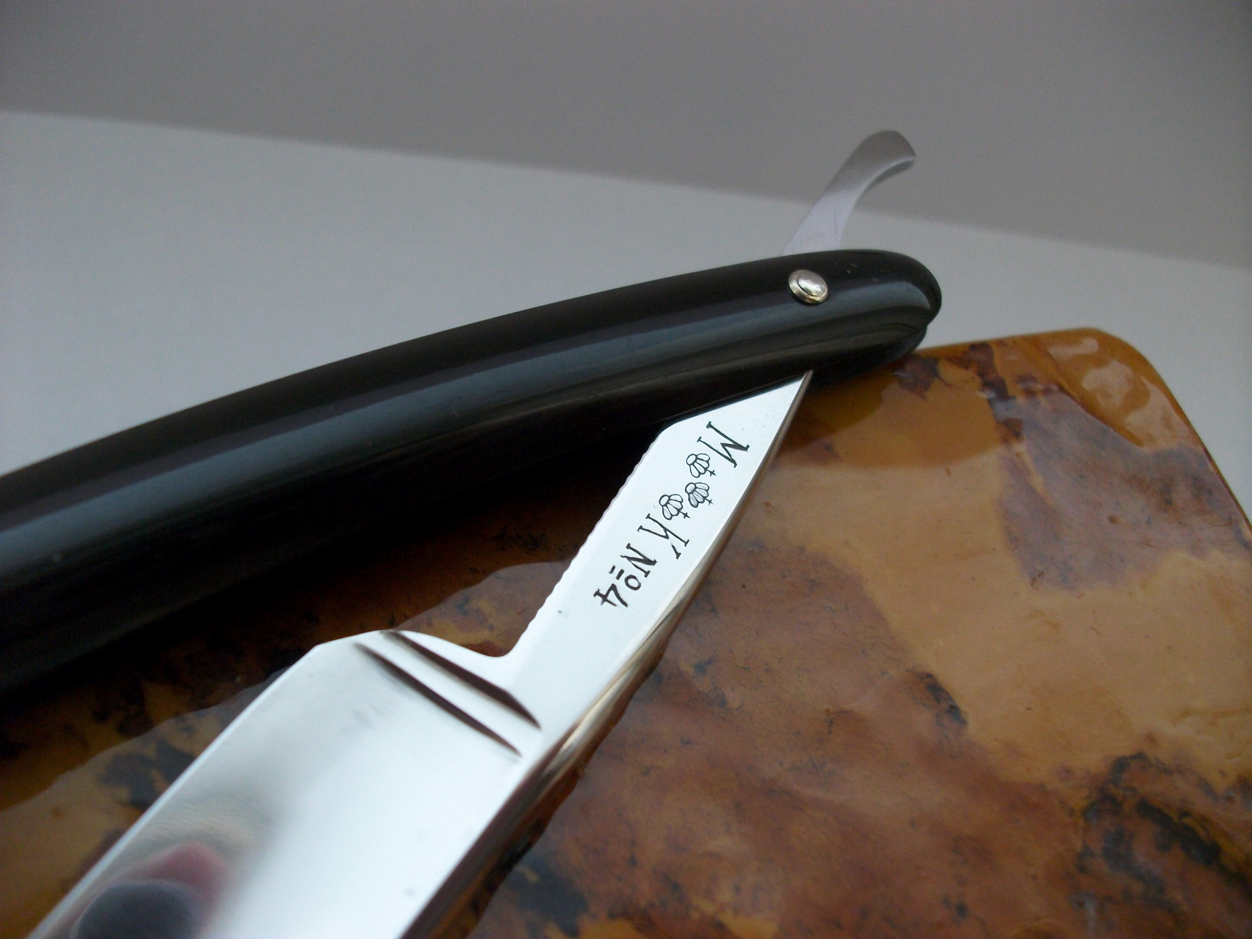 Бритва с длительного хранения (незначительные следы остались) и по моему мнению не была в использовании. Немного освежил и заточил. углеродистая сталь, ширина полотна 16мм, длина режущей кромки примерно 70 мм. В комплекте родной бокс.