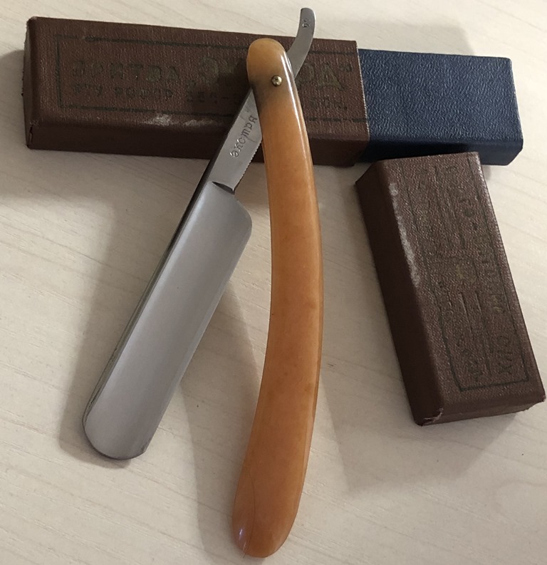 Бритва в пользовании не была, но пришлось немного освежить металл от патины. Родную оправу от времени повело в разные стороны, поэтому я решил ничего не выпрямлять , а поставил совсем уж старинную пластиковую ручку, от немца, начала 20-го столетия.Стальные родные пины удалось сохранить и заново поставить. Получилось весьма недурно, как мне кажется.Бритва тяжёлая,с отличной сталью. Брить будет очень даже неплохо. Заточена и готова к бритью.