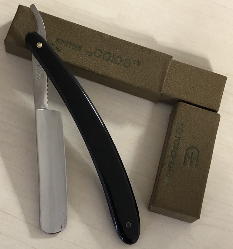Очень долго лежали у меня две бритвы,на которые я совершенно не обращал внимания, по причине того, что чисто интуитивно они мне не понравились, а визуально сталь клинков показалась мне какой то странной. Но, недавно решил ими заняться и, честно скажу, в этот раз опыт и интуиция меня подвели. Помимо того, что обе бритвы были совершенно непользованными,но со "следами времени", то и сталь прекрасно точилась, доводилась на тонких натуральных абразивах, естественно с прохождением всевозможных тестов. Но, самое главное, первое бритье превзошло все мои ожидания. (обычно, когда у меня есть вопросы и сомнения по поводу той или иной бритвы, то после заточки, на момент бритья, беру с собой ещё одну проверенную бритву,чтобы нормально завершить процесс и не мучить себя некачественным бритьём).Бритье показалось близкое к эталонному, без каких либо неудобств, раздражений и прочих неприятных ощущений. К тому же, сама бритва имеет средний размер и по многим показателям идеально подойдет для новичка,ну а для опытного товарища вообще говорить не приходится. Так как первая бритва так и не дошла до моей темы продаж и была сразу продана, то представлю второй экземпляр.
