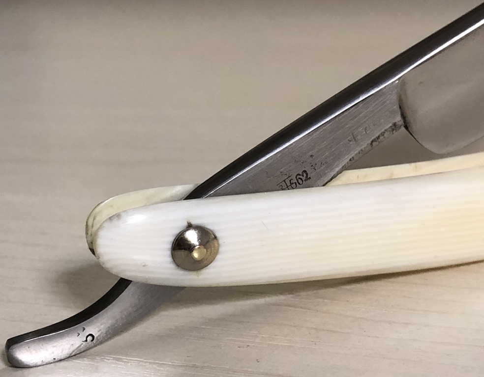 Бритва в очень хорошем состоянии для своих лет. Полотно имеет незначительные следы пользования, а также имеет оригинальную шлифовку.Гравировка четкая, без потертостей. Немного полирнул потом клинок, для порядка. Бритва была разобрана и немного почищен район осевого пина от всякого рода"следов времени".При сборке был установлен "родной"пин и внутренние шайбы.Идеальная геометрия:кромочка равномерна по всей длине и еле заметна.Тяжёлая, за счет своего толстого обушка. Красивая, практичная, с отличной сталью бритва будет очень хорошим вариантом ,на все времена .Заточена и готова к бритью.