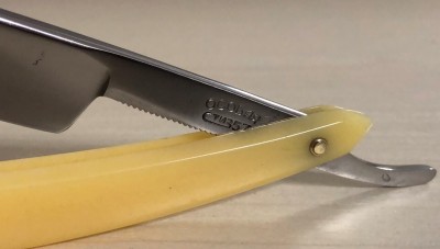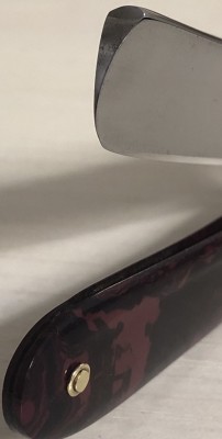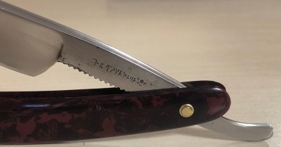 Ширина полотна-17.5 мм Толщина обушка-4.5 мм Полная вогнутость. Углеродистая сталь. Эти бритвы ещё можно где то раскопать, но очень редко встречаются в непользованном и в состоянии близком к идеальному.Данная бритва не была в пользовании,но пришлось разобрать и почистить немного в районе осевого пина. Оригинальная шлифовка полотна, без вмешательства. Если не брать несколько незначительных "точек времени" на клинке(которые нарочно не стал убирать, чтобы сохранить аутентичность полотна), состояние полотна идеальное, без каких либо видимых дефектов.Пины удалось поставить родные, которые и были.Идеальная геометрия клинка:кромочка равномерна по всей длине и практически незаметна.Изображение моста четкое, без потертостей.По своей форме лезвия и размерам очень хорошо пойдет не только в коллекцию, но и для новичка.Заточена и готова к бритью. Цена-4300 р с доставкой. ПРОДАН Внимание! Важная информация! Spoiler Show