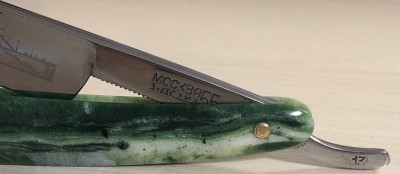 Ширина полотна-16 мм Толщина обушка-4 мм Форма лезвия-1/2 клина. Углеродистая сталь. Год производства-1939 г. Бритва в хорошем состоянии. Разобрал, почистил клинок и снова собрал. Немного рытвинок оставил в районе эрля, чтобы не стирать клеймо, но смотрится так даже более натурально, для бритвы, которая пережила войну.Ручка с большой долей вероятности родная, имела изначально пины шляпкой, какие ставились изначально на эти бритвы.Пины, естественно поменял, поставив немецкие втулки, с добавлением внутренних шайб. По всей видимости бритвой пользовались мало, так как совершенно не стерт обушок,да и геометрия полотна идеальная:кромочка равномерна по всей длине.Я видел несколько оригинальных "МОСШТАМПОВ",с родной полировкой в"зеркало", поэтому и эту бритву полировал немного больше, чем обычно бритвы других советских марок. В общем и целом бритовка очень приятная получилась и вполне будет годна не только для пополнения коллекции, но и для бритья.Заточена и готова к бритью. Цена-3800 р с доставкой. ПРОДАН Spoiler Show Spoiler Show