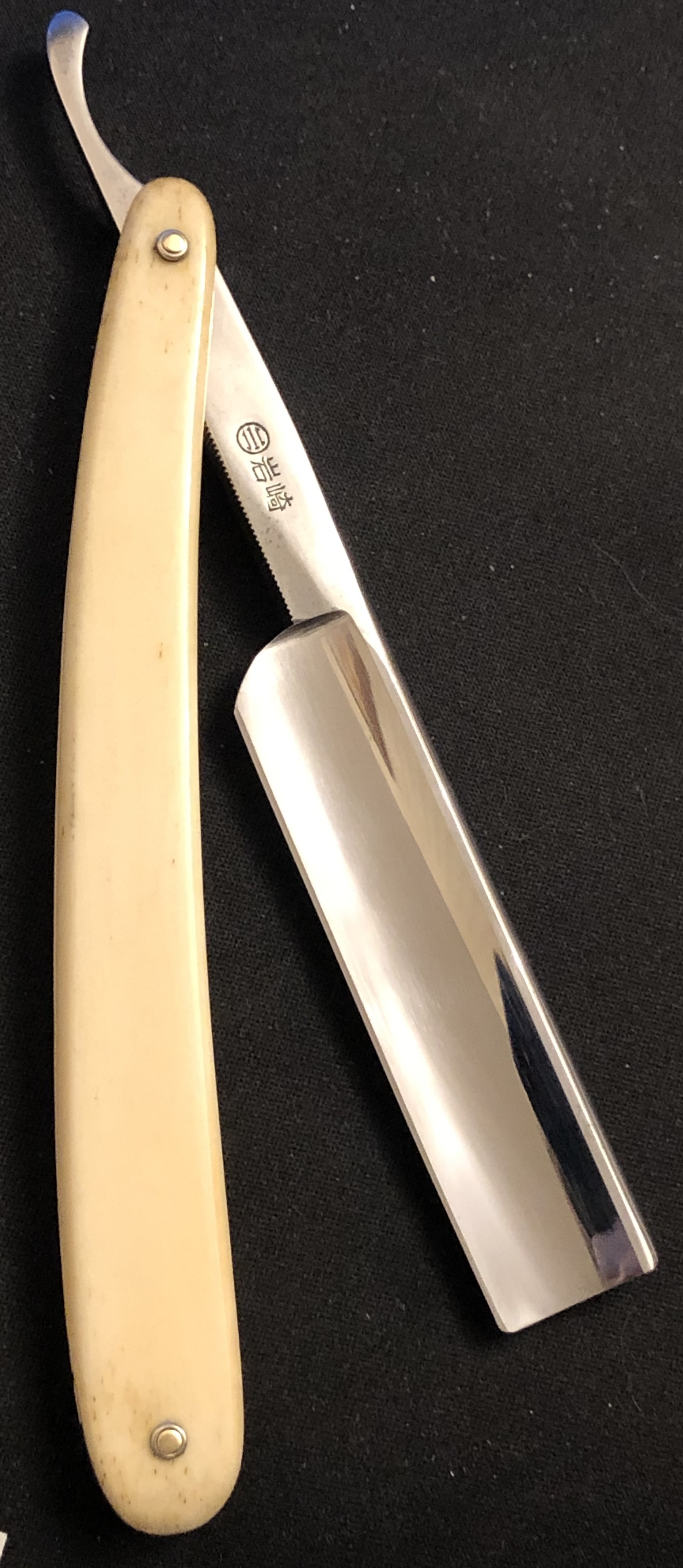 Изюминкой в компоновке данного раритета стал сюртук , пошива конца 19-го,начала 20-го веков.Имеется ввиду ручка из натуральной кости, от старинного донора. Оправа мощная, крепкая, тяжёлая, в идеальном состоянии.Пины удалось заново поставить оригинальные, от Ивасаки.Клинок в прекрасном состоянии,без видимых дефектов. Идеальная геометрия полотна:кромочка равномерна по всей длине.Сталь звонкая, отличного качества. По всем параметрам твердая, больше подошла бы для жёсткой щетины, но и для опытного пользователя будет очень неплоха. В общем и целом я доволен своей работой. На мой взгляд, отличная вещь для повседневного бритья.Заточена и готова к бритью.