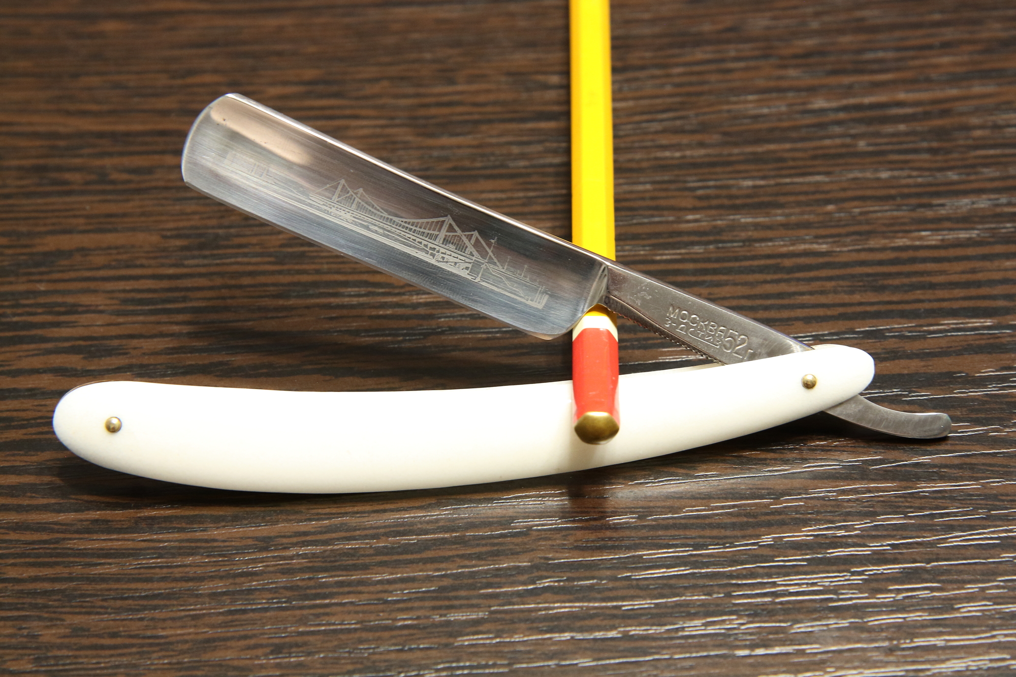 Опасная бритва Москва, завод СТИЗ, 1952 год. Гравюра на полотне "Крымский мост". Ширина полотна 18 мм, все родное, футляр-сундучок. Пришла в отличном виде и с заводской заточкой, чуть прошелся тряпочкой с пастой с сохранением гравюры и заточил. Подготовлена мной к бритью. Красивая бритва конца сталинского периода с приятной белой ручкой (Москва белокаменная), характерной для 52 года. Подойдет для не жесткой щетины, особенность стали, садится на жесткой (в моем случае). Цена - руб.