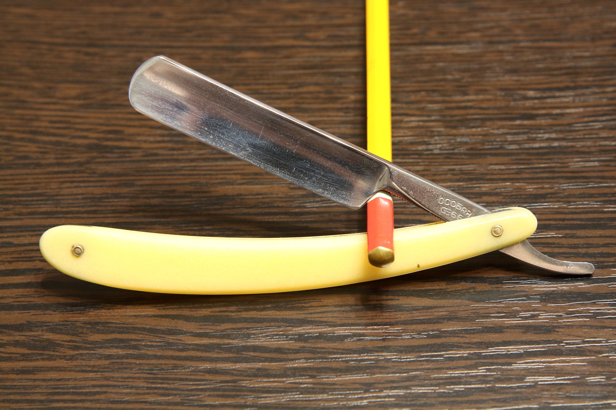 Опасная бритва Парикмахерская №1, завод ЗТВ (Вача), 1959 год. Ширина полотна 17.5 мм у пятки и до 16.7 у носа, все родное, футляр тоже. Пришла с некоторыми следами, бритву вручную почистил и заточил. Подготовлена мной к бритью. Модель Парикмахерская встречается очень редко, т.к. в свободной продаже их не было, поставлялись только в цирюльни. Сталь твердая, бреет несколько дубовато, но хорошо держит кромку. Цена 2700 руб. К бритве рекомендую приобрести ремень для правки опасных бритв моего изготовления из итальянской кожи (подробнее на странице 4, объявления 56-58 и странице 9, объявления 127). Spoiler Show