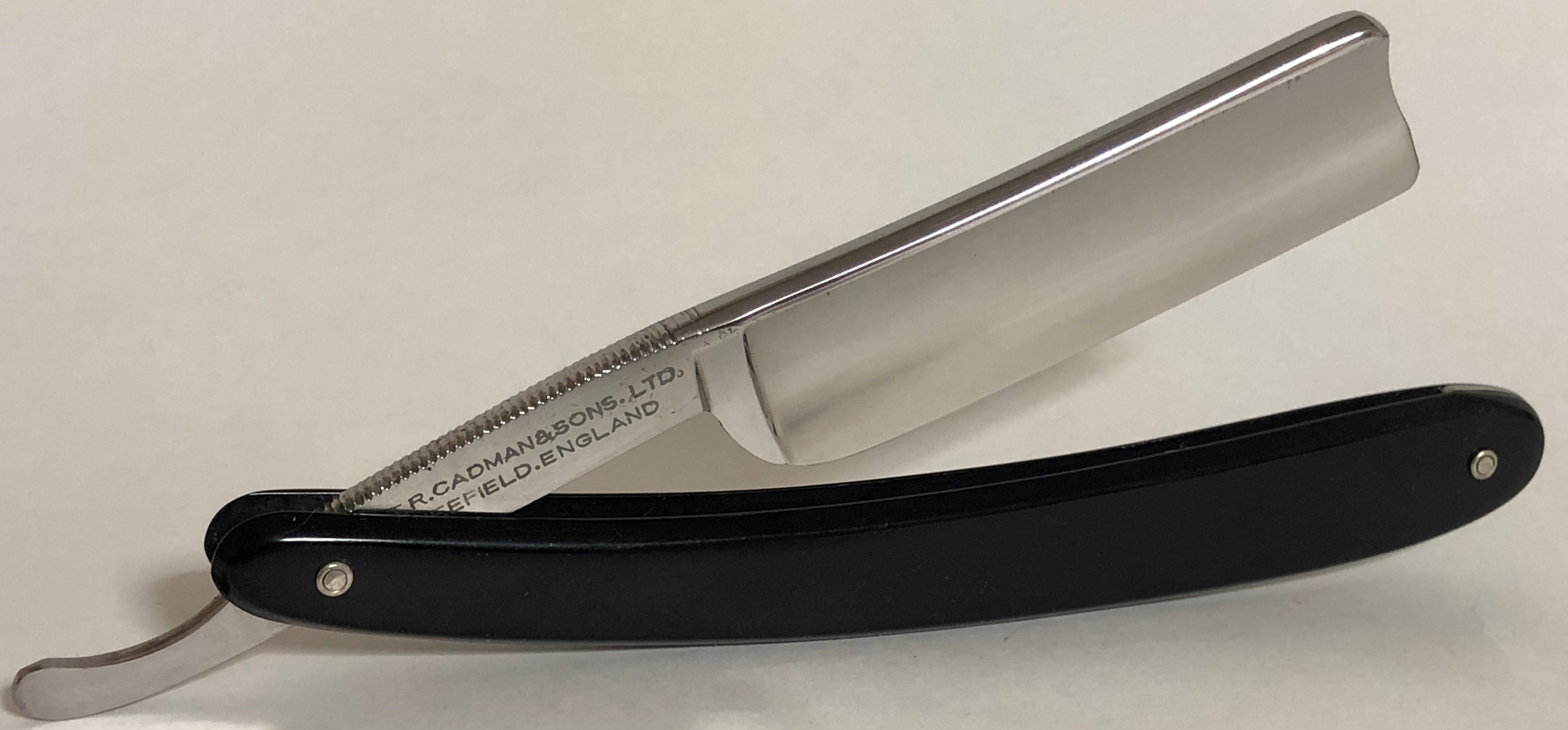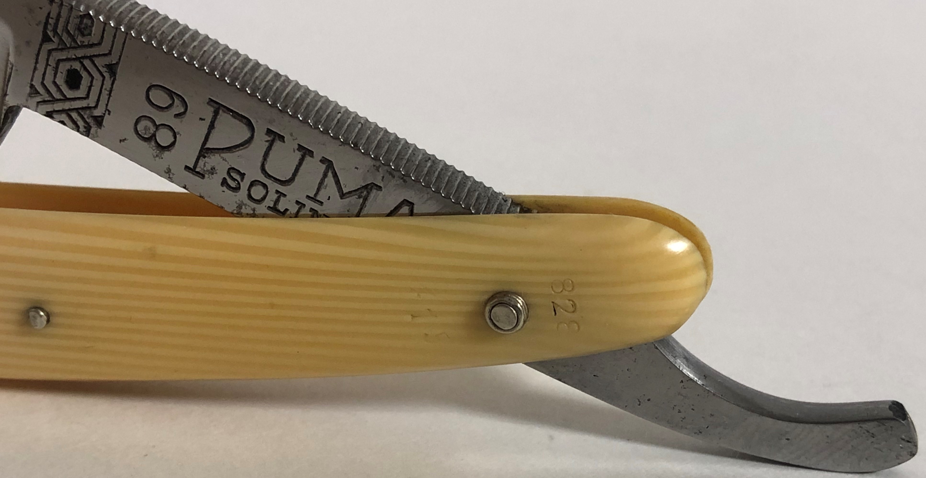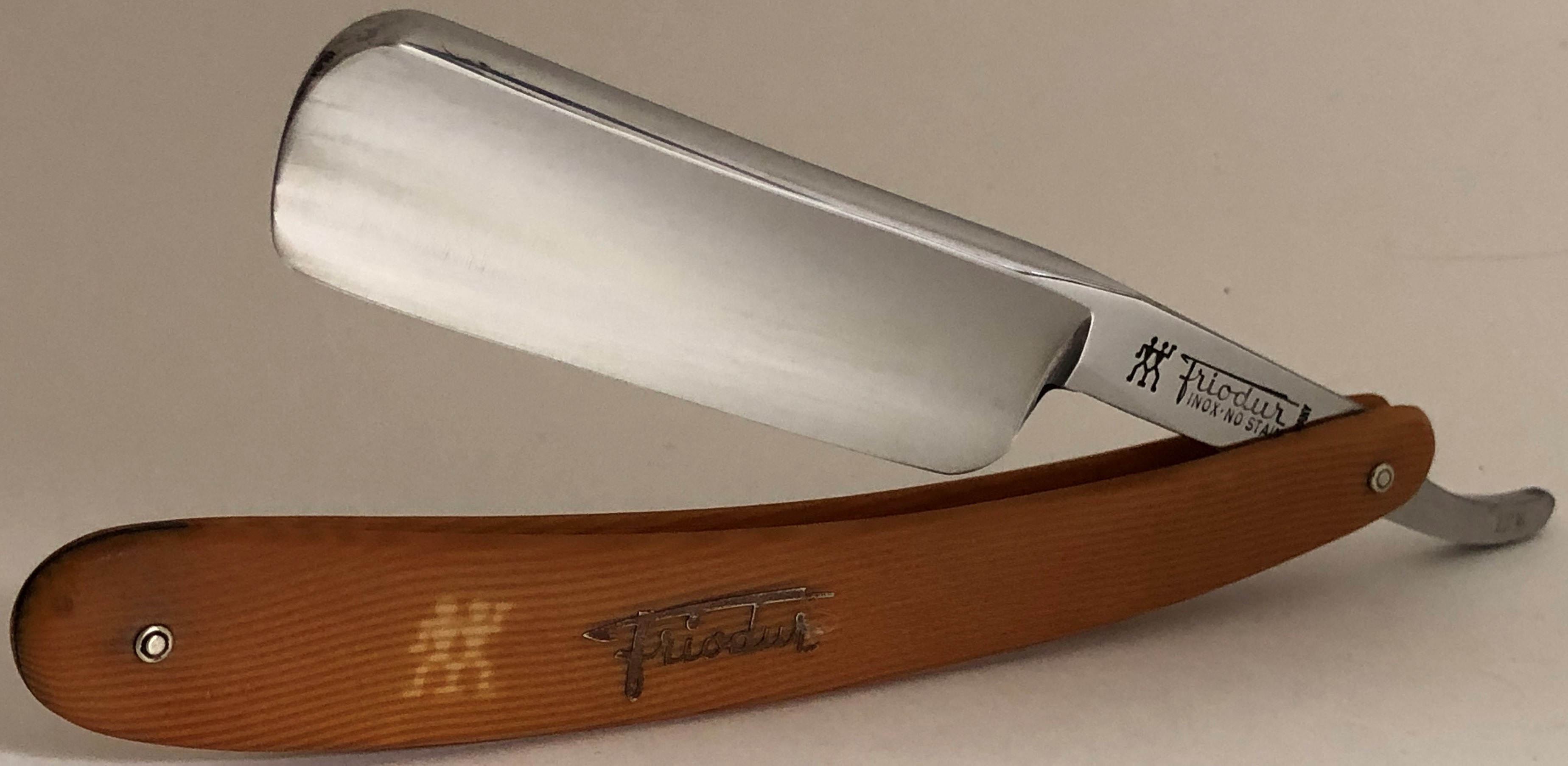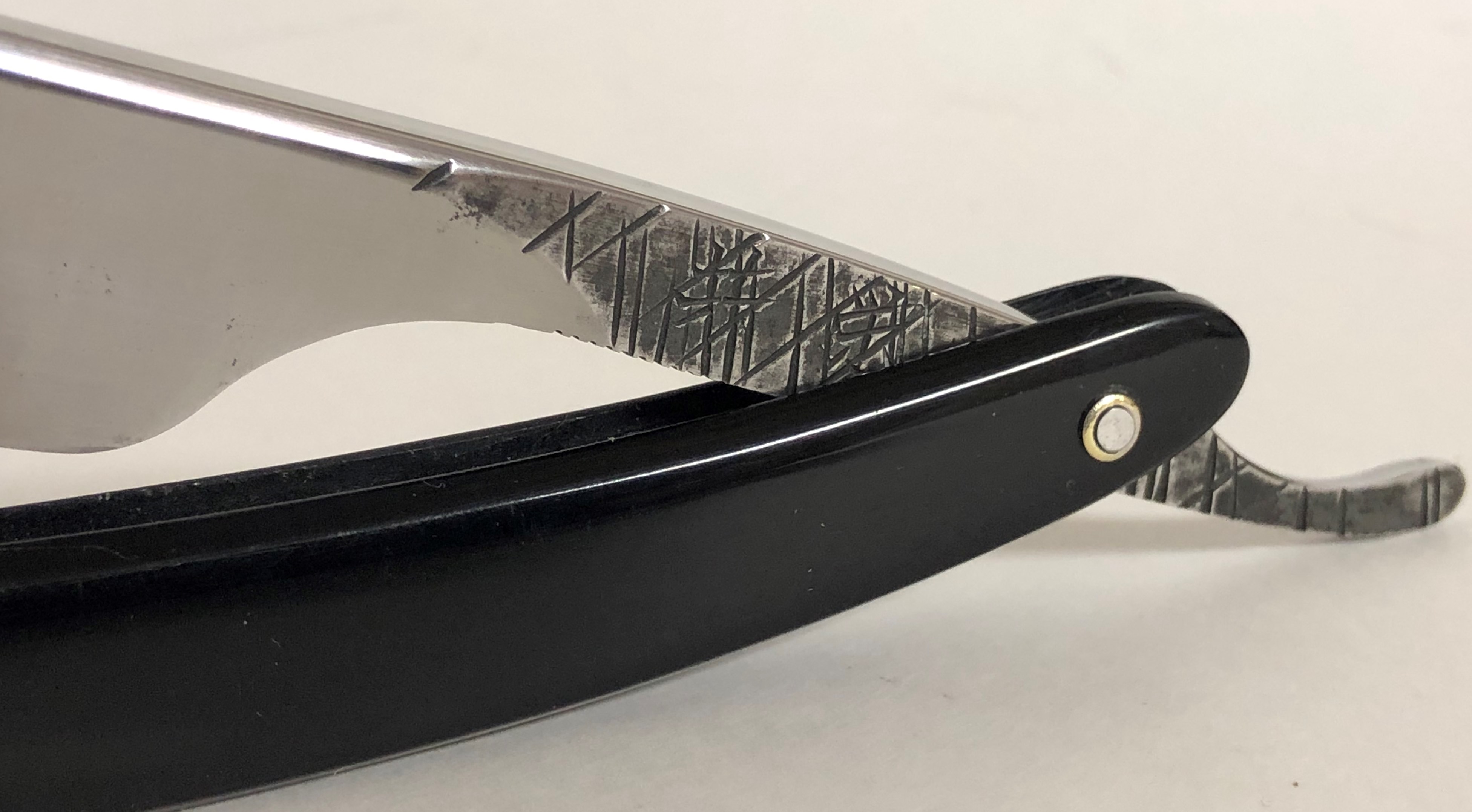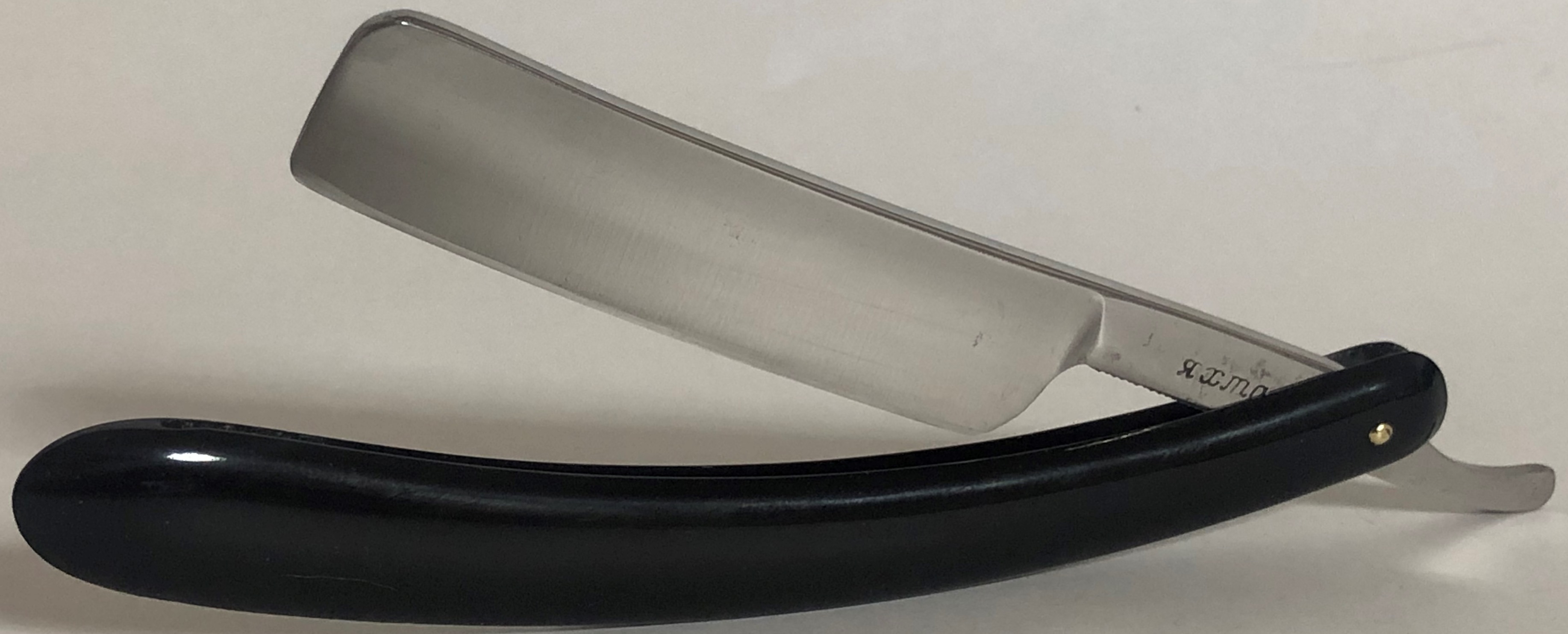 Следов пользования не заметил. Обушок находился в первозданном виде, без следов абразива.Но, пришлось разобрать, немного почистить металл от остатков патины и других дефектов и заново собрать, поставив нормальные втулки, с добавлением внутренних шайб.При шлифовке грани и переходы на "ступеньку" были соблюдены и не зализаны.Если несколько "точек времени" и осталось,но практически незаметны , если смотреть в натуре и не представляют никакого вреда в будущем.Идеальная геометрия клинка:кромочка равномерна по всей длине и еле заметна.Коробочка неоригинальная.Бритва заточена и готова к бритью.
