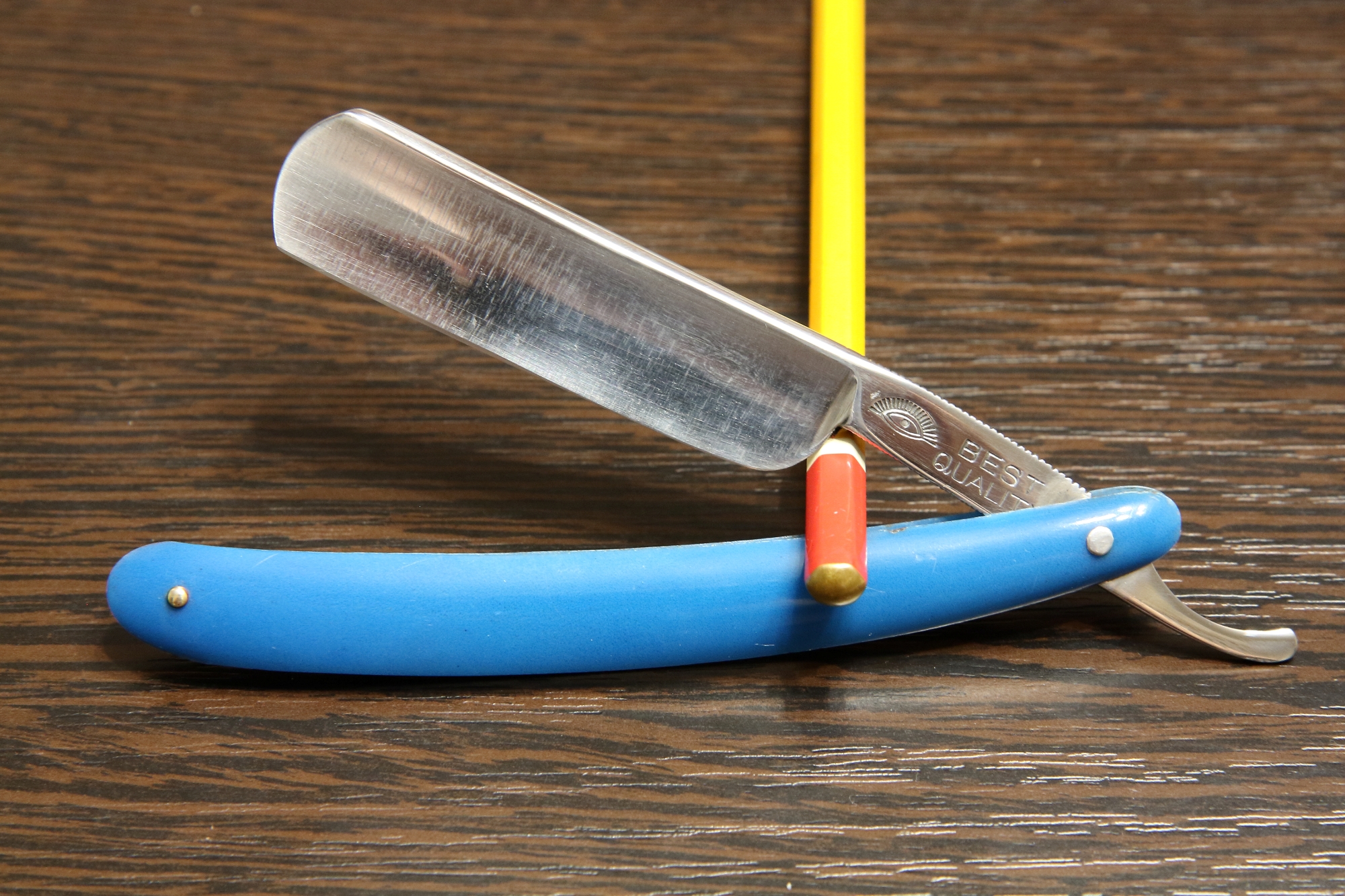 Опасная бритва Chian Vai Sin Co Best quality, сделана в Китае в г. Шанхай, ширина полотна 22 мм, все родное. Ко мне попала с заводской заточкой и довольно грубой заводской же шлифовкой полотна. Прошелся немного пастами вручную, продезинфицировал и подготовил к бритью. Это винтажный Китай, сталь по качеству сравнима с их же Double Arrow, т.е. никакого сравнения с их новоделами. Интересная ручка из синего пластика, футляр был несколько ободран - закрасил эти места. Сталь интересная, как то по особенному звучит, но требует ухода, если вовремя не протереть, довольно быстро образуются потемнения. Бреет сравнимо с хорошими немцами, но со своей изюминкой. Цена - руб. К бритве рекомендую приобрести ремень для правки опасных бритв моего изготовления из итальянской кожи (подробнее на странице 4, объявления 56-58 и странице 9, объявления 127). Spoiler Show