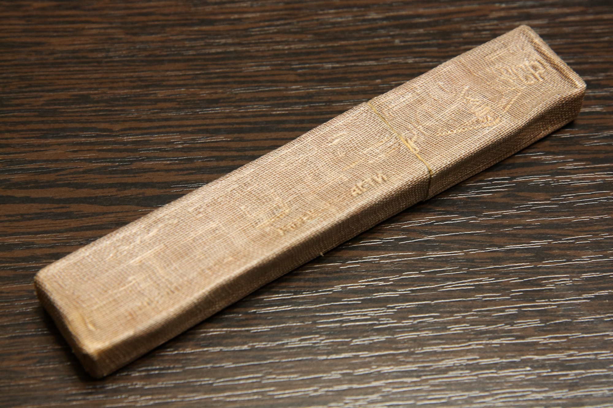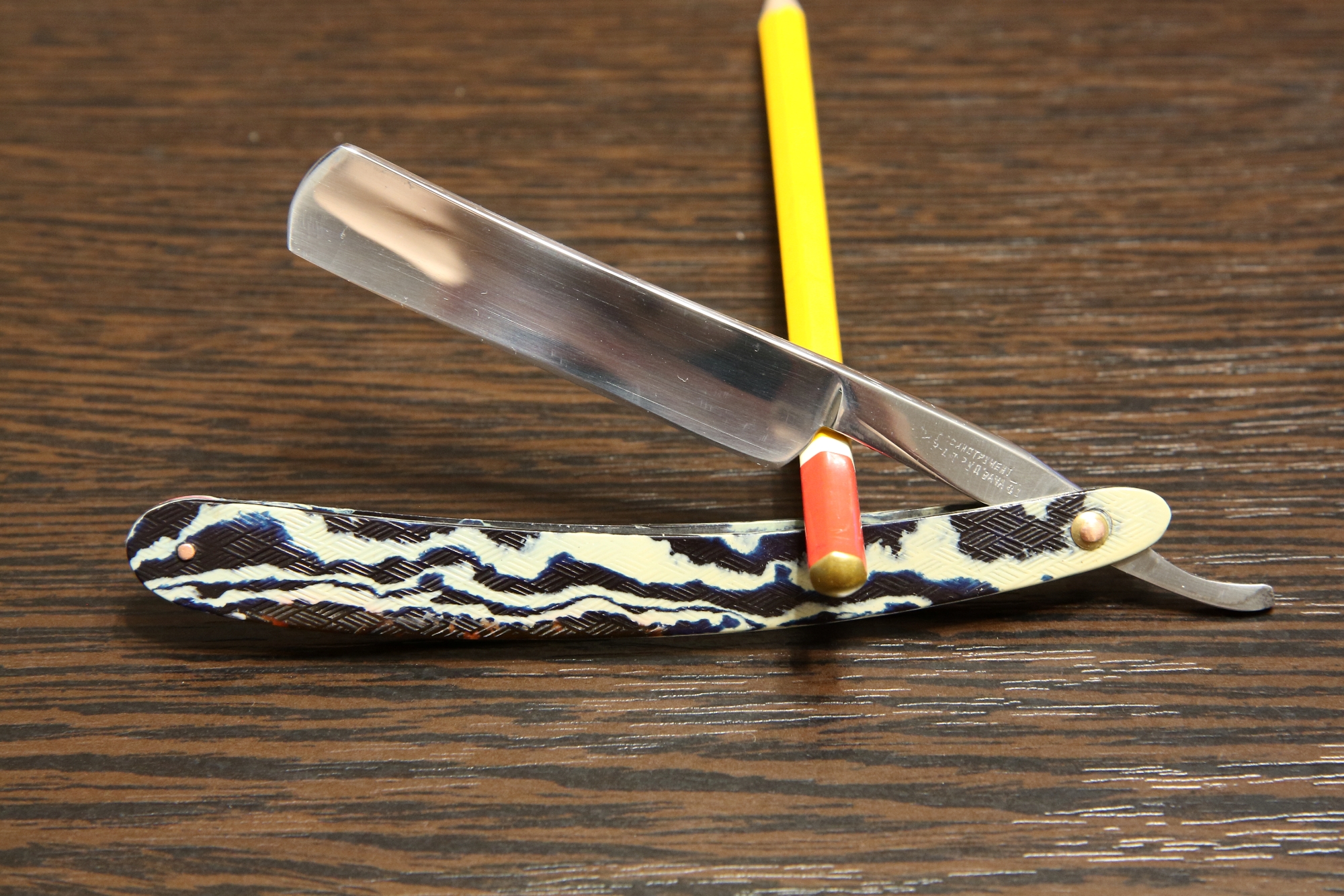 Опасная бритва завода Труд Вача Росинструмент, 1941 г. Месяц тут не выбит, просто чистое место, но я уверен, что это начало ВОВ, как и второй Росинструмент, они пришли вместе. Ширина полотна 17 мм, футляр родной (интересный, покрыт марлей, пропитанной смолой/клеем, типа как текстолит делали), ручку пришлось заменить, была треснутая, поставил от бритвы СТИЗ тех же лет (расцветка родная). Бритва пришла с заводской заточкой, чуть прошелся наждачками и заточил, остались следы в паре мест, там была местная коррозия. Подготовлена мной к бритью. Геометрия не идеал, но заточку я вывел полностью, в последующем затачиваться и правиться будет без проблем. Бритвы с клеймом "Росинструмент" очень ценятся. На мой вкус бреет достойно, без агрессии, не травматичная, но чуть потягивает щетину. Цена - руб. К бритве рекомендую приобрести ремень для правки опасных бритв моего изготовления из итальянской кожи (подробнее на странице 4, объявления 56-58 и странице 9, объявления 127). Spoiler Show
