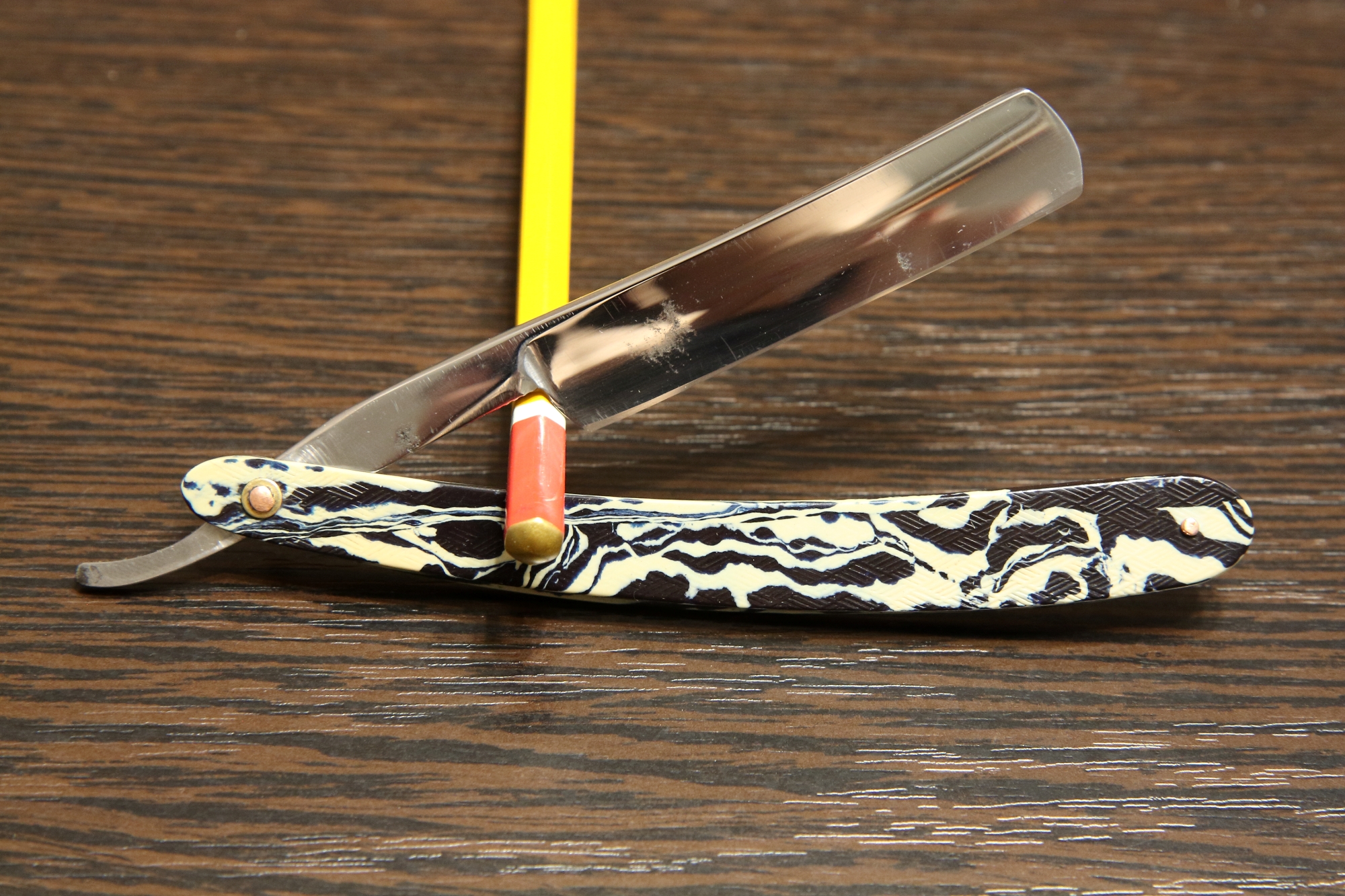 Опасная бритва завода Труд Вача Росинструмент, 1941 г, 8 месяц. Оборона Заполярья, Ленинграда, Одессы, Таллина, бои под Смоленском, Киевом, контрудар под Старой Руссой. Ширина полотна 17.3 мм, все родное, футляр тоже. Ручка родная, из пластика редкой желтой расцветки. Бритва пришла с заводской заточкой и без следов коррозии, чуть прошелся пастами и заточил. Геометрия не идеал, но заточку я вывел полностью, в последующем затачиваться и правиться будет без проблем. Подготовлена мной к бритью. Бритвы с клеймом "Росинструмент" очень ценятся. Цена - руб. К бритве рекомендую приобрести ремень для правки опасных бритв моего изготовления из итальянской кожи (подробнее на странице 4, объявления 56-58 и странице 9, объявления 127). Spoiler Show