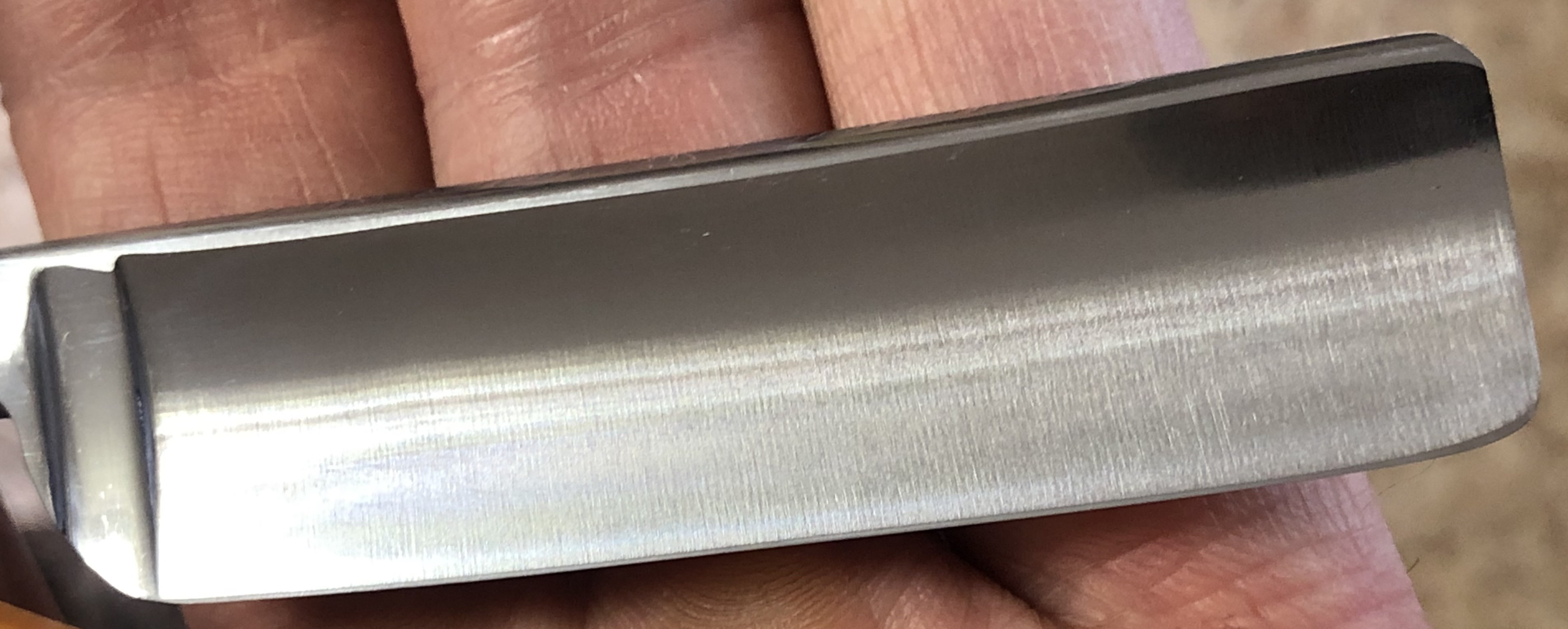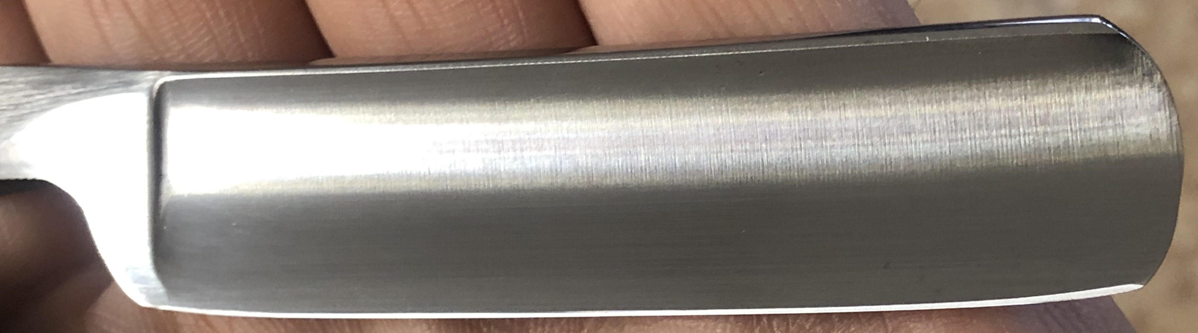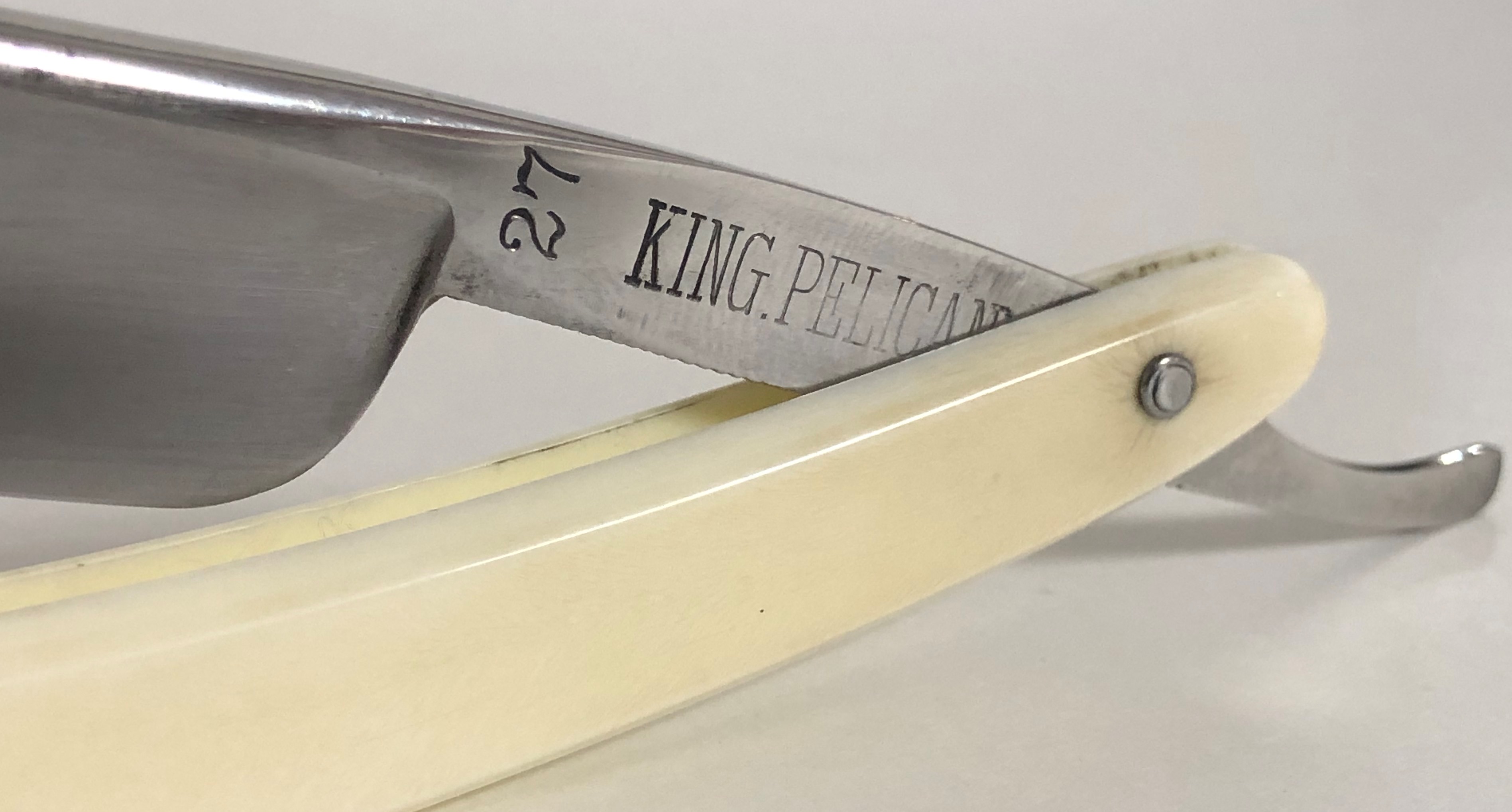 Следов пользования не обнаружено.Разобрал, немного освежил клинок от патины и заново собрал, сохранив оригинальный осевой пин. Идеальная геометрия изготовления. Кромочка равномерна по всей длине. Сталь и кромочка чистые от разного рода дефектов. Форма лезвия и размер бритвы очень хорошо подойдет для новичков и не только.Заточена и готова к бритью.