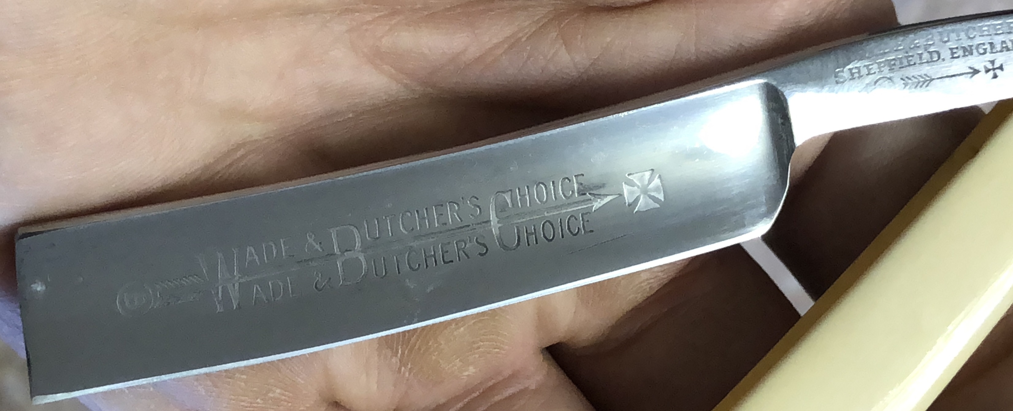 Клинок в очень хорошем состоянии, без следов от заточных камней на обушке.По всей видимости в пользовании не была.Немного следов патины на полотне убирать не стал, чтобы не трогать заводскую шлифовку и полировку.(На фото следы видны, а вот наяву практически незаметны). Кромочка равномерна по всей длине.(Небольшую горбинку в районе носика тоже трогать не стал, чтобы не стачивать лишний металл. Возможно заводской нюанс).Шикарная оправа из натурального бивня слона, с красивой структурой материала, находится в идеальном состоянии, без трещин и сколов и как раз очень подходит для такого именитого клинка. Бритва среднего размера, элегантная и удобная. Опытный пользователь способен в полной мере оценить данную модель, заточенную и в максимально сохраненном оригинальном виде.