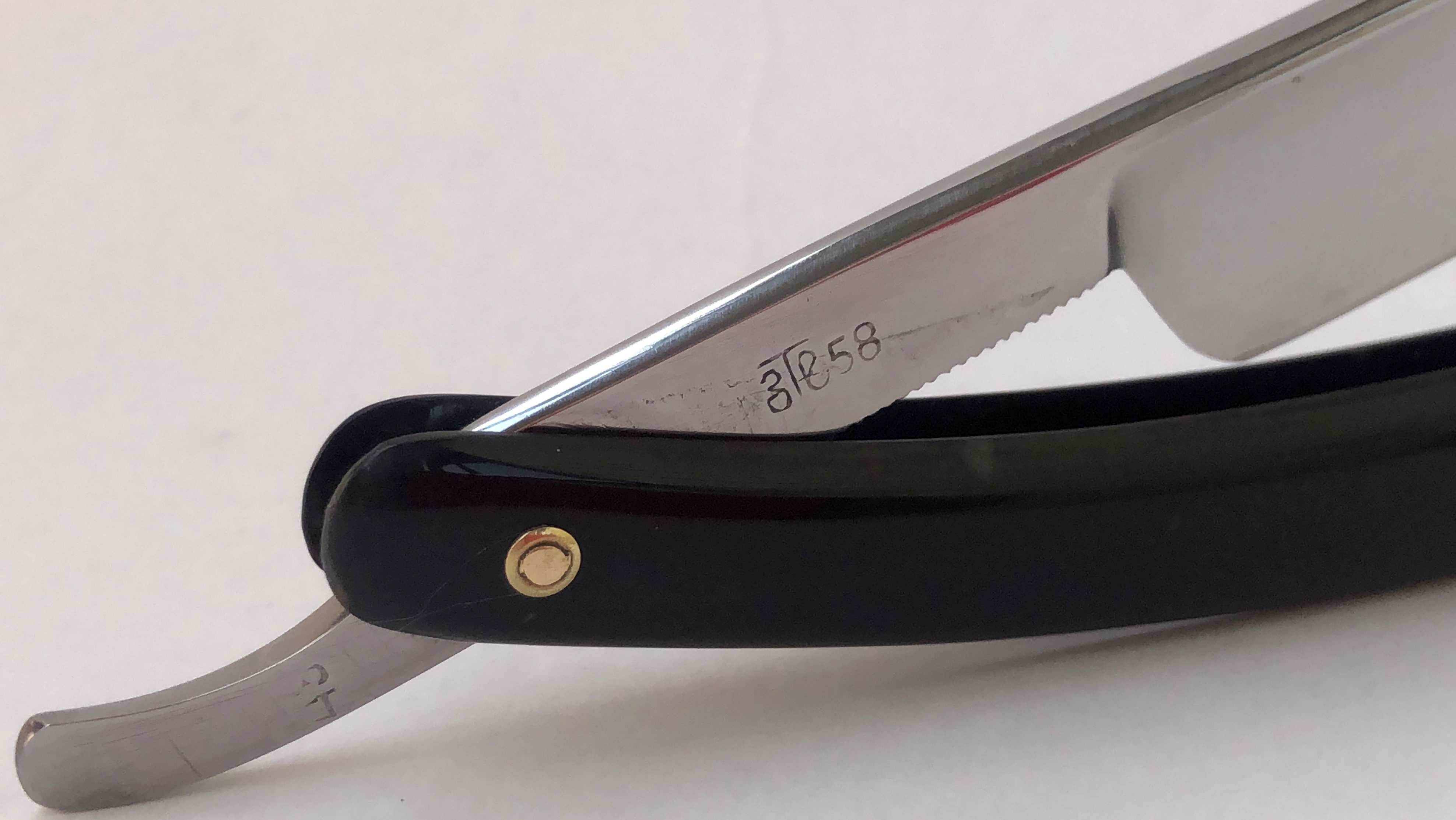 По всей видимости бритва была непользованная, но имела скол на 1.5 мм и немного очагов ржавчины, которые после определенных работ были успешно устранены.Разобрал, почистил, умеренно отполировал и заново собрал, заменив оригинальные пины на немецкие двух-цветные втулки.Идеальная геометрия:кромочка равномерна по всей длине.Бритва продается с 60%-ой скидкой, так что не пропустите..Заточена и готова к бритью.