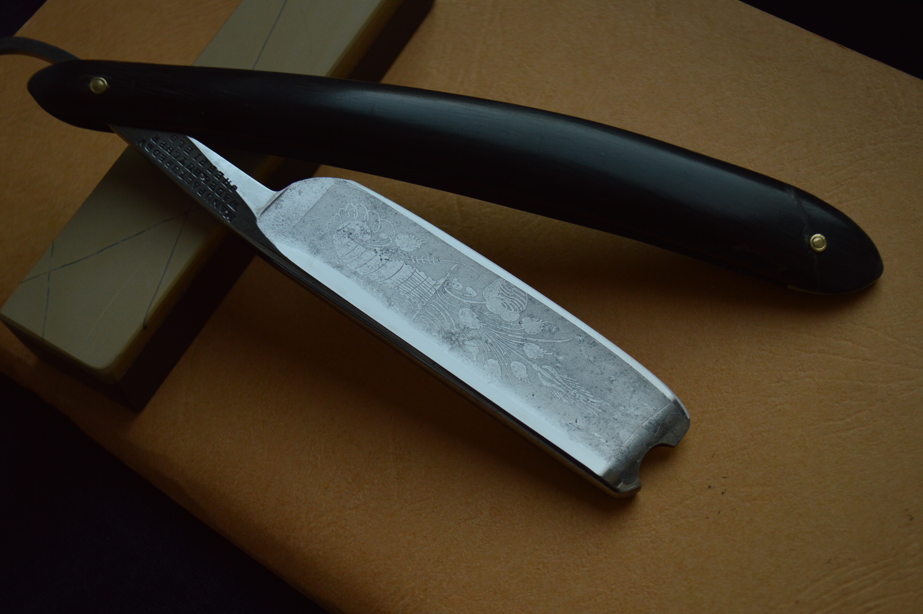 Профессионально восстановленная бритва в строении клин. Ширина полотна – 6/8, ручка рог в замечательном сохране. Сама сталь в лучших традициях французских бритв: вязкая, мелко-зернистая, бритье превосходно мягкое и чистое. То, как бреет эта бритва можно рассказывать часами, но главное, что вам нужно знать это то, что мягче бритвы вы не пробовали это точно. Отдельного упоминания заслуживает форма бритвы и исполнение спинки, эрля и хвостика. Насечки на эрле с двух сторон, которые позволяют очень удобно удерживать бритву, верхняя насечка просто громадная, редчайший вариант исполнения, при этом сам эрль удобен тем, что идет от нижней насечки к верхней на утолщение...очень тонкий ход от производителя, добавляет удобства в удержании, очень удобно в бритье при проходе сверху-вниз, а так же отдельного внимания заслуживает форма полотна, которое имеет сильно выраженную улыбку, что лучшим образом скажется на бритье. Спинка имеет ровную площадку, если бритву поставить на спинку, то она на ней так и будет стоять, от спинки уходят спуски к полотну, образовывая в сечении трапецию. Пользуйтесь возможностью, такие достойные и незаурядные образцы старой Франции практически не встречаются. За деталями прошу обращаться в личные сообщение. Оплата по договоренности обсуждается в л/с (зачастую это перевод на карту Виза по курсу на день покупки), отправка посредством государственной почты Украины и России. Резерв в л/с. Цена 600 дол (доставка включена в стоимость) Spoiler Show