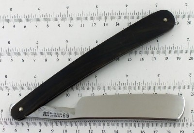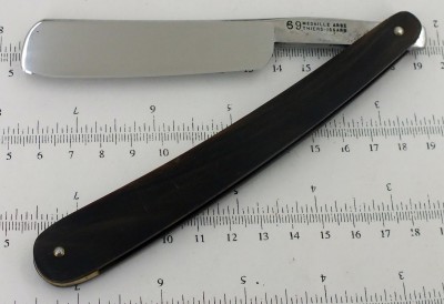 6/8, почти клин. Углеродистая сталь, рог, кость. Оправа заменена. Бритва после реставрации. Следы времени остались. Заточена и готова к бритью. Бреет великолепно. Мягко и комфортно, как все бритвы домартеновской эпохи. Снято с продажи Spoiler Show