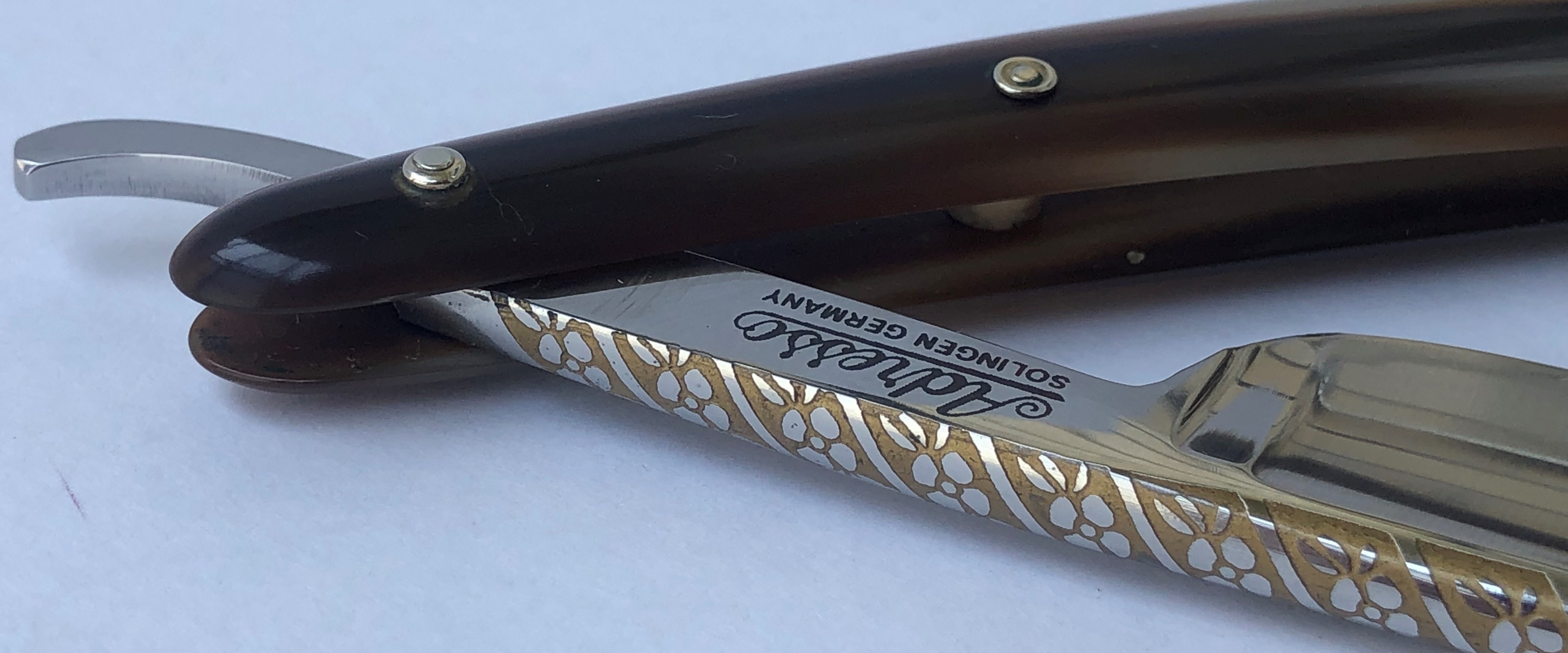 Бритва в идеальном и непользованном состоянии. Ничего не разбиралось и не ремонтировалось.Все как вчера с завода.Оригинальная шлифовка и полировка клинка.Идеальная геометрия полотна:кромочка равномерна по всей длине.Шикарная оправа из натурального рога. Третий средний пин надежно держит оправу от деформации.Ажурный и эффектный обушок.