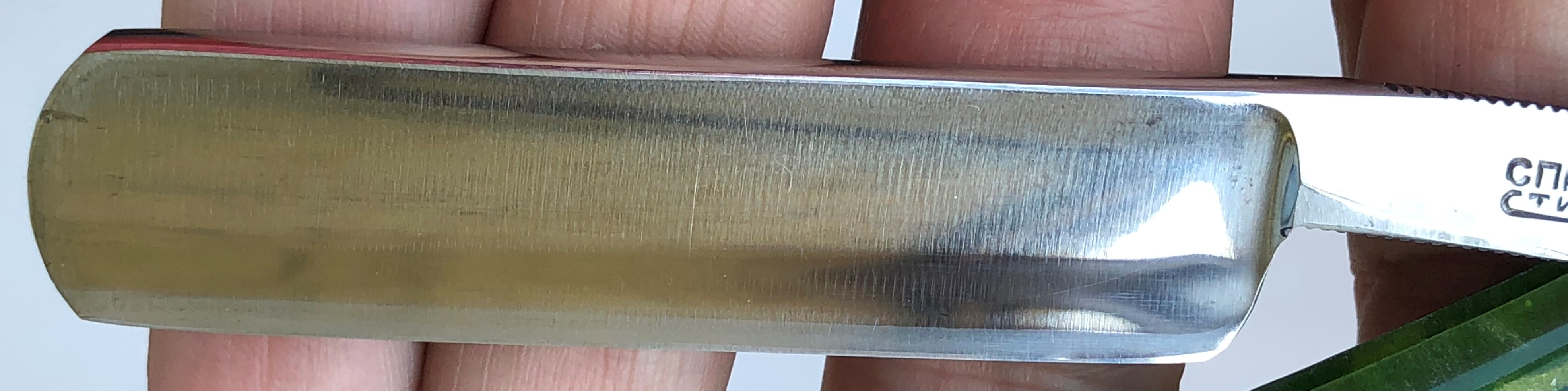Стизовский клинок укомплектовал плашками разного оттенка от Вачских бритв, а пин поставил ремонтный, от нашего комрада Бабура из Германии.Клинок в хорошем пользованном состоянии, с элементами патины в районе эрля. Само полотно чистое и с ровненькой кромочкой.Бритва заточена и готова к пользованию.
