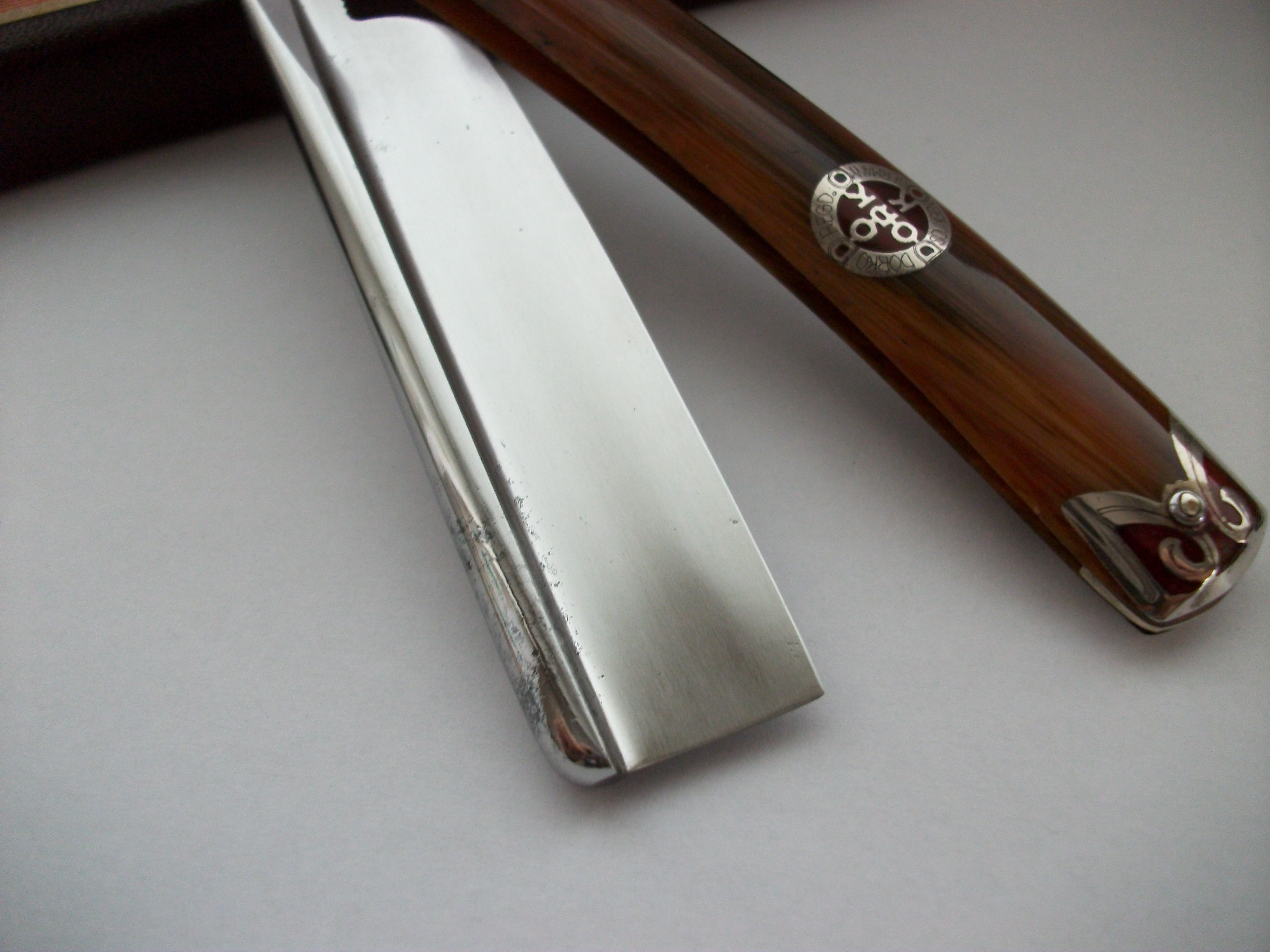 Dorko рыцарь в сияющих доспехах ... Интересный гринд (ложный фреймбек, но достаточно своеобразный). Углеродистая сталь, ширина полотна 20мм, длина режущей кромки примерно 74мм. Отличный вариант в коллекцию. Есть следы времени , но кромка чистая. Заточена и готова к бритью. Продан Spoiler Show
