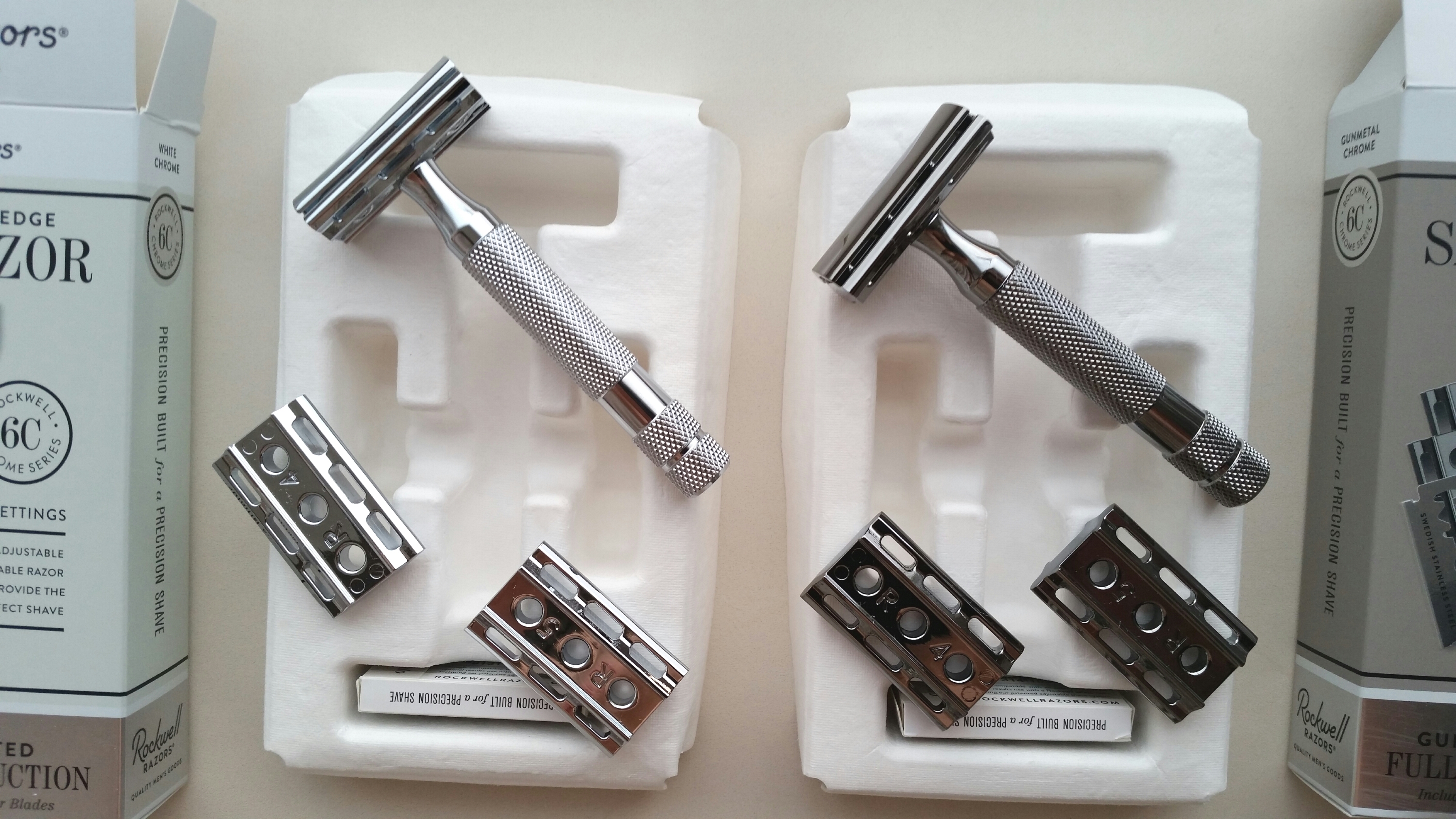 Регулируемый Т-образный классический станок для бритья Rockwell 6C, цвет Gunmetal (оружейная сталь) и White Chrome (белый хром) - на выбор. Станки новые, только добрались из заграницы, полный комплект, доставались исключительно для фото (и проверки на состыковку частей, на фото собраны с прокладкой, чтобы не было следов от ручки, прокладка в комплект не входит). Без дефектов, повреждений, брака.