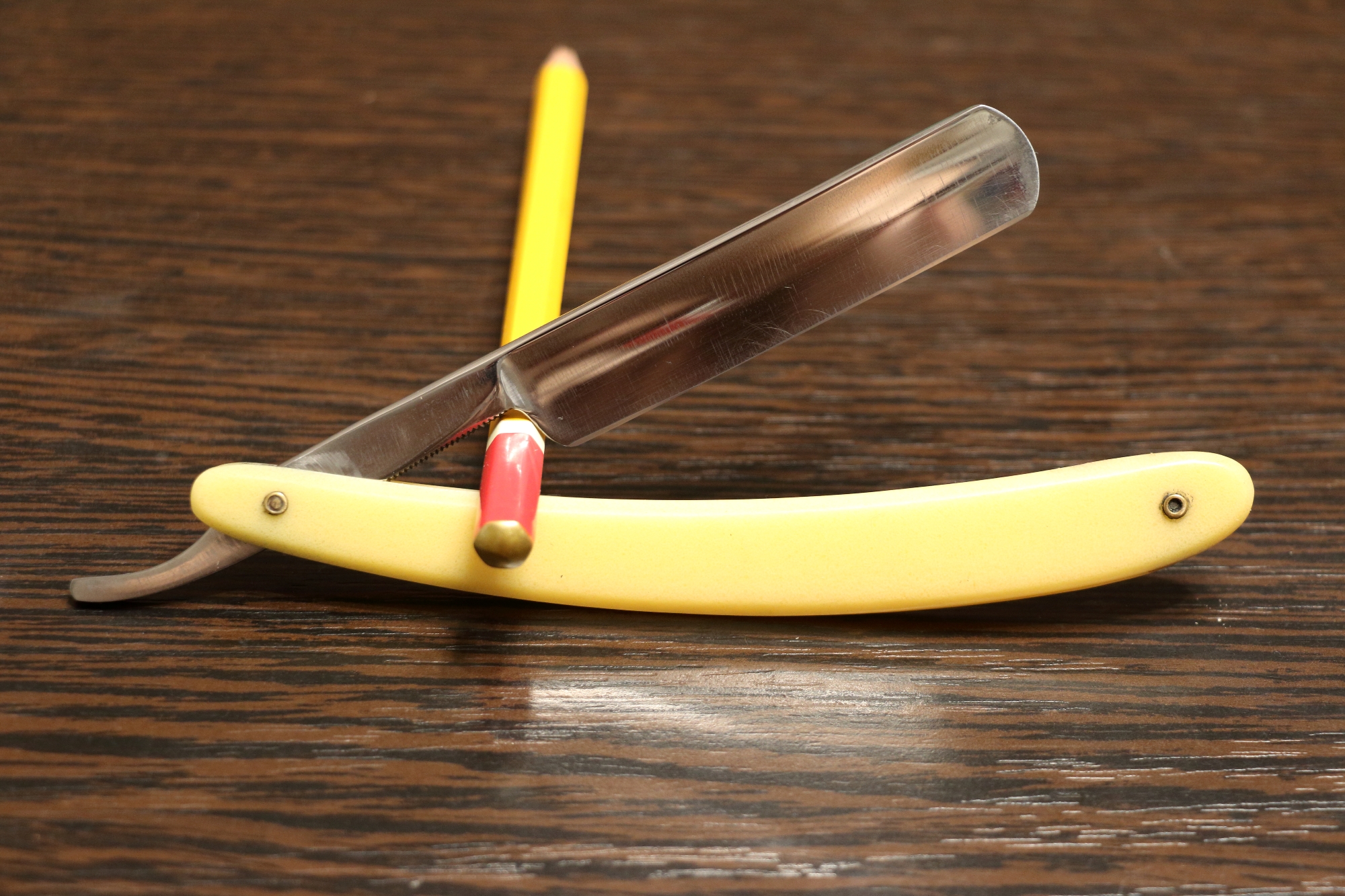 Опасная бритва Двухзаковная, завод СТИЗ, 1956 год. Ширина полотна 17.5 мм, все родное в т. ч. футляр. Ко мне попала с заводской заточкой и почти без следов (разве что в осевом была некоторая коррозия), прошелся вручную полиролью и подготовил к бритью. Фаска с одной стороны не совсем ровная (геометрия немного нарушена), ничего критичного, заточку я полностью вывел. Красивая ручка под янтарь. Двухзаковные второй половины 50х шли с отличной звонкой сталью, способной замечательно держать заточку и при этом комфортно брить, эта бритва не исключение (не брился ей, сужу чисто по работе с бритвой). Цена - руб.