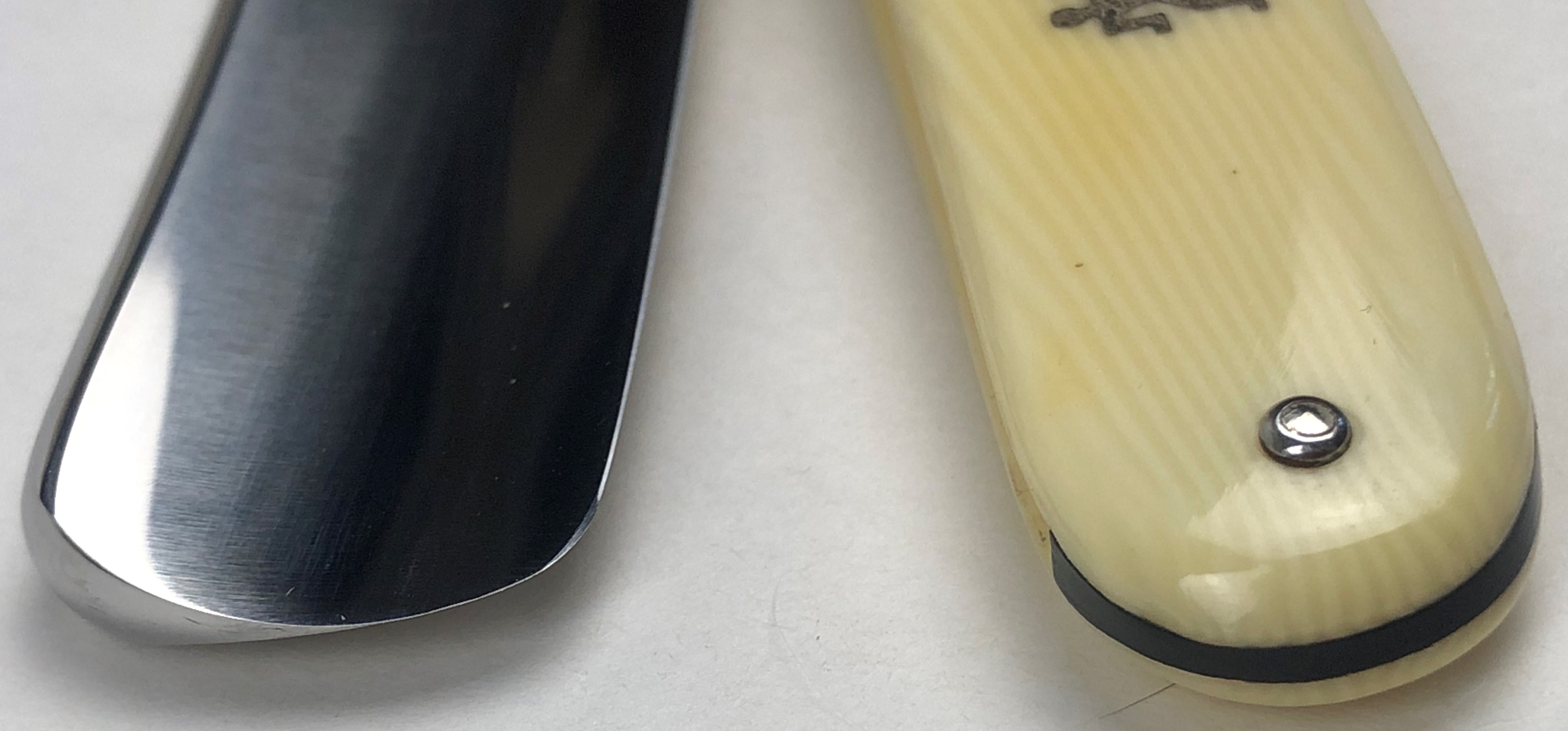 viewtopic.php?t=2083 Ширина полотна-19.5 мм. Толщина обушка-5 мм. Полная вогнутость. Углеродистая сталь. По всей видимости самое начало 20-го века, возможно и раньше. Бритва в очень хорошем и малопользованном состоянии."Горбатая" форма лезвия чем то напоминает наш стизовский послевоенный "СПАРТАК", хотя немного более массивный.Клинок был немного почищен от вековой патины и окисления металла, с сохранением шикартный "следов времени" на эрле..Не знаю, родная ли оправа стояла или нет, но в любом случае пины поменял на двух-цветные пины и добавил внутренние шайбы.Очень хорошая геометрия клинка:кромочка приближается у идеальной.Бритва заточена и лично протестирована. Отдельно хочу сказать по поводу заточки и качества стали. На мой взгляд, с точки зрения заточника, сама сталь(и закалка) прекрасно подходит для бритв.Прогнозируемо заточилась.После тонкой доводки на финишном камне уже стала проходить тест на рез волоса, а после правки на ремне тест мягкий , без отскока. Что важно,после бритья бритва прекрасно продолжает проходить тест на рез волоса, без правки на ремне, что говорит о качественной стали , способной хорошо держать заточку. По своей форме лезвия и размерам, бритва будет отличным вариантом для новичка и не только. Цена-10500 р с доставкой.ПРОДАН Spoiler Show