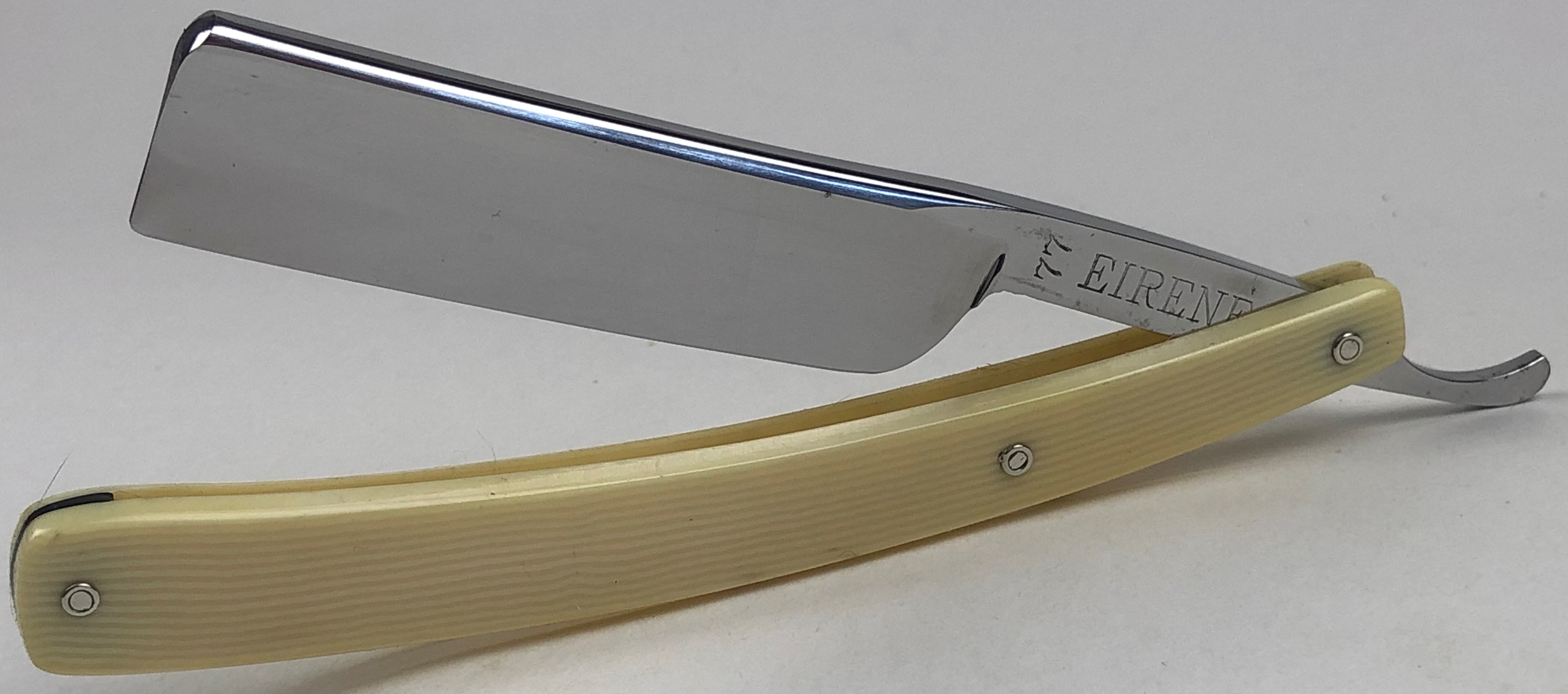 Ширина полотна-18 мм. Толщина полотна-4.8 мм. Полная вогнутость. Углеродистая сталь. Бритва первой половины прошлого века, наверное для внутреннего французского рынка. Бритва в прекрасном состоянии для своих лет и без активных следов пользования.По всей видимости в пользовании вообще не была.Была разобрана и были произведены косметические работы.Поменял пины на двух-цветные втулки, с добавлением внутренних шайб. Геометрия клинка близка к идеальной. Сталь и кромочка чистые от видимых дефектов.Бритва среднего, удобного размера, с элегантными формами. Очень хорошо подойдет для новичка, в качестве стартовой бритвы. Цена-7500 р с доставкой.ПРОДАН Spoiler Show