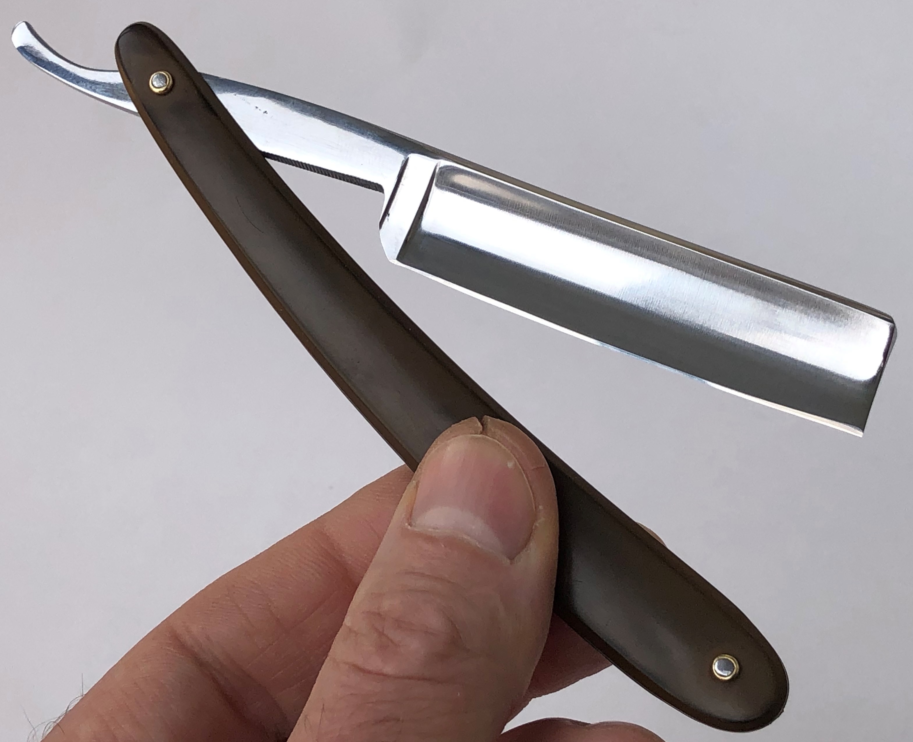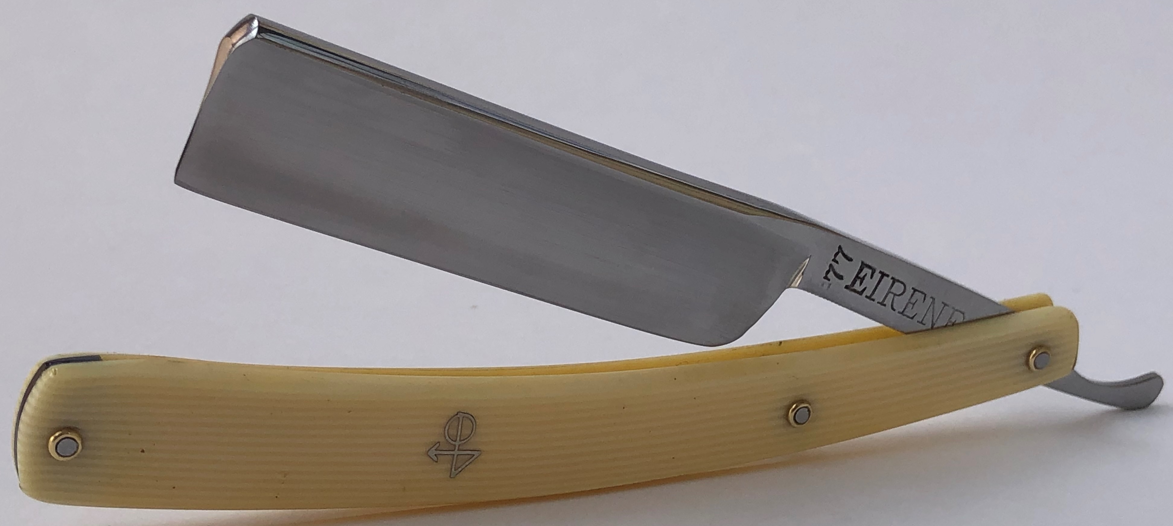 (донор довоенный, примерно 20-30-е годы).Плашки оправы прочные и достаточно толстые,без трещин и дефектов. Природный рисунок кости невероятной красоты.Понятно, что японцы не ставили на свои бритвы (по крайней мере я не видел ничего подобного) ручки из натуральных материалов,но в этот раз захотелось чего то неординарного.Из за свой формы клинка, а также размеров оправы,бритва достаточно тяжёлая и приятно лежит в руке.Бритва заточена и лично протестирована. Бреет прекрасно и без вопросов.