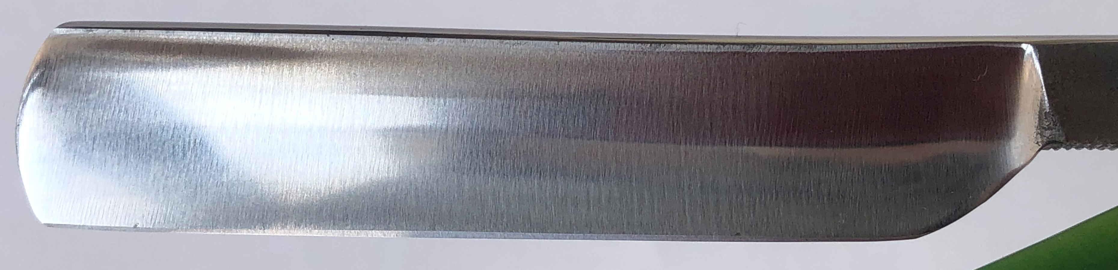 Идеальное состояние.Бритва была разобрана для удаления радиальных царапин на эрле, из за отсутствия внутренних шайб.Была установлена новая осевая втулка и добавлены внутренние шайбы. Заодно немного освежил само полотно, для восстановления былого блеска и умеренно отполировал. Идеальная геометрия клинка:кромочка еле заметна и равномерна по всей длине.Бритва заточена впервые и готова к бою..