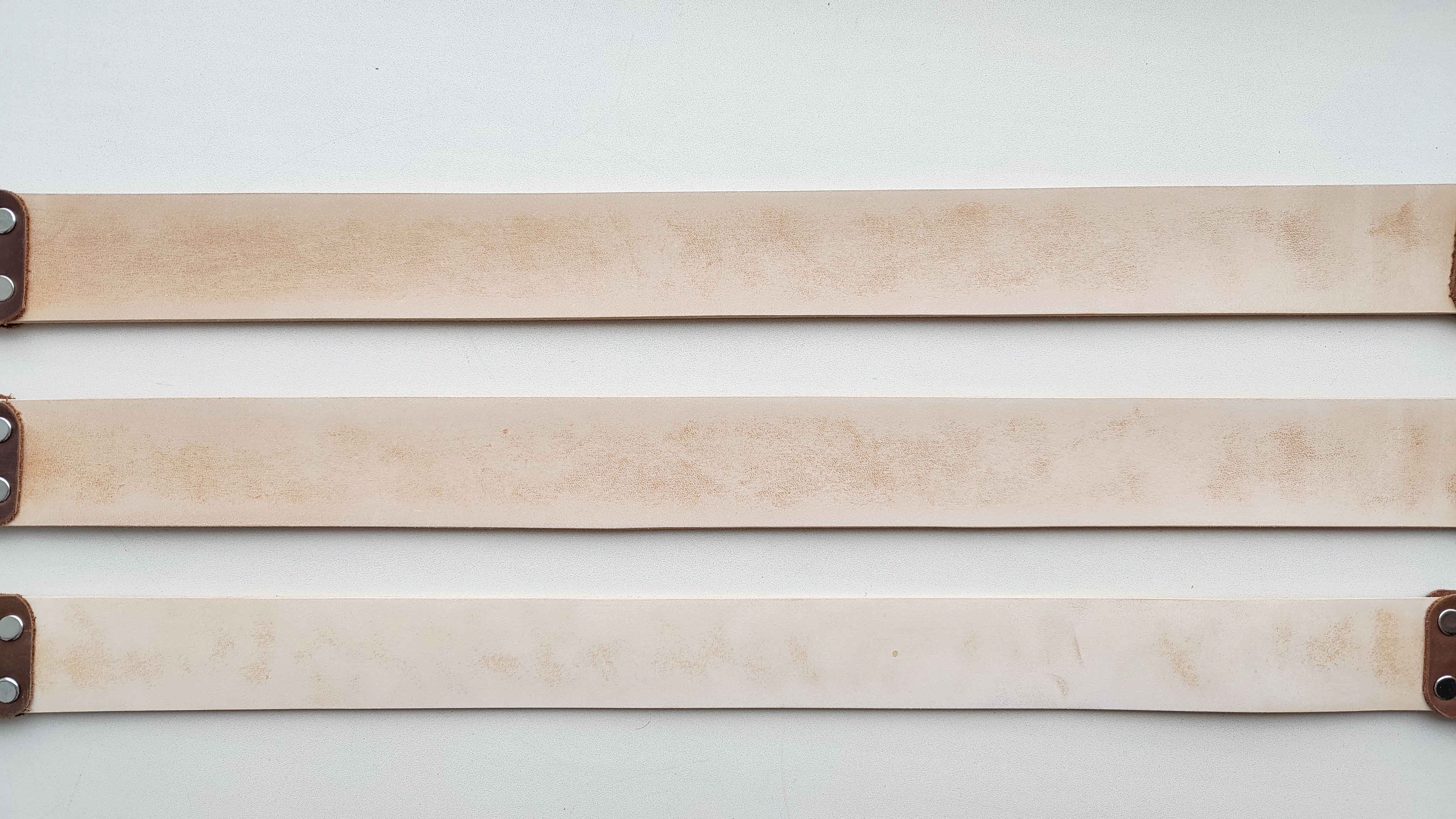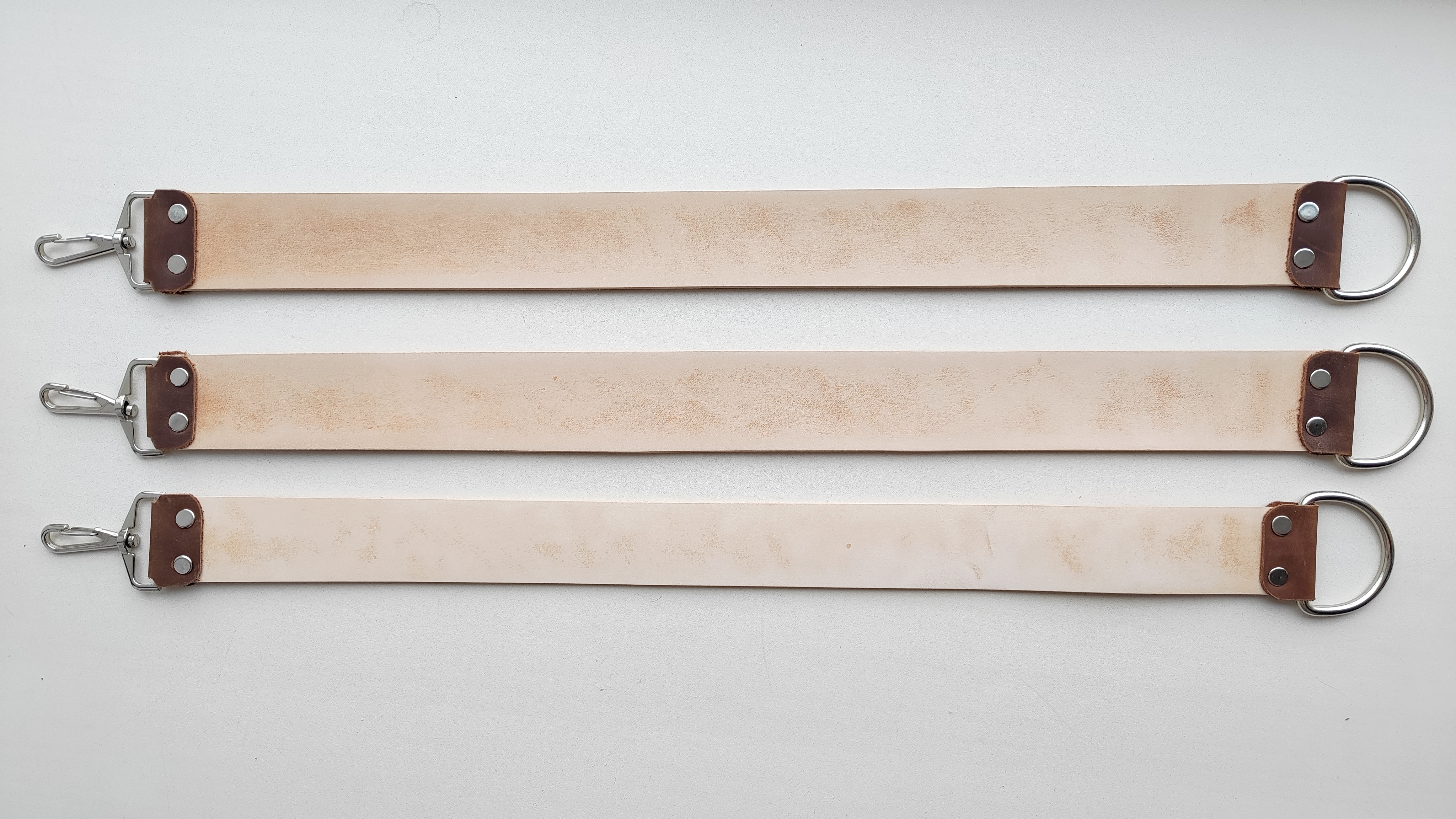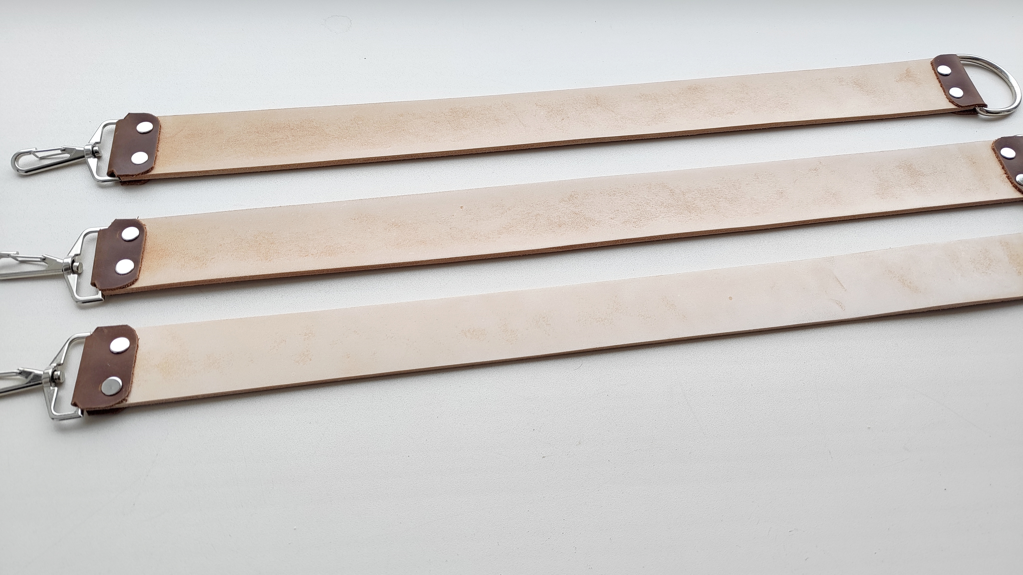 Два ремня для правки опасных бритв,с мелкими дефектами и по сниженым ценам: 1. Ширина 51 мм, без стропы, есть ямка на коже глубиной 0.5 - 0.6 мм, отражён на предпоследнем фото. Цена: 2370 руб. 2. Ширина 51 мм, со стропой, под верхнем крепежным элементом часть кожи деформирована,там виден бугор и видны мелкие заломы, отражён на последнем фото. Цена: 2780 руб. Стандартное описание: ремень для правки опасных бритв, стандартный, 51 мм, с синтетической стропой, итальянская кожа КРС растительного дубления (чепрак). На ощупь ладонью ощущается очень мелкий и бархатный микроворс - под быструю и эффективную правку бритв любой твёрдости, как раз он и правит кромку. Ремень подготовлен к правке, поверхность прокатана и отшлифована до Р2500. На поверхности кожи могут быть более тёмные места, на работу не влияет. Это "растишка", она не подвергалась хим. дублению и окрашиванию, поэтому могут быть участки, отличающиеся по цвету, на правку это не повлияет. Нержавеющая фурнитура, удерживающие элементы из натуральной кожи, все ремни новые, изготавливаю сам. К ремню прикреплена дополнительная синтетическая стропа, служит для предварительной правки, удаления чешуек/махры/микровлаги после бритья с кромки, а так же может использоваться для нанесения пасты или абразивного спрея (следите, чтобы паста или спрей не попали на основной кожаный ремень). Длина ремня - от 500 мм Ширина - 51 мм Толщина кожи - 3.2 мм Толщина синтетики - 1 мм. Инструкцию по использованию и хранению ремня вышлю. Spoiler Show