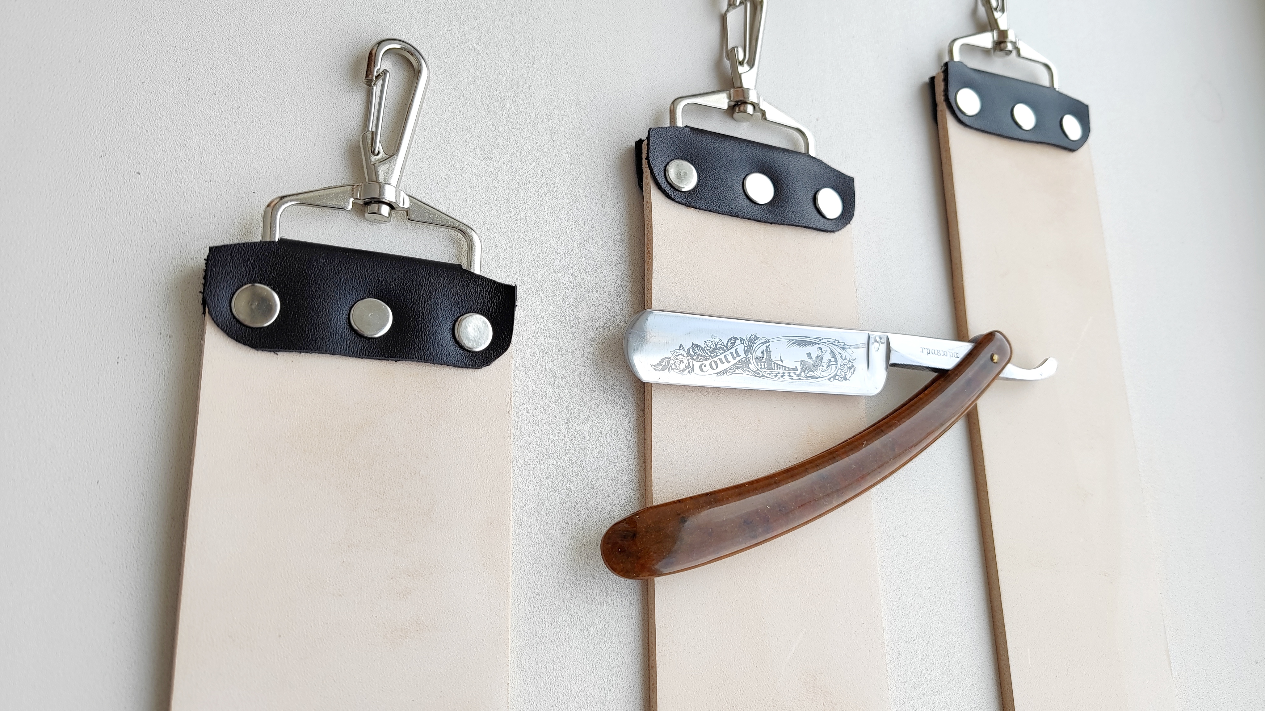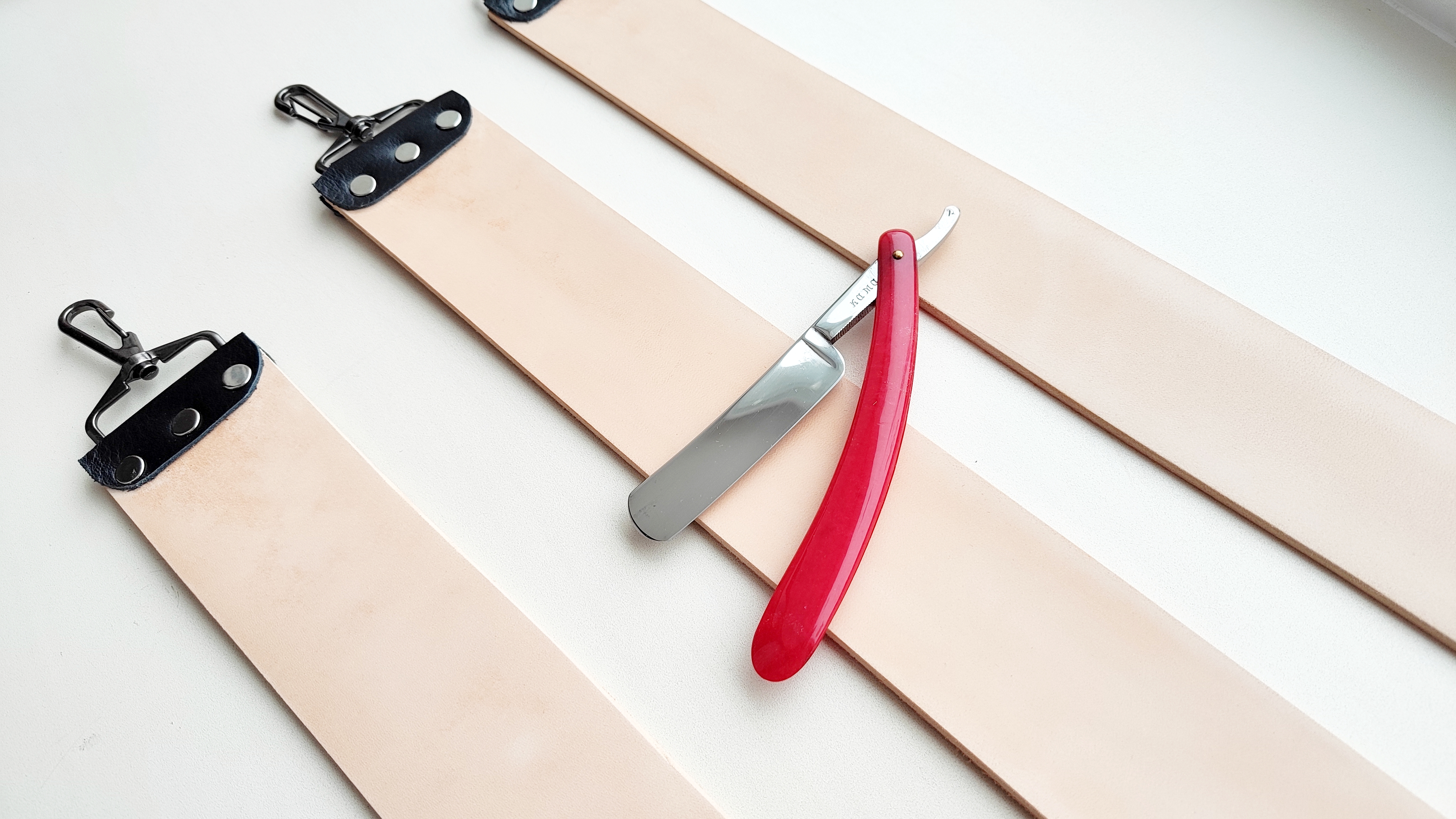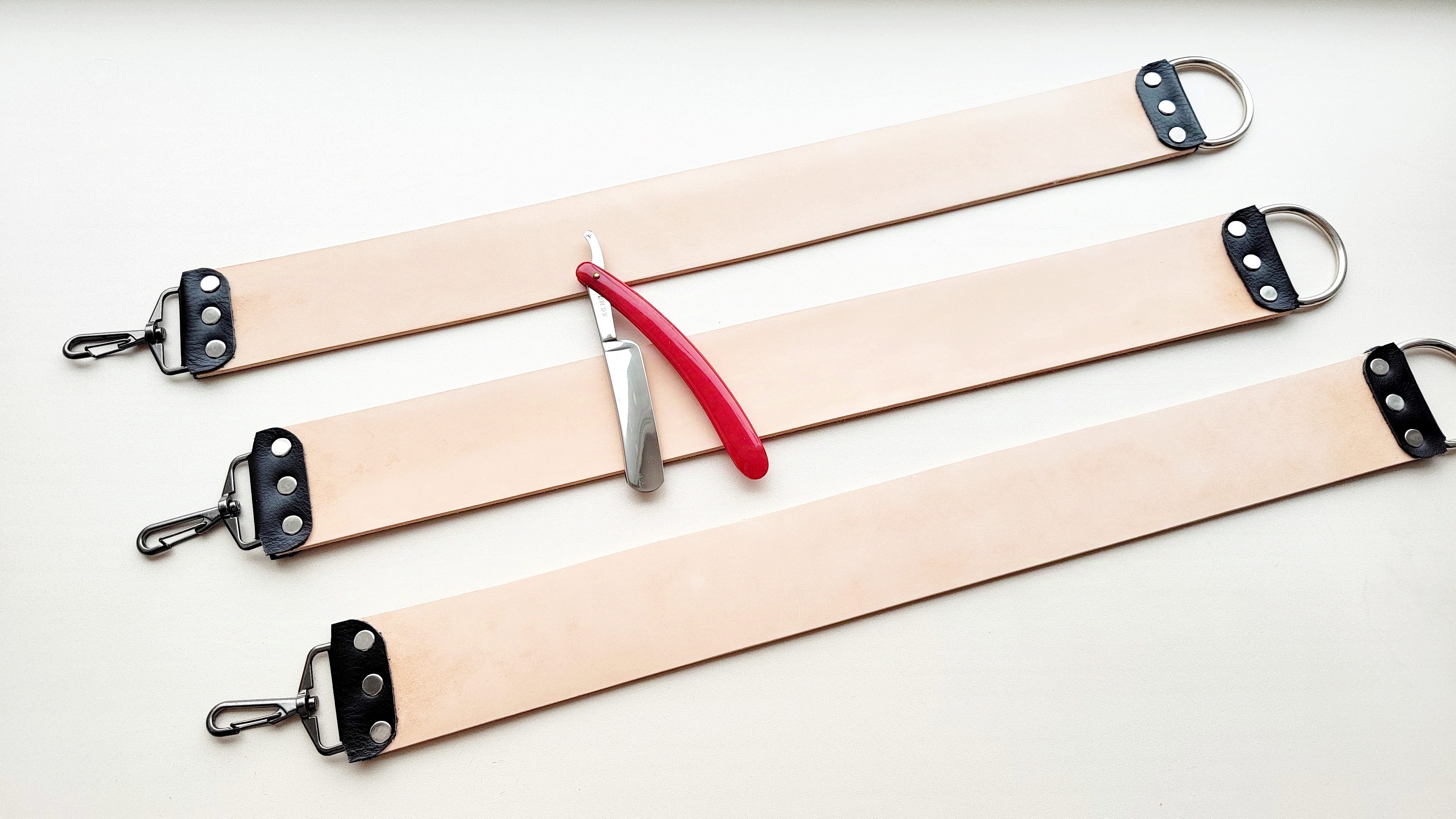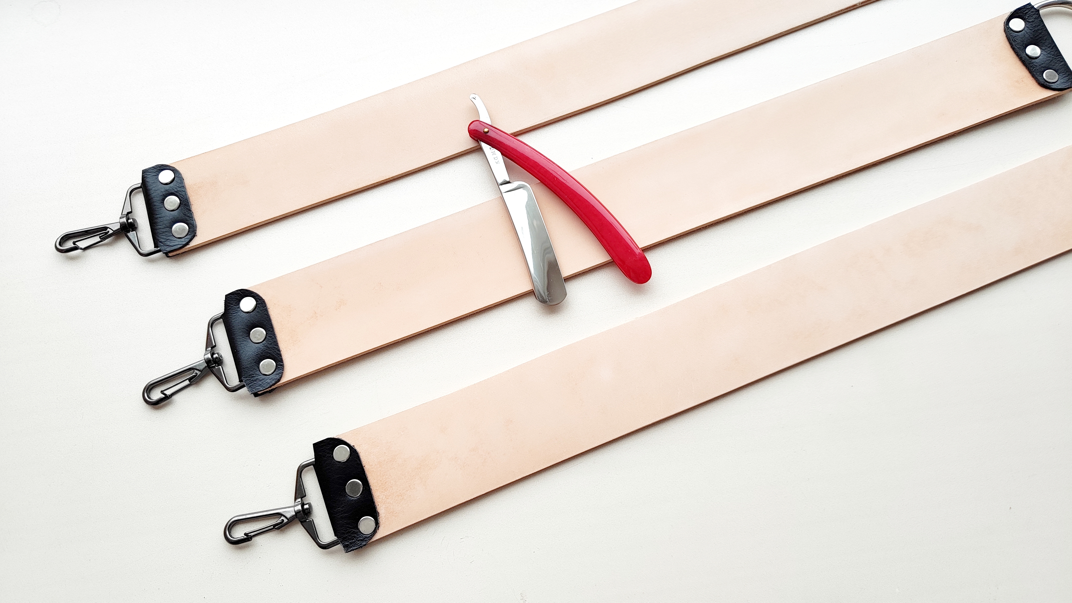 Ремень для правки опасных бритв, стандартный, 51 мм, итальянская кожа КРС растительного дубления (чепрак). На ощупь ладонью ощущается очень мелкий и бархатный микроворс - под быструю и эффективную правку бритв любой твёрдости, как раз он и правит кромку. Ремень подготовлен к правке, поверхность прокатана и отшлифована до Р2500. На поверхности кожи могут быть более тёмные места, на работу не влияет. Это "растишка", она не подвергалась хим. дублению и окрашиванию, поэтому могут быть участки, отличающиеся по цвету, на правку это не повлияет. Нержавеющая фурнитура, удерживающие элементы из натуральной кожи, все ремни новые, изготавливаю сам. Длина ремня - от 500 мм Ширина - 51 мм Толщина кожи - 3.8-4 мм. Инструкцию по использованию и хранению ремня вышлю, опасная бритва с фото не продаётся. Цена 2750 руб. Spoiler Show