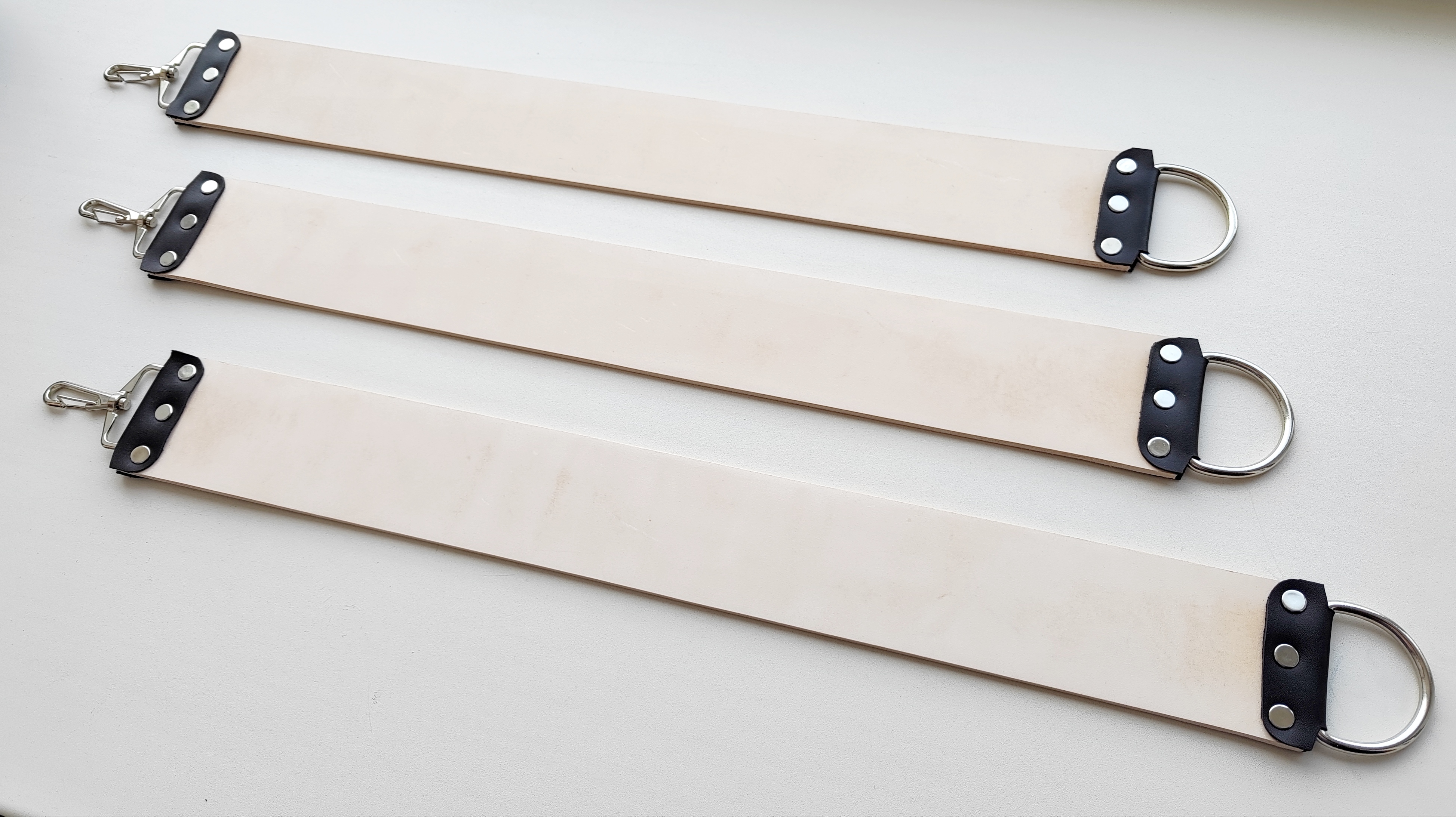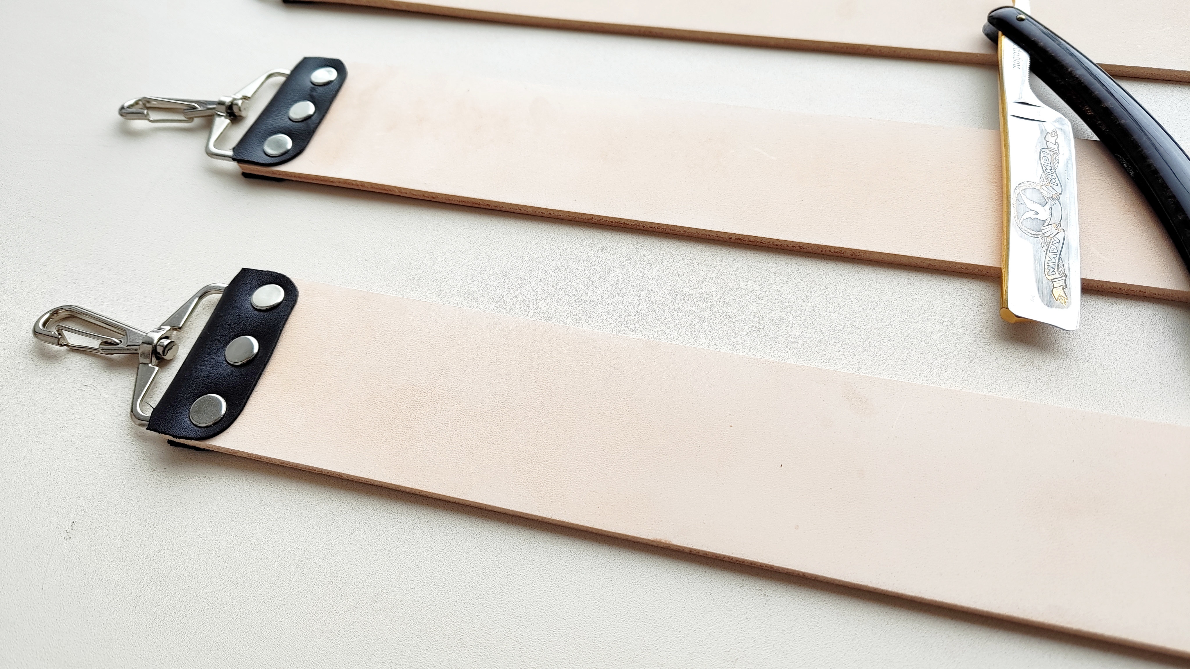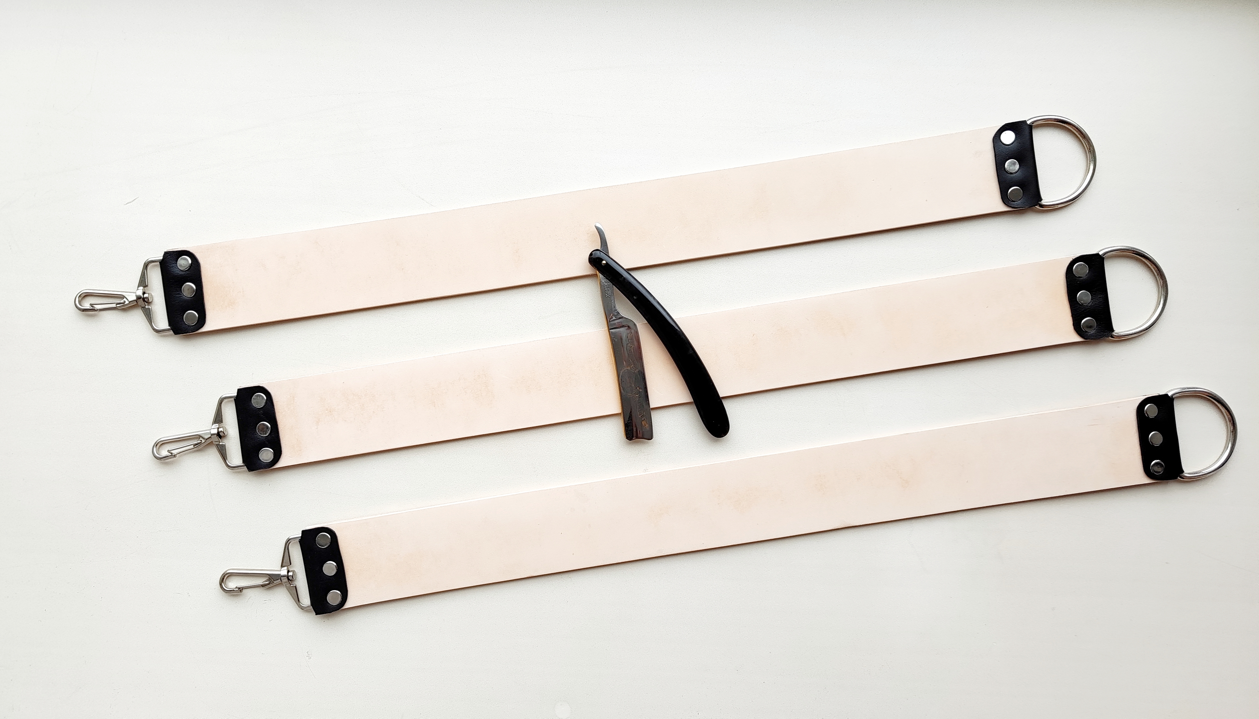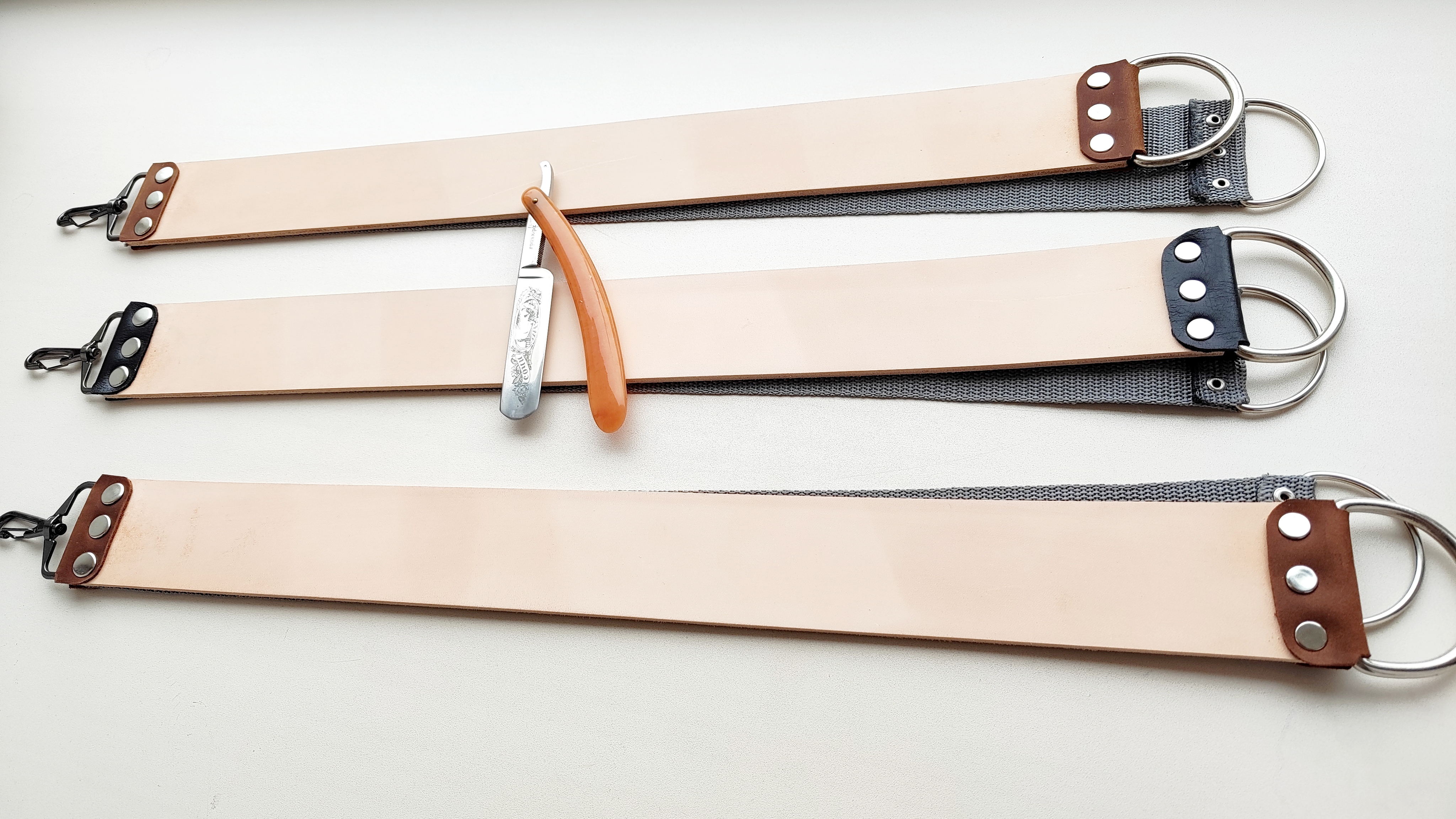 Ремень для правки опасных бритв, стандартный, 51 мм, с синтетической стропой, итальянская кожа КРС растительного дубления (чепрак). На ощупь ладонью ощущается очень мелкий и бархатный микроворс - под быструю и эффективную правку бритв любой твёрдости, как раз он и правит кромку. Ремень подготовлен к правке, поверхность прокатана и отшлифована до Р2500. На поверхности кожи могут быть более тёмные места, на работу не влияет. Это "растишка", она не подвергалась хим. дублению и окрашиванию, поэтому могут быть участки, отличающиеся по цвету, на правку это не повлияет. Нержавеющая фурнитура, удерживающие элементы из натуральной кожи, все ремни новые, изготавливаю сам. К ремню прикреплена дополнительная синтетическая стропа, служит для предварительной правки, удаления чешуек/махры/микровлаги после бритья с кромки, а так же может использоваться для нанесения пасты или абразивного спрея (следите, чтобы паста или спрей не попали на основной кожаный ремень). Длина ремня - от 500 мм Ширина - 51 мм Толщина кожи - 3.8-4 мм Толщина синтетики - 1 мм. Инструкцию по использованию и хранению ремня вышлю, опасная бритва с фото не продаётся. Цена 3210 руб. Spoiler Show