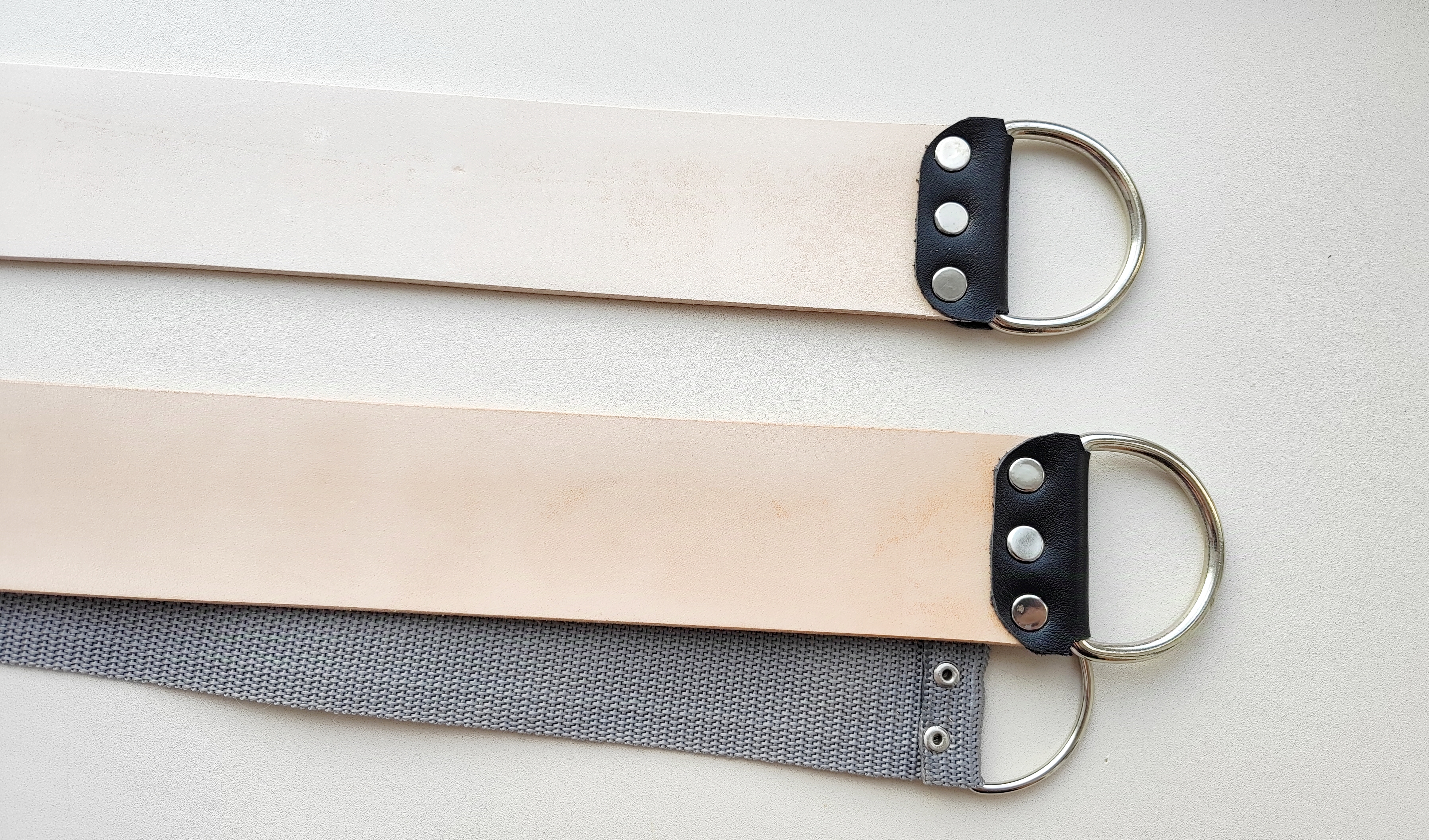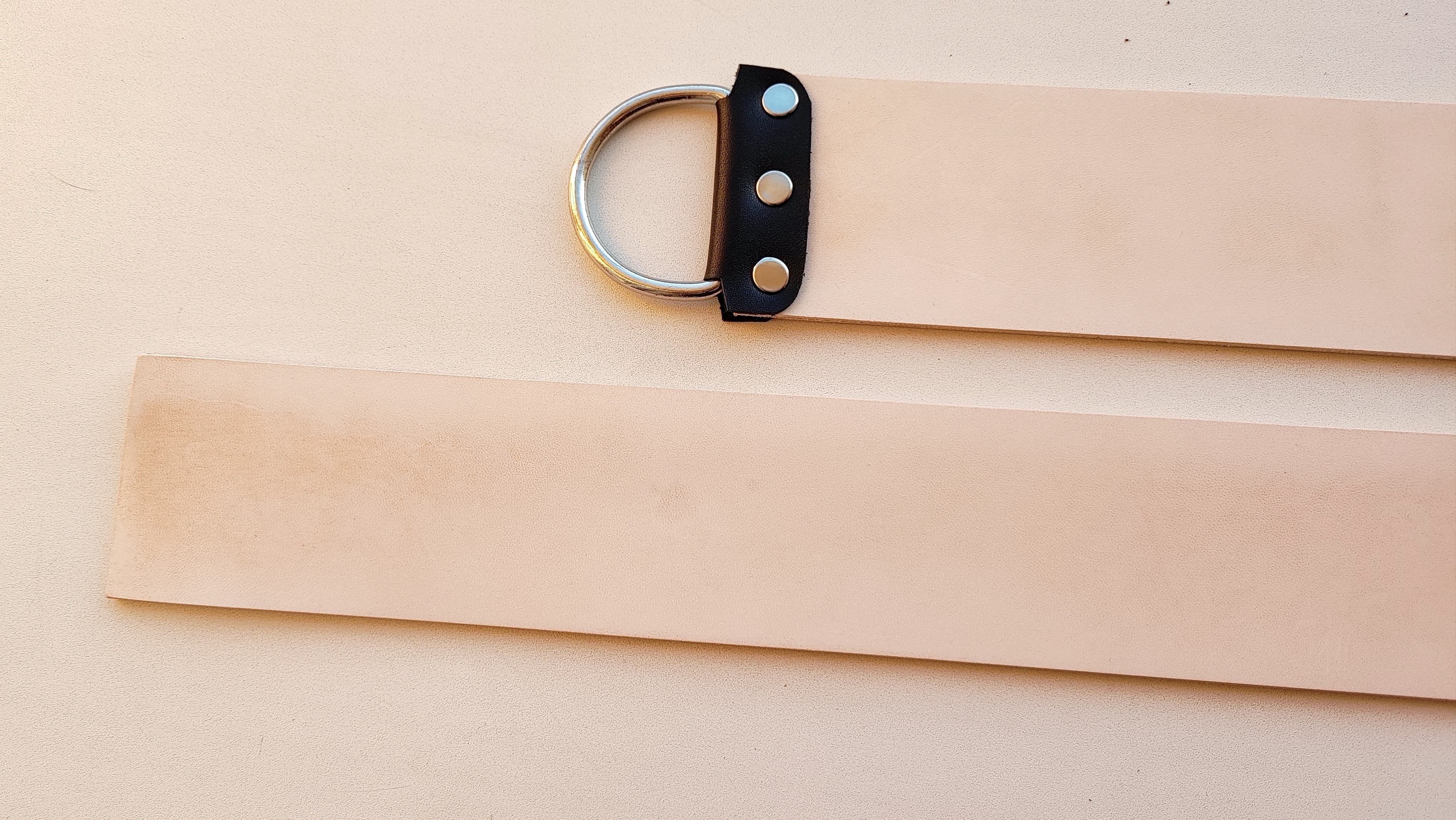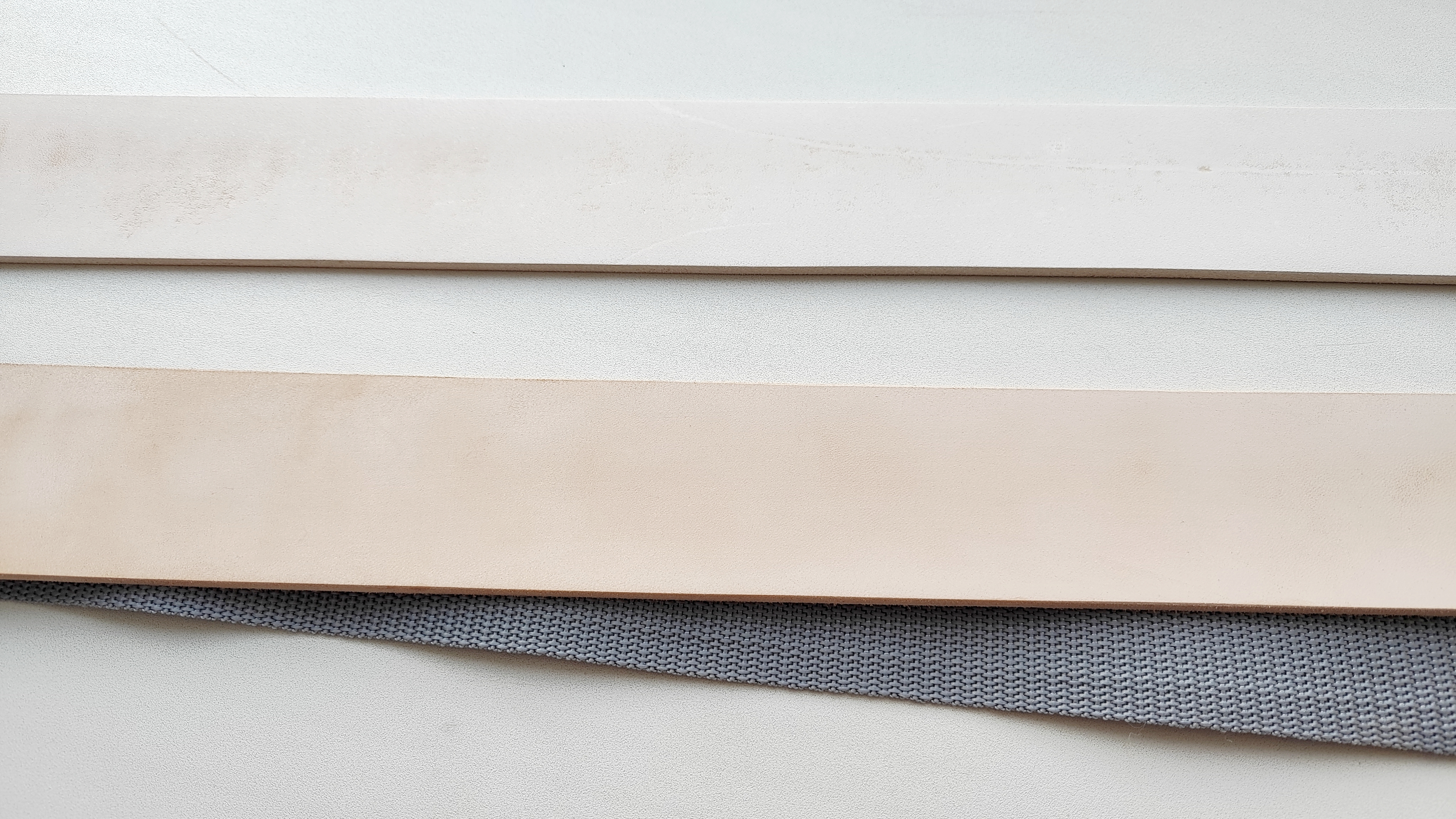Сверху ремень для правки поварских ножей: ширина 9 см, длина 62 см. Снизу для масштаба лежит мой стандартный широкий ремень (62 мм).