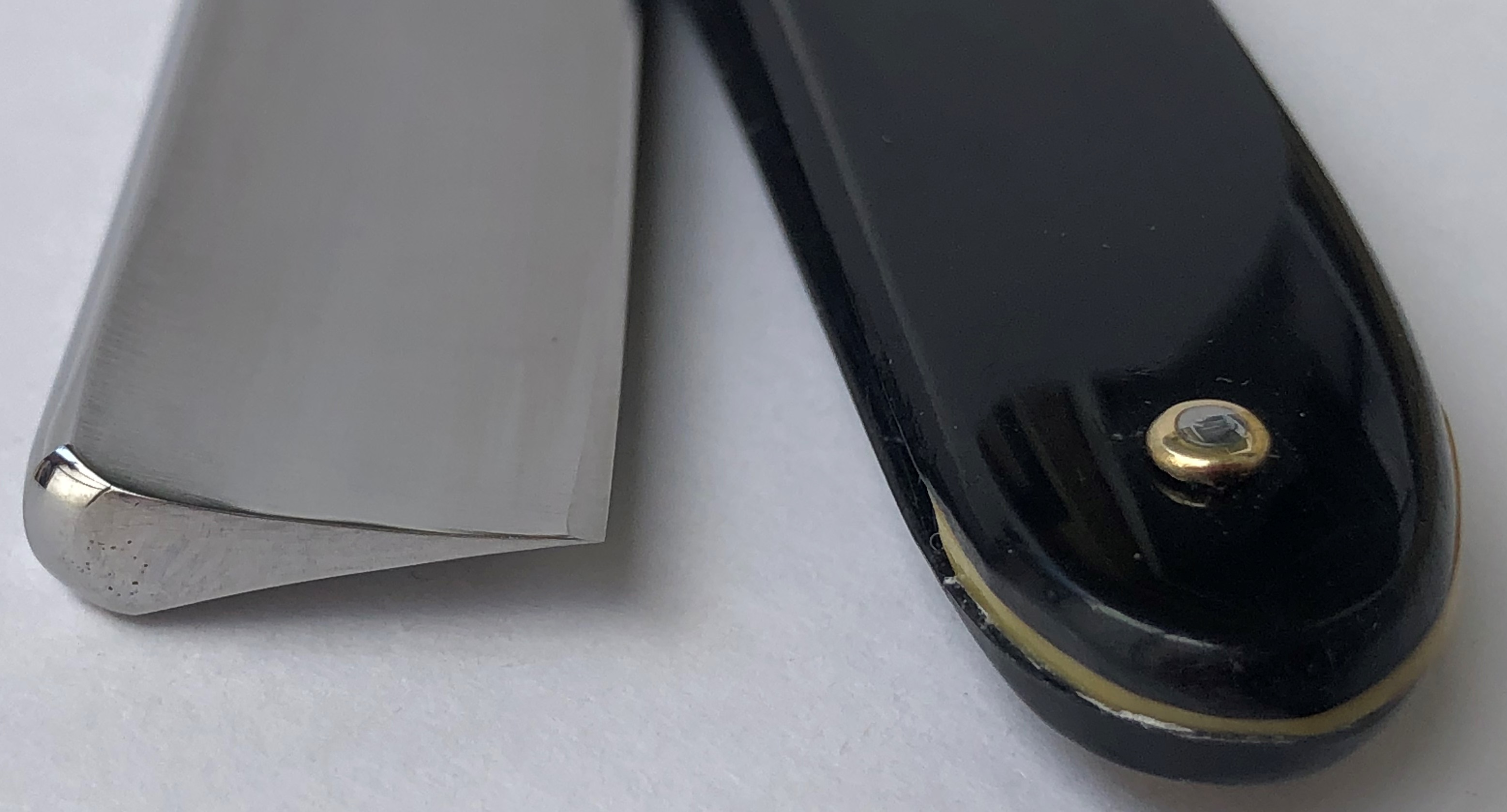 Бритва без следов пользования,но пришлось разобрать, для удаления следов окисления в районе осевого пина.Заменил медную заклепку на двух-цветную втулку,а также добавил внутренние шайбы.Заводская шлифовка и полировка полотна. Идеальная геометрия:кромочка равномерна по всей длине полотна.Очень хороший и недорогой вариант для новичка..