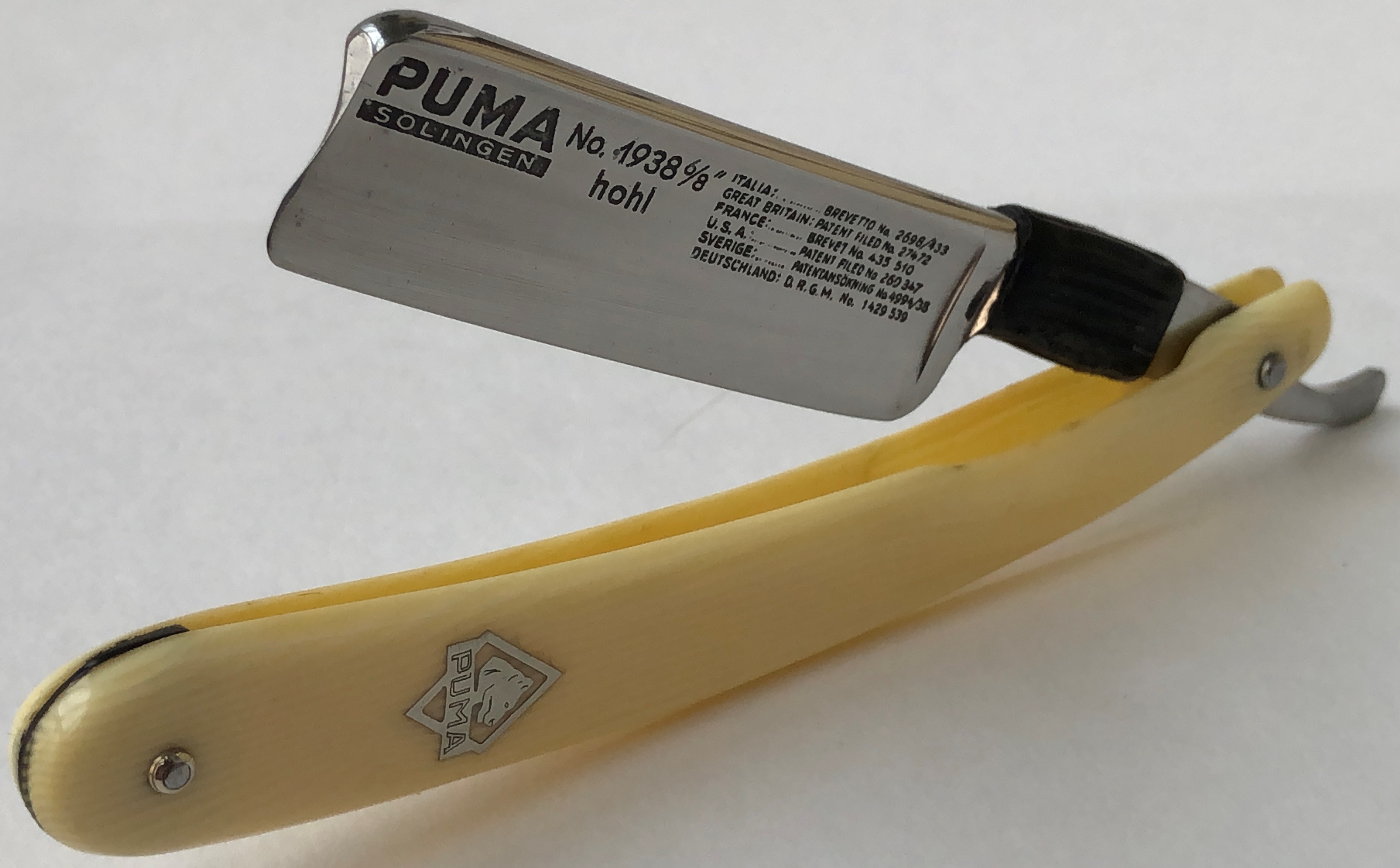 Ширина полотна-21.0 мм. Толщина обушка-5.5 мм. Полная вогнутость. Углеродистая сталь. Испанский носик. Самая топовая и редкая PUMA из всей линейки бритв этой известной фирмы. Без активных следов пользования.Возможно просто была один раз заточена и все.Заводская шлифовка полотна лезвия.Была разобрана, для удаления следов окисления металла, в районе осевого пина.Родные пины были перебраны и заново установлены.Оригинальная резинка в хорошем состоянии и еще послужит довольно долго. Была проклеена для надёжности.Под осевой были добавлены внутренние шайбы.Идеальная геометрия полотна:кромочка равномерна по всей длине и еле заметна. Фирменный бакелитовый кейс в комплекте! Бритва заточена и лично протестирована. Все на очень высоком уровне, чем в принципе и известны эти бритвы. Цена-45500 р с доставкой.b]ПРОДАН[/b] Spoiler Show