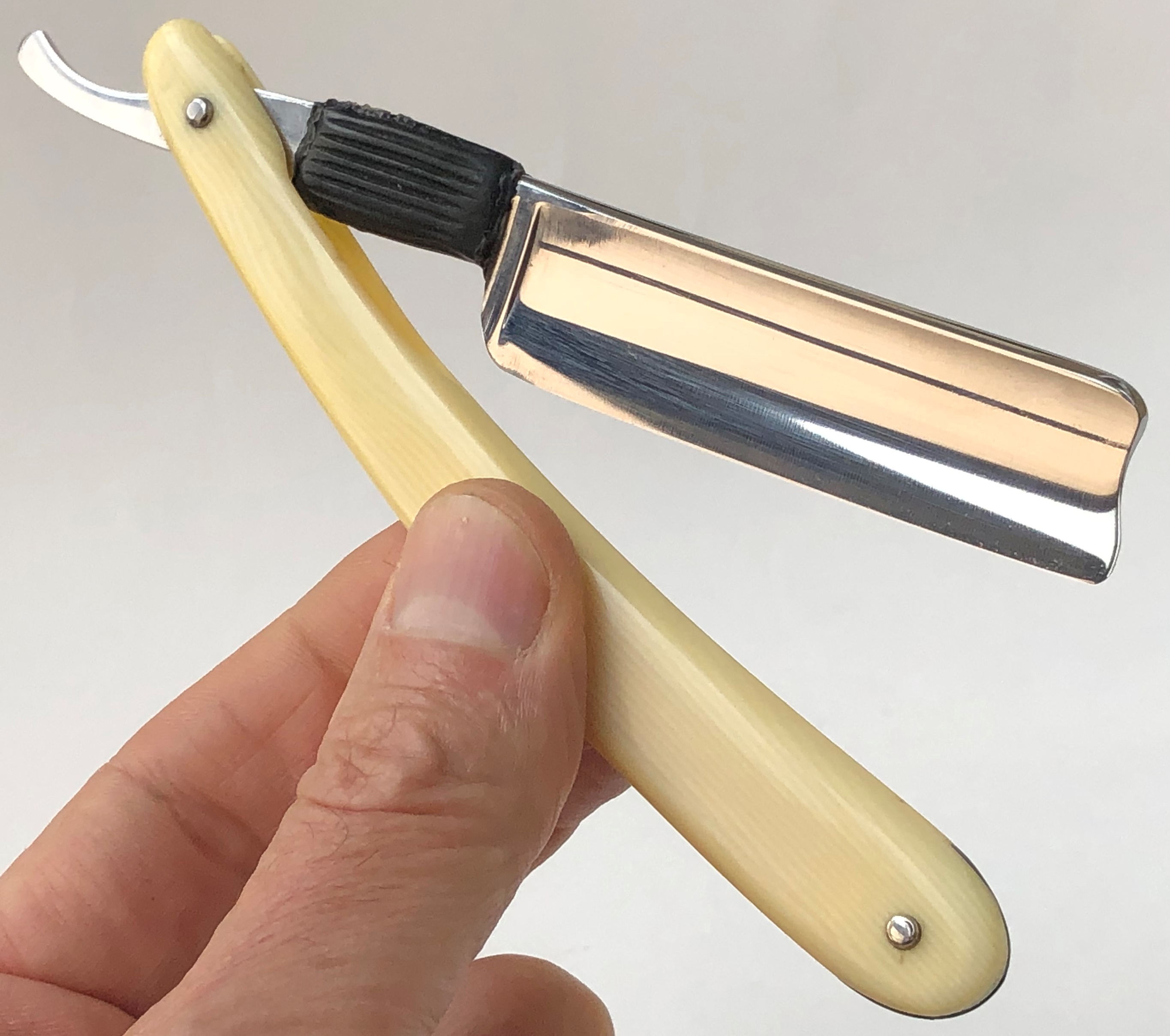 Ширина полотна-18.0 мм. Толщина обушка-5.0 мм. Полная вогнутость. Углеродистая сталь. Первая половина прошлого века. Привел в порядок старушку. Еще послужит долго.Перешлифовал и переполировал клинок. Замена пинов и внутренних шайб.Очень хорошее , рабочее состояние.Кромочка равномерна по всей длине. Красивая пластиковая ручка,"под черепаху".Удобная форма лезвия для новичка прежде всего, а также пойдет любому пользователю. Заточена и готова к бритью. Цена-9500 р с доставкой.ПРОДАН Spoiler Show