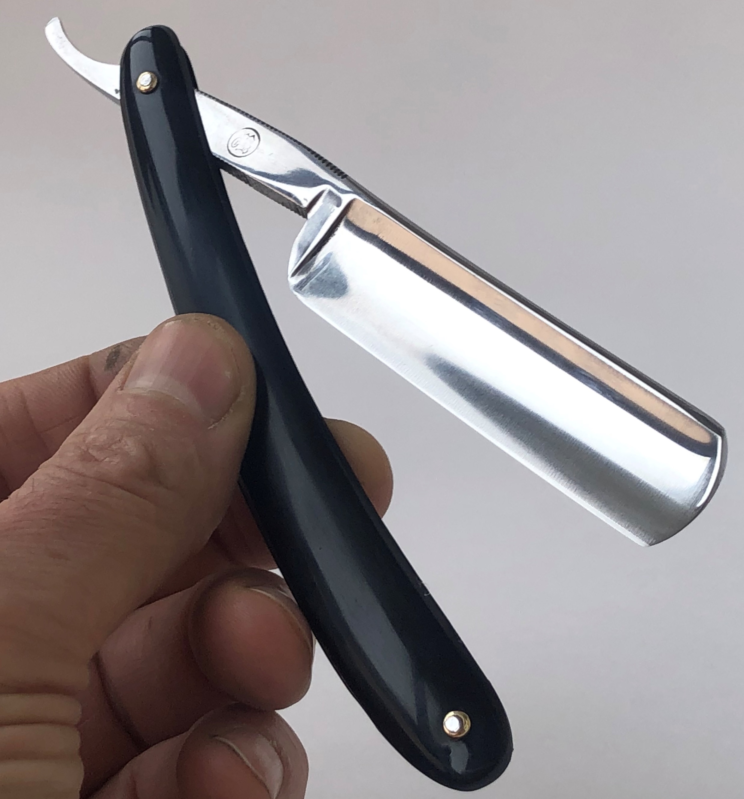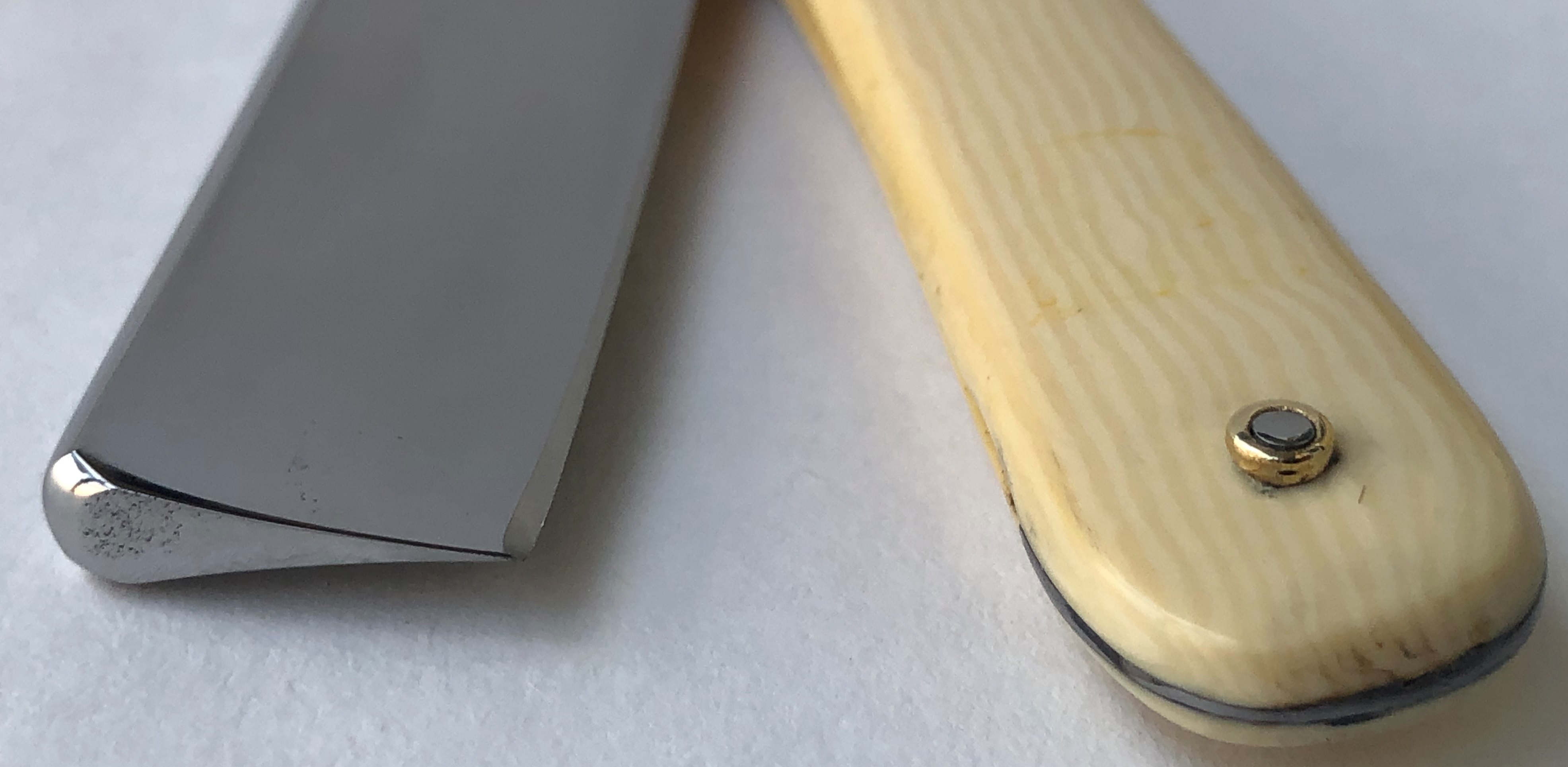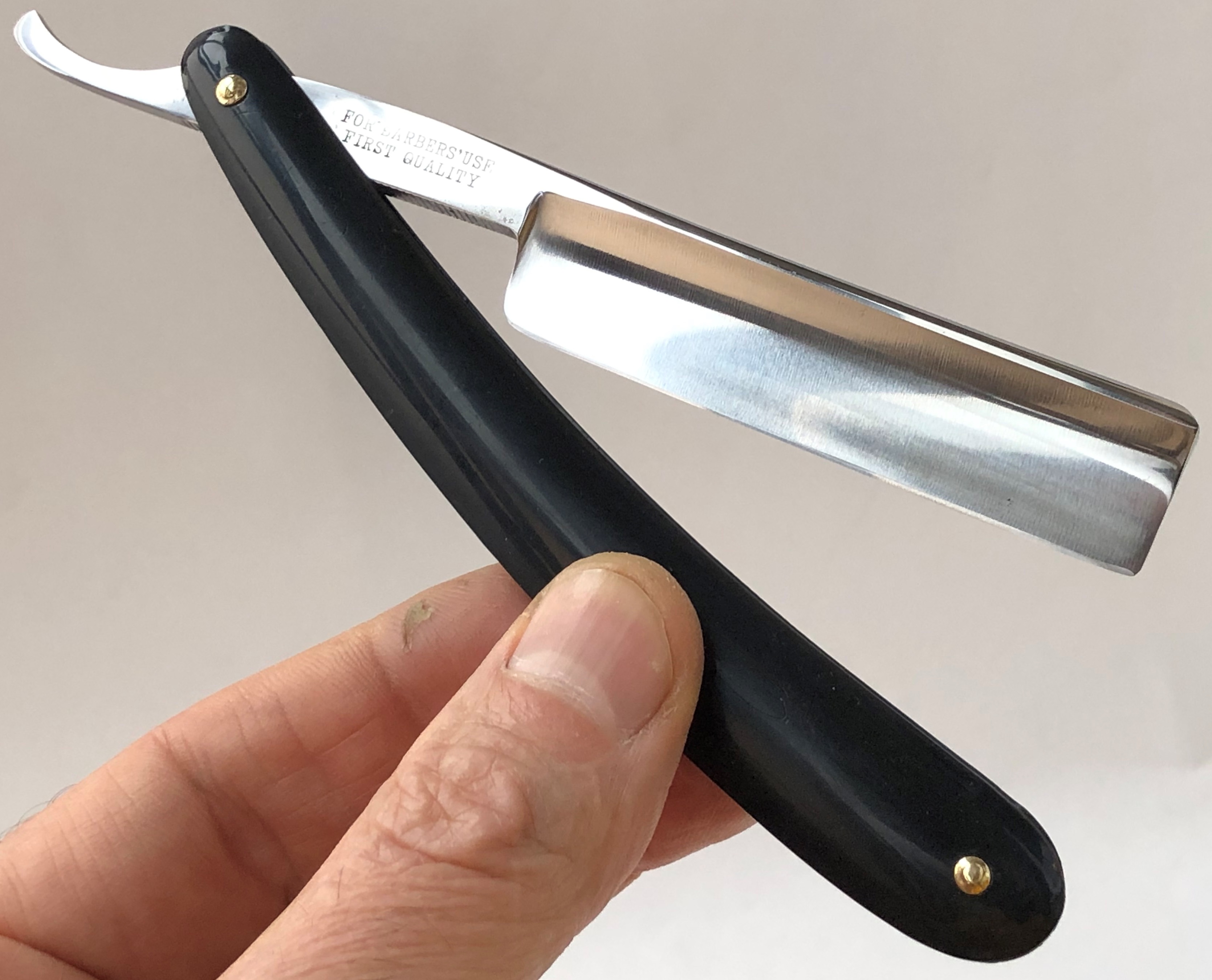 Клинок был восстановлен от следов износа. Немного скорректировал утОчку обушка, перешлифовал и умеренно отполировал.Скошенная пятка, по всей видимости бритва ранее использовалась барберами.Кромочка идеально ровная.Поменял пины на втулки и добавил внутренние шайбы. Одна плашка немного деформирована, но совершенно не критично, и лезвие закрывается по центру.В общем и целом очень приличная, с шикарной сталью старушка, получившая вторую жизнь. И абсолютно недорогая, по цене обычной ординарной непользованной советской бритвы. Особенно подойдет для новичка или любому товарищу, для кого важнее прежде всего качество самого инструмента.