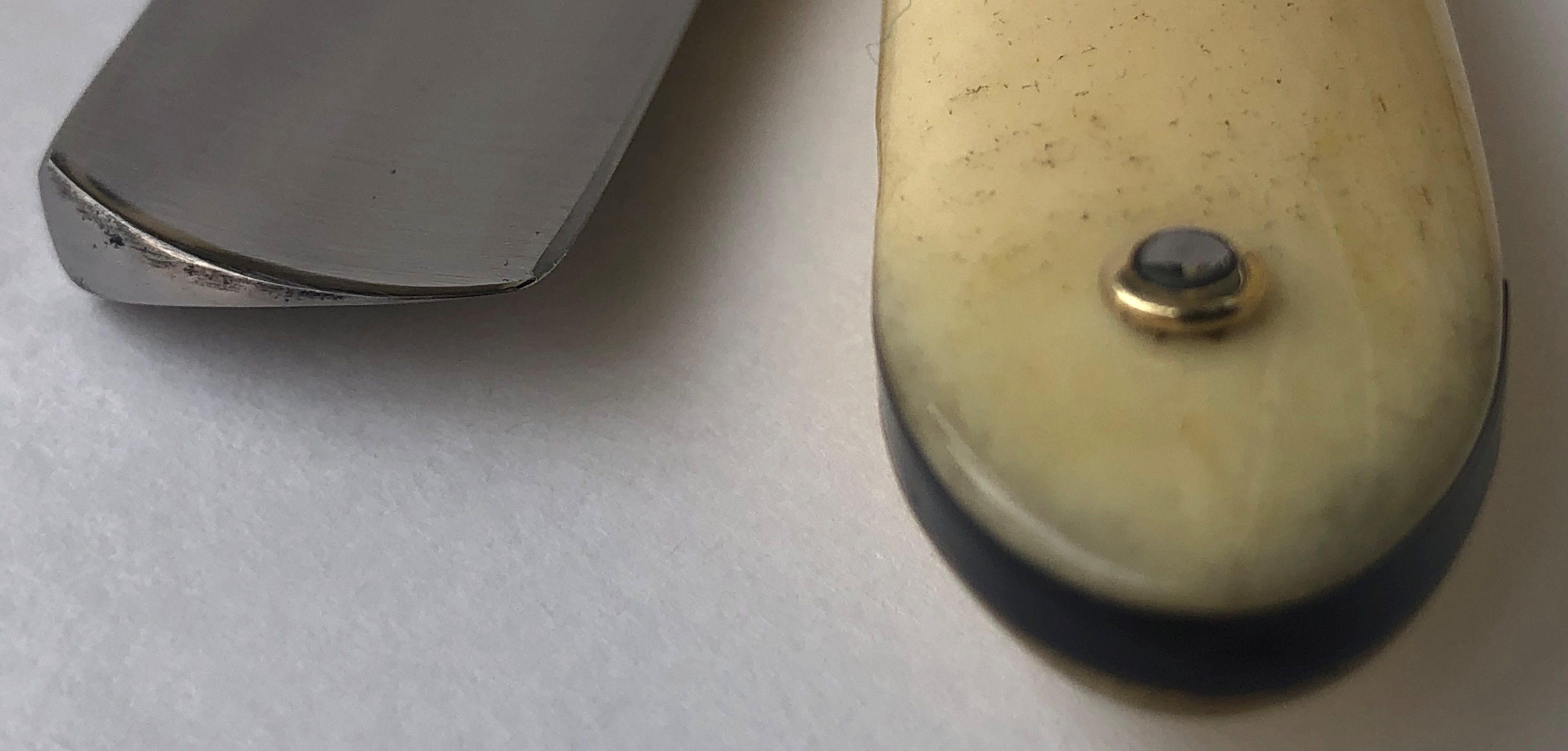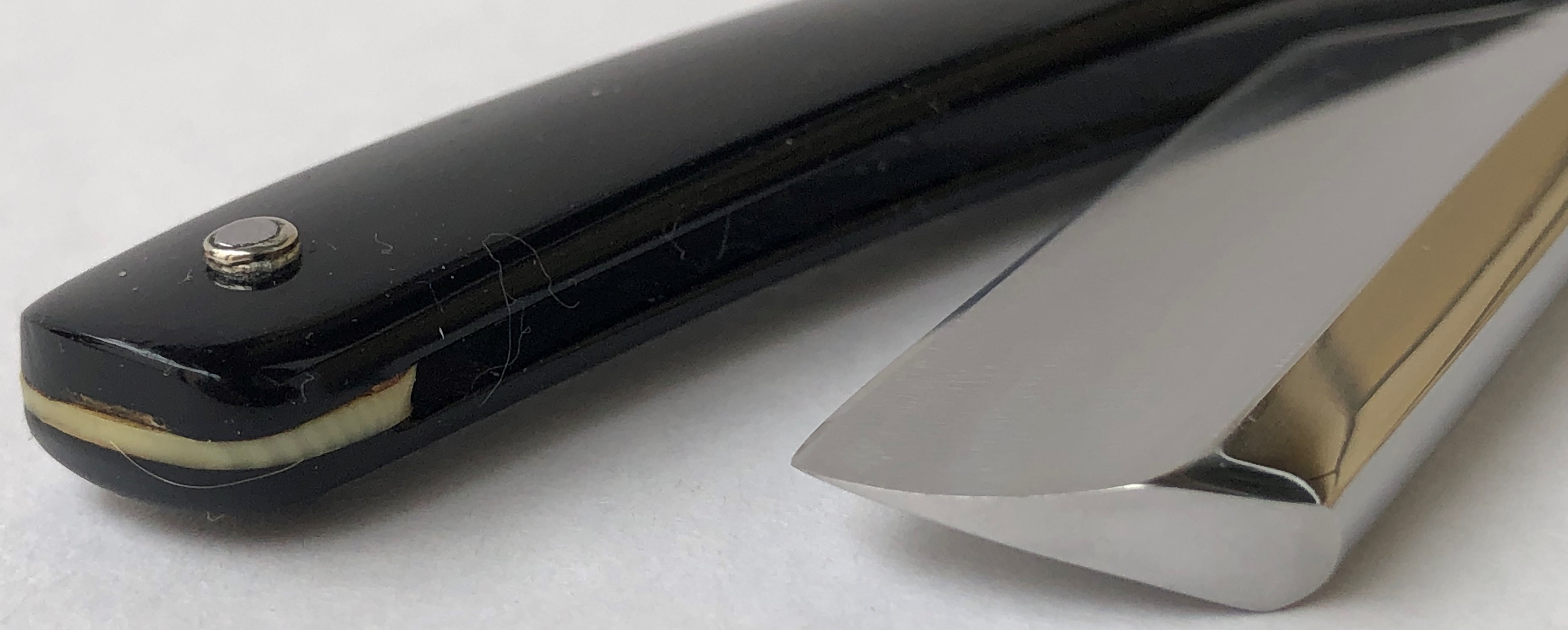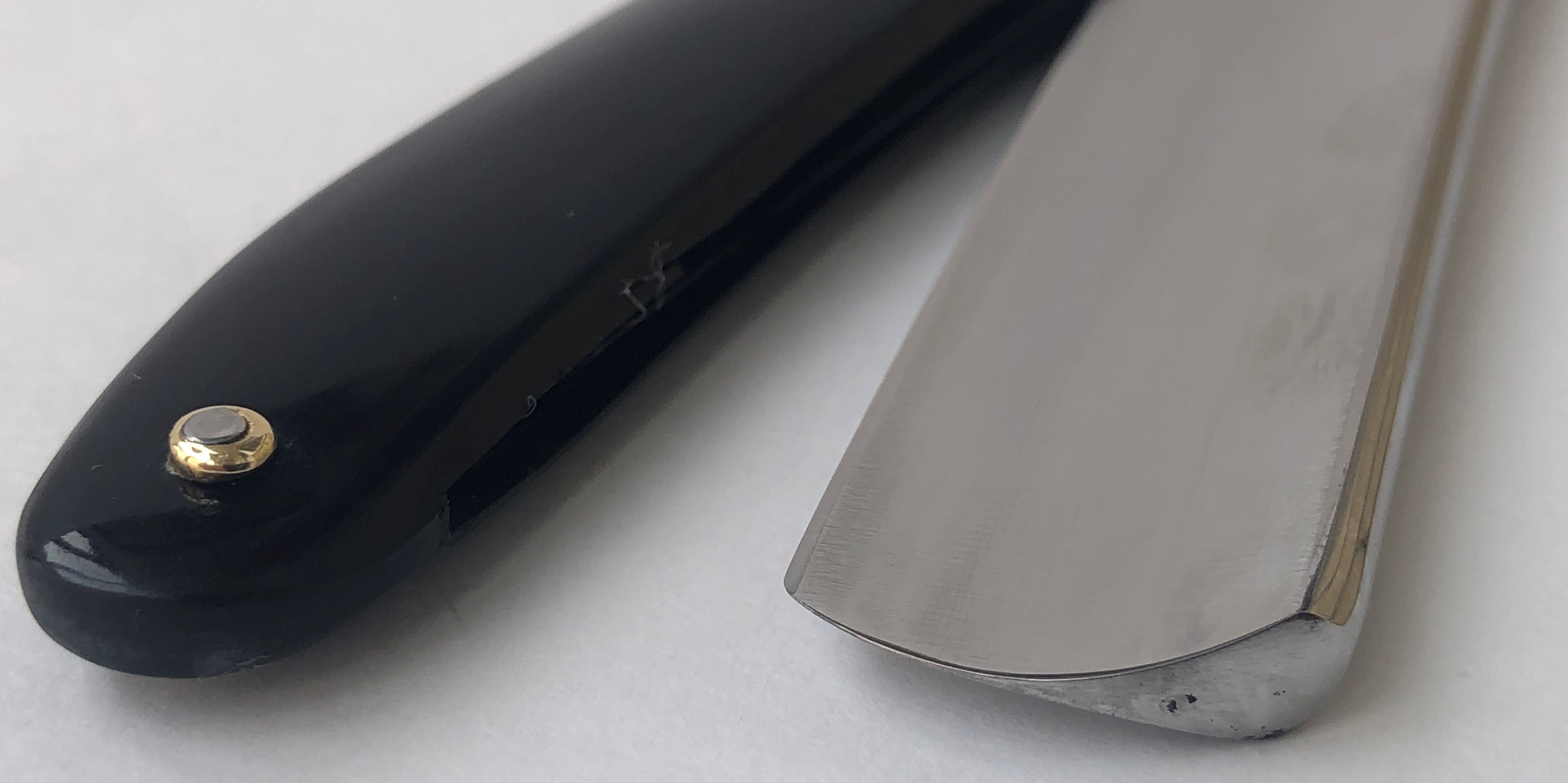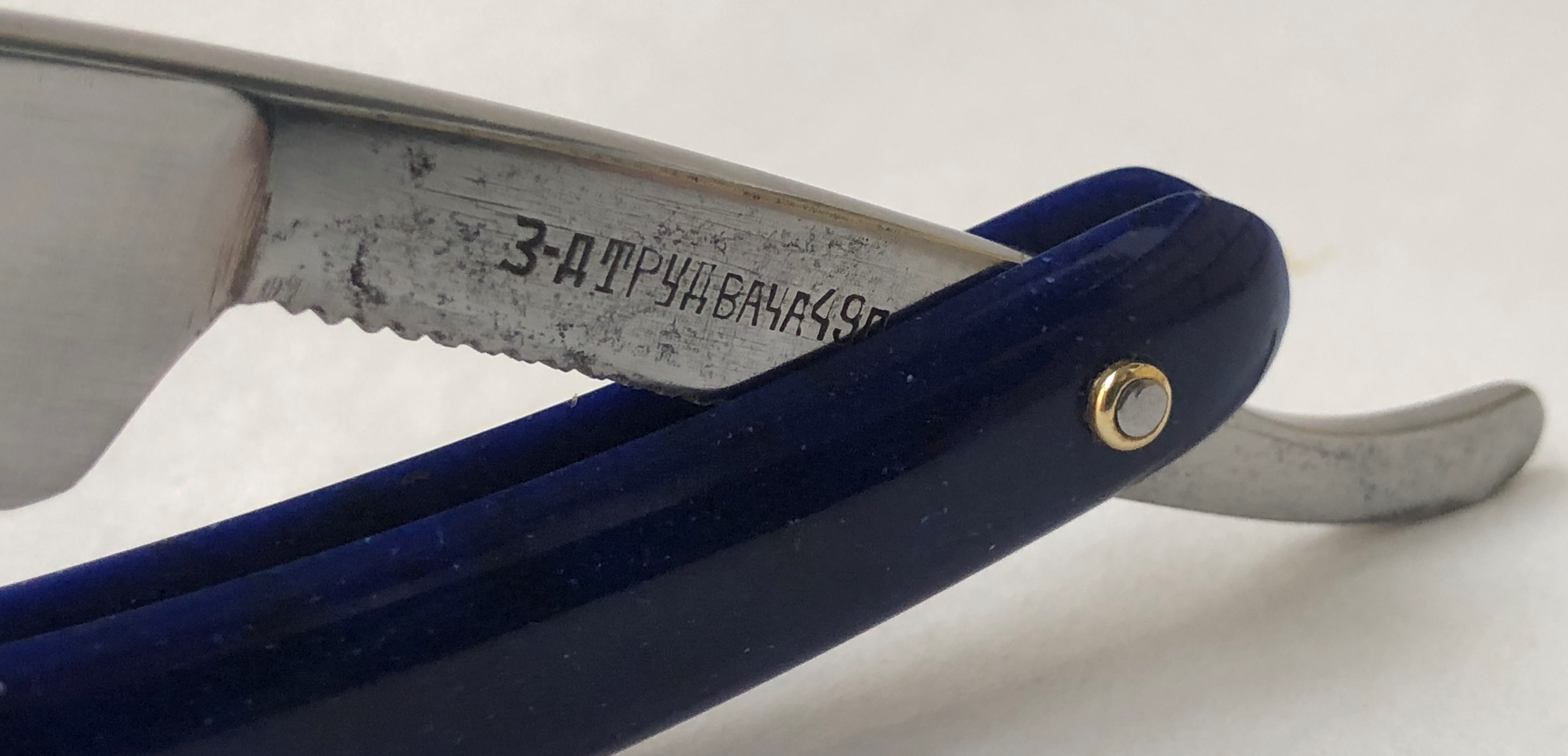 Клинок был восстановлен от следов износа. Немного скорректировал утОчку обушка, перешлифовал и умеренно отполировал.Скошенная пятка, по всей видимости бритва ранее использовалась барберами.Кромочка идеально ровная.Поменял пины на втулки и добавил внутренние шайбы. Одна плашка немного деформирована, но совершенно не критично, и лезвие закрывается по центру.В общем и целом очень приличная, с шикарной сталью старушка, получившая вторую жизнь. И абсолютно недорогая, по цене обычной ординарной непользованной советской бритвы. Особенно подойдет для новичка или любому товарищу, для кого важнее прежде всего качество самого инструмента.