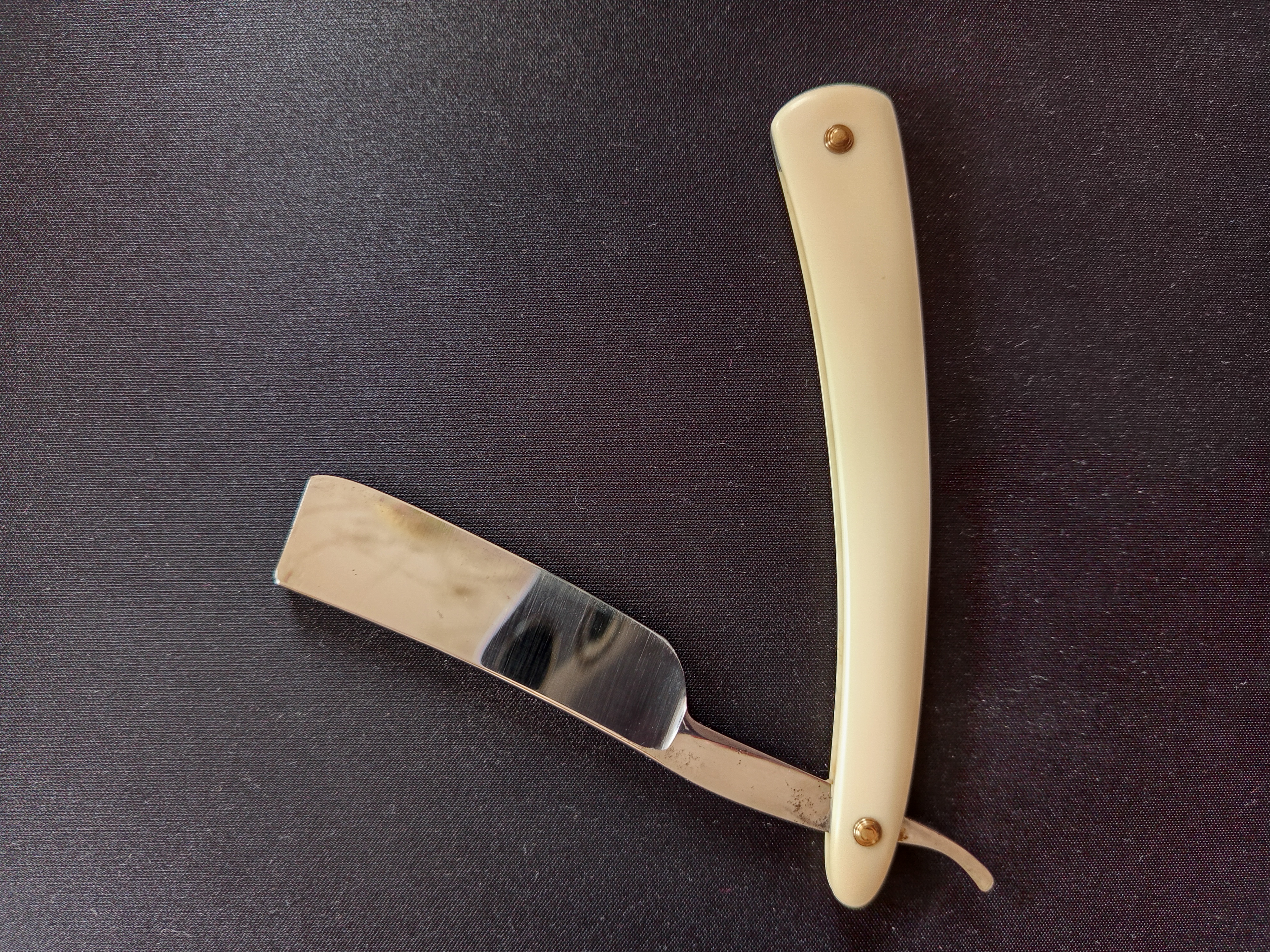 Приобретена мной на форуме несколько лет назад, в ходе эксплуатации поменял треснувшую ручку под зуб мамонта + клинышек олово. Инструмент только что вернулся с заточки, мной не использовался.