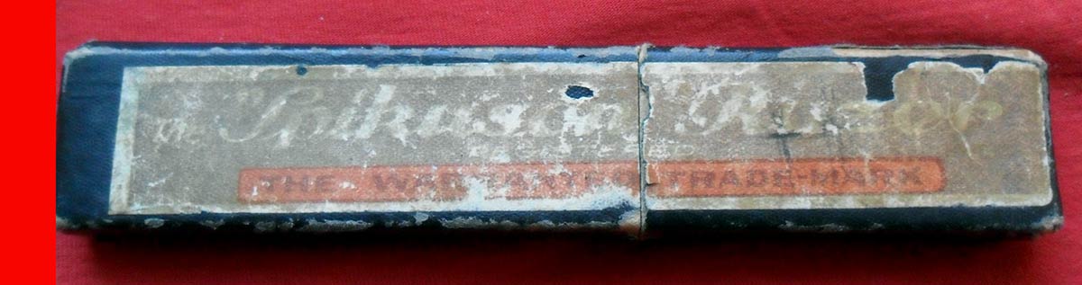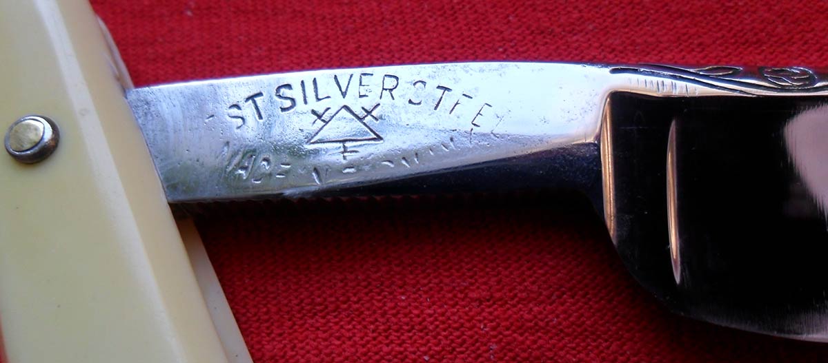 Надпись на обратной стороне эрля - BEST SILVER STEEL MADE IN GERMANY. Слово "Germany" затерто, но прочесть можно. Ручка и пины родные. Сталь на бритве действительно хорошая - достаточно просто точится. Ширина бритвы 17 мм, толщина обуха 4,5 мм. В комплекте также родной футляр. Не в самом лучшем виде, но вполне живой.