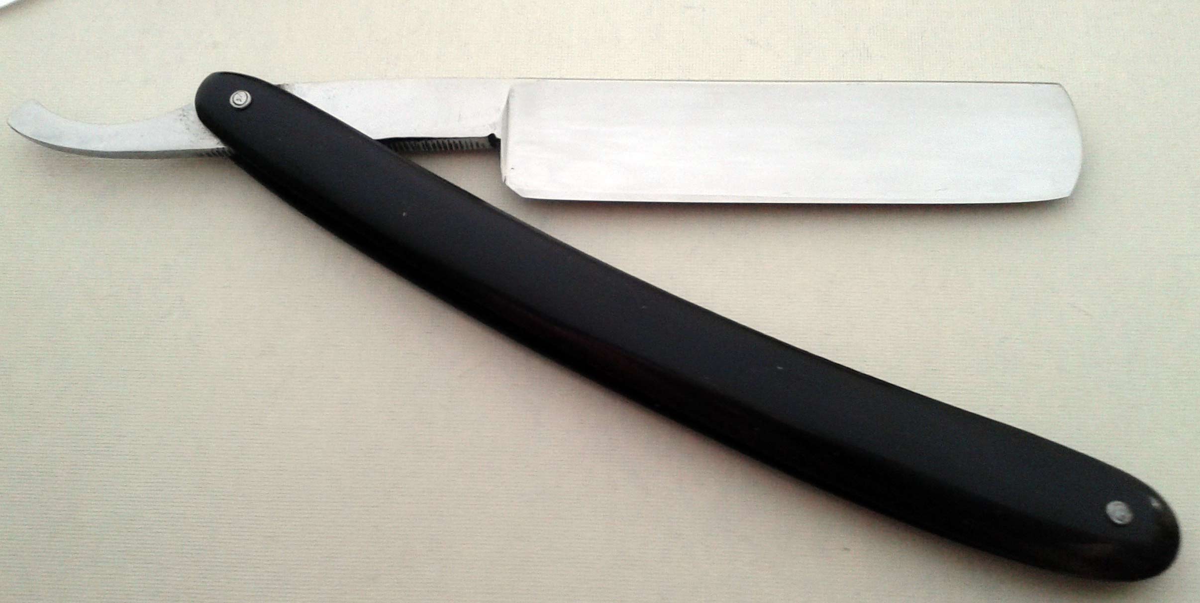 Видимо, бритва от интернациональной (Англия-Германия) фирмы типа KROPP. Ручка из целлулоида, в хорошем состоянии. На полотне имеются "следы времени". Возле обушка канавка неизвестного происхождения. Скорее всего - так называемый "заковыш", образовавшийся при изготовлении металлической заготовки. В любом случае, функциональность бритвы никак не затрагивает. Заточена и полностью готова к бритью. Ширина полотна 16 мм, толщина в обушке 4 мм.