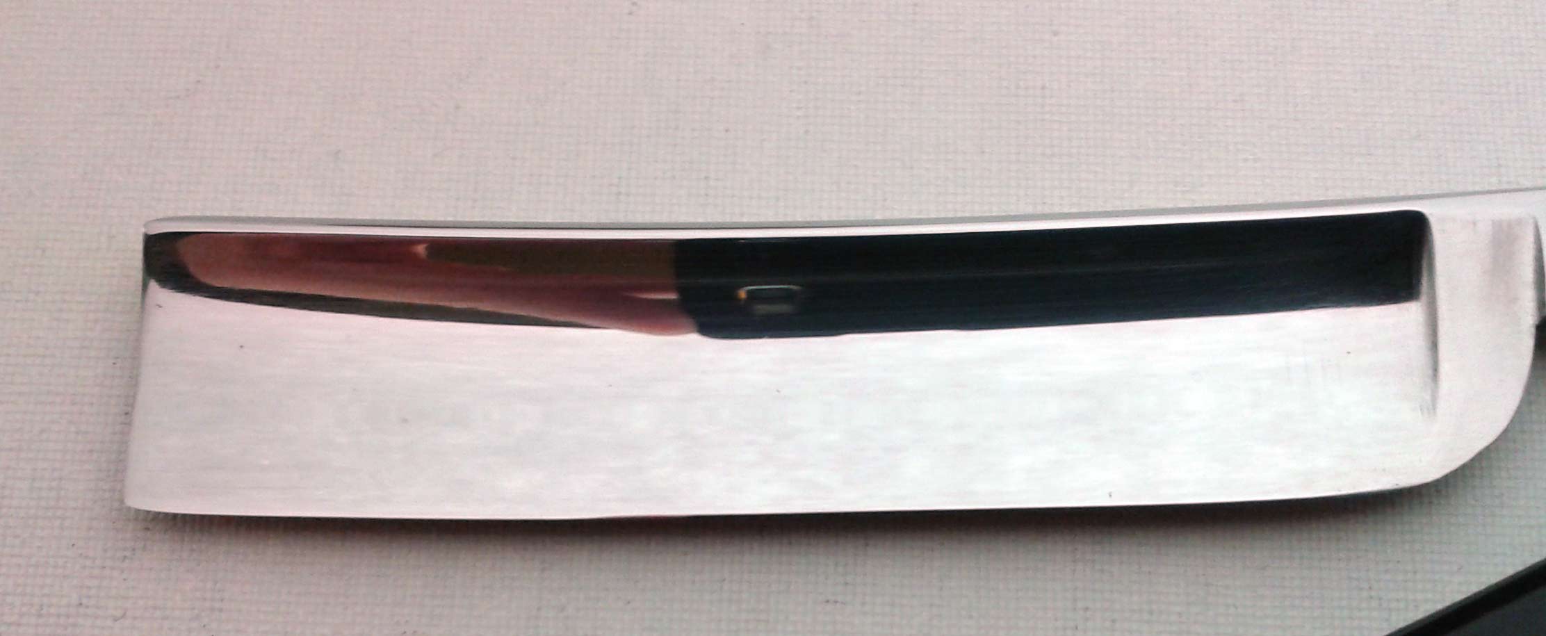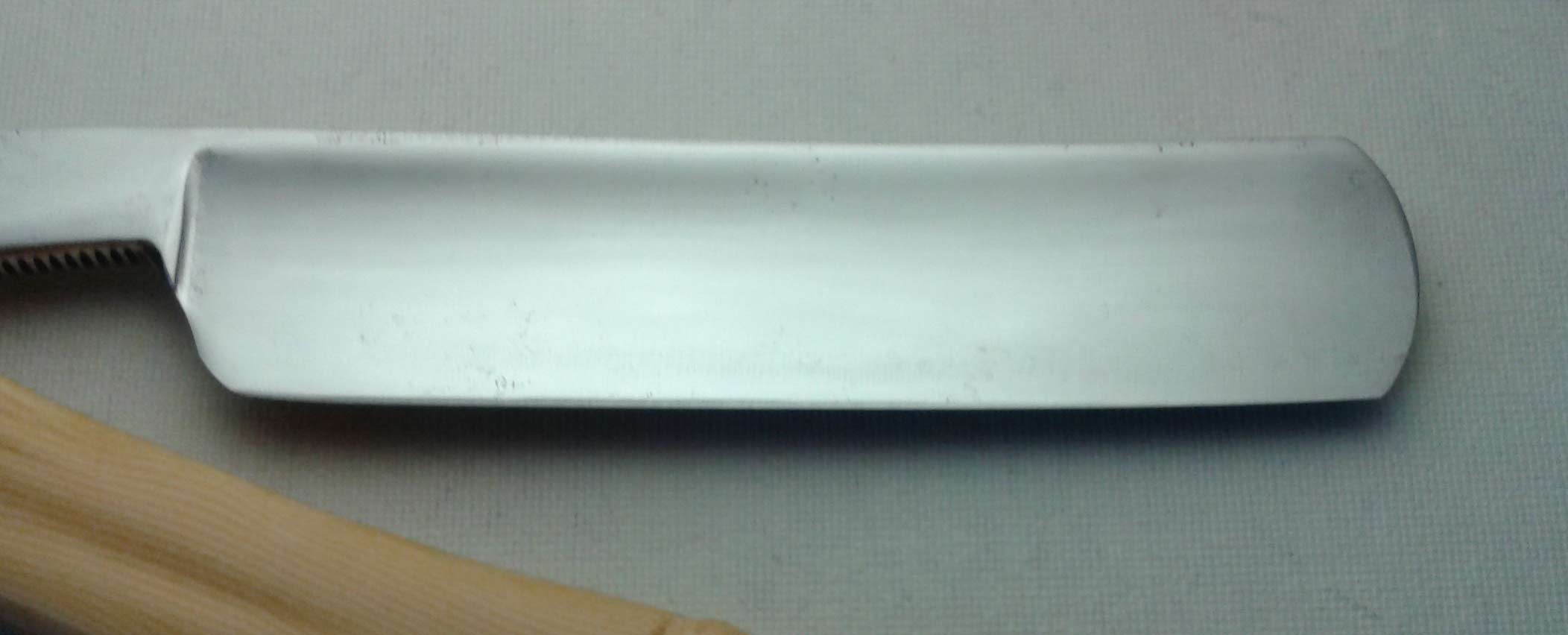 Видимо, бритва от интернациональной (Англия-Германия) фирмы типа KROPP. Ручка из целлулоида, в хорошем состоянии. На полотне имеются "следы времени". Возле обушка канавка неизвестного происхождения. Скорее всего - так называемый "заковыш", образовавшийся при изготовлении металлической заготовки. В любом случае, функциональность бритвы никак не затрагивает. Заточена и полностью готова к бритью. Ширина полотна 16 мм, толщина в обушке 4 мм.