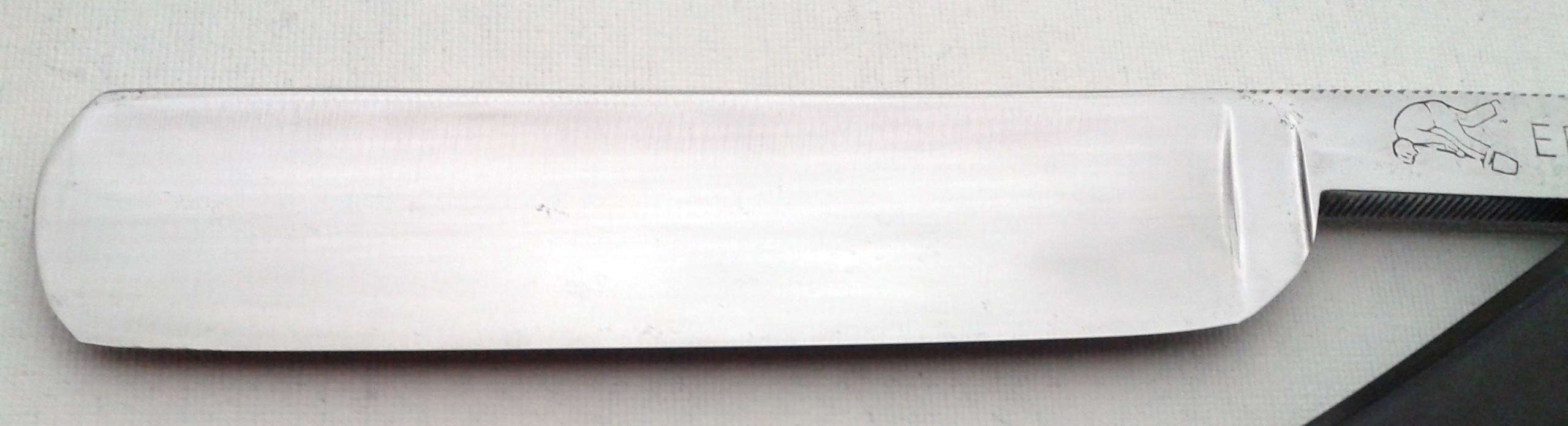 Довольно старый холлоу граунд - по форме хвостовика и надписи можно говорить о конце XIX-начале XX века. А если судить по инфе из http://britva.ru/forum/viewtopic.php?f= ... ilit=Allen" onclick="window.open(this.href);return false;, то бритва произведена до 1890 года. Ручка - эбонит, в отличном состоянии, есть коричневый "налет времени", клинышек - металл. Заточена и полностью готова к бритью. Ширина полотна 19 мм, толщина в обушке 5 мм.