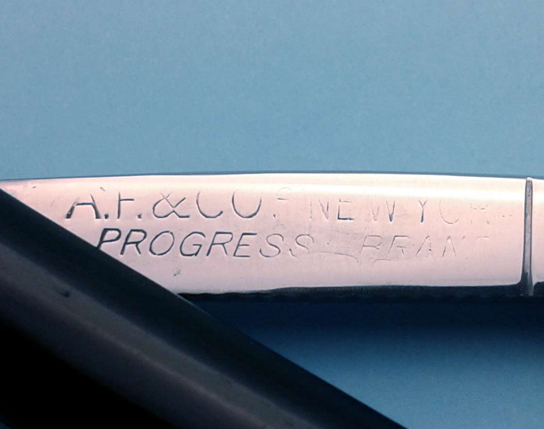 Обратная сторона эрля: A.P.&CO NEW YORK PROGRESS BRAND Ручка - эбонит, в отличном состоянии, родная. Бритва точилась немного и аккуратно. Коррозии также было немного, так что можно говорить, что бритва довольна близка к своему заводскому виду. Заточена и полностью готова к бритью. Ширина полотна 13.5 мм, толщина в обушке 4 мм. В комплекте родной футляр в приличном состоянии.